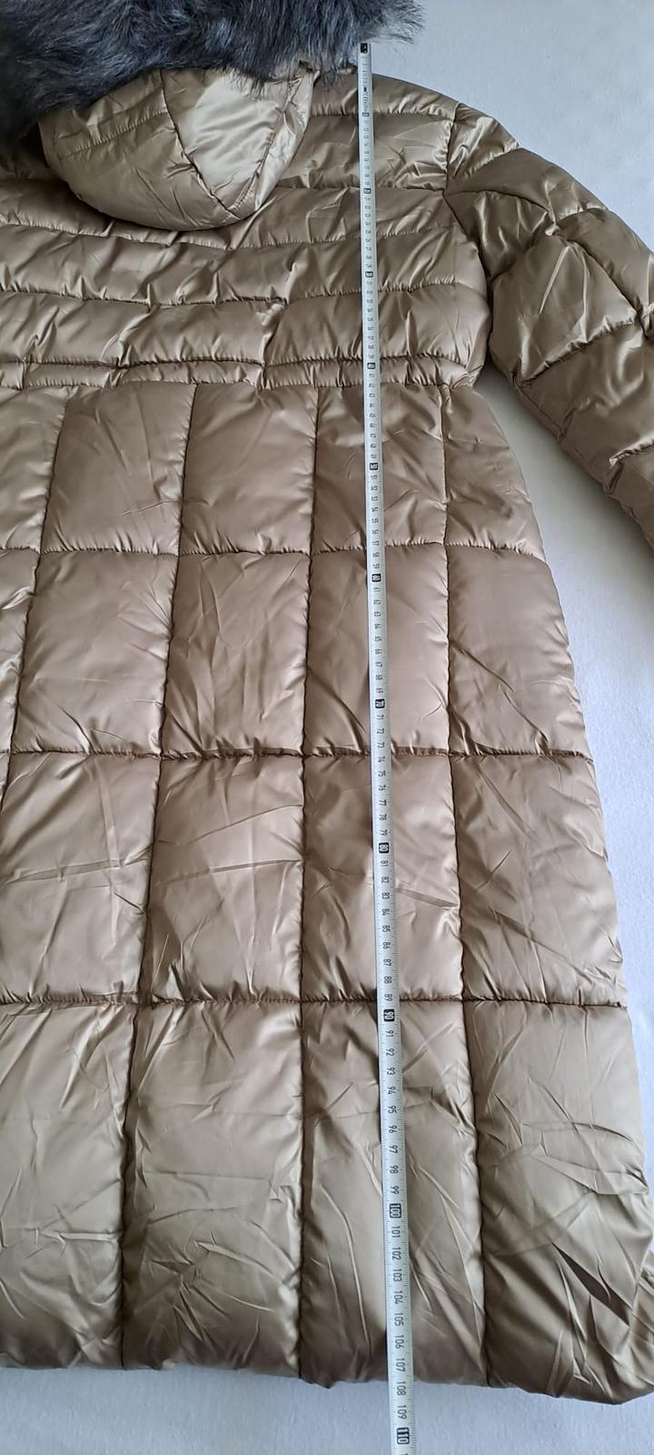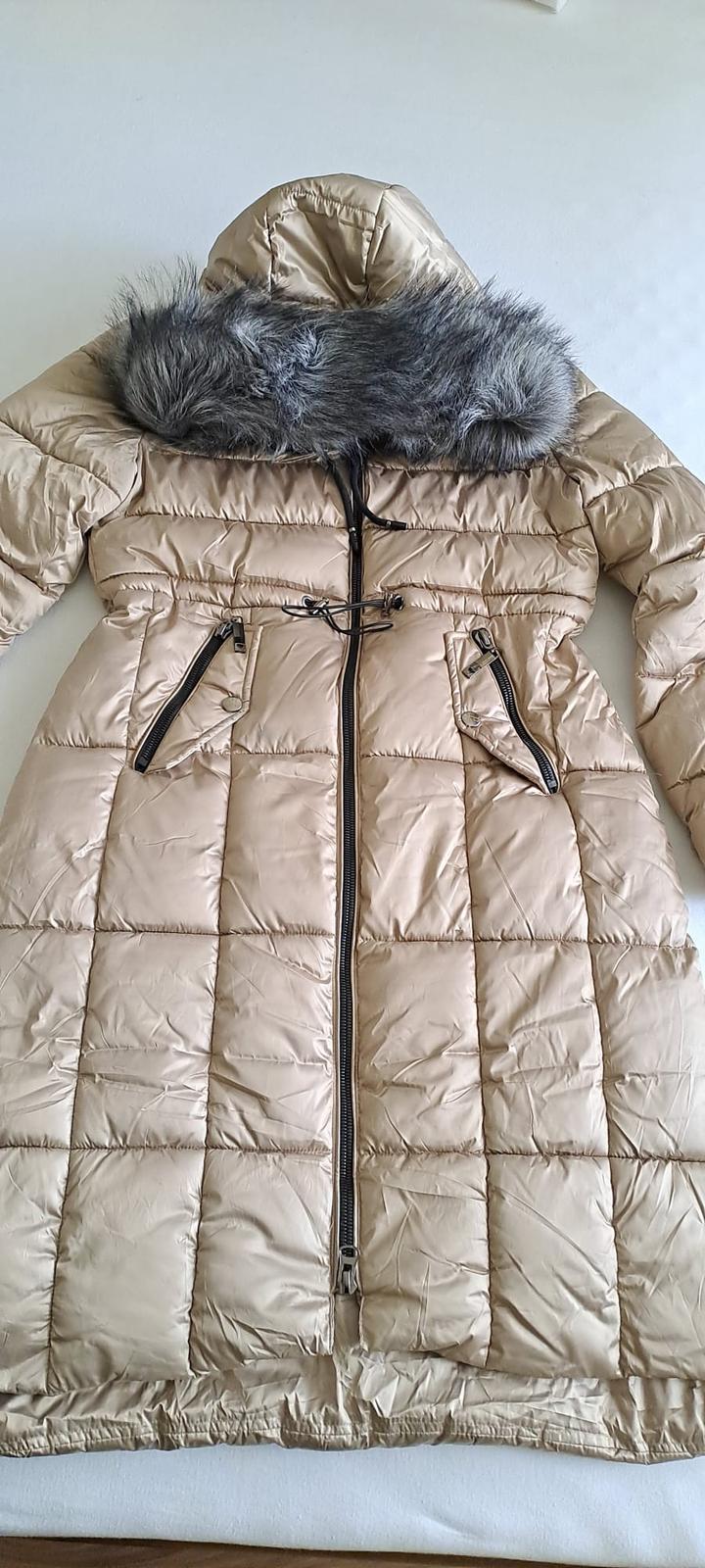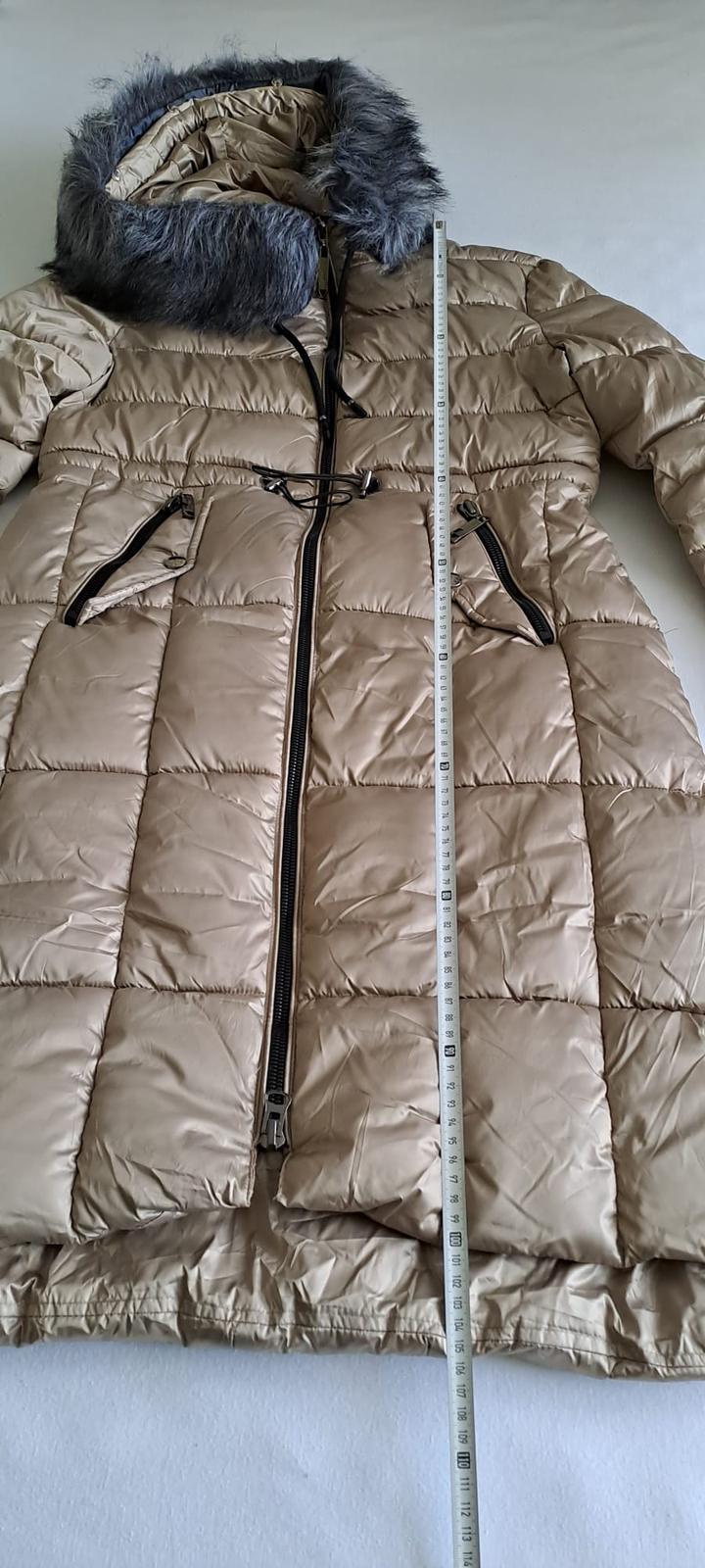 Super kúsok, zopár krát vzatá. Kožušina sa dá odopnúť, v páse pomocou nastaviteľných gumičiek vytvarujete postavu. Ale dá sa nosiť aj ako rovný strih, bez oťahovania v páse. Ba rukávoch patenty. Super sedí, neoľutujete. Veľkosť 42-44. Pozrite rozmery na fotkách. Značka S'West.