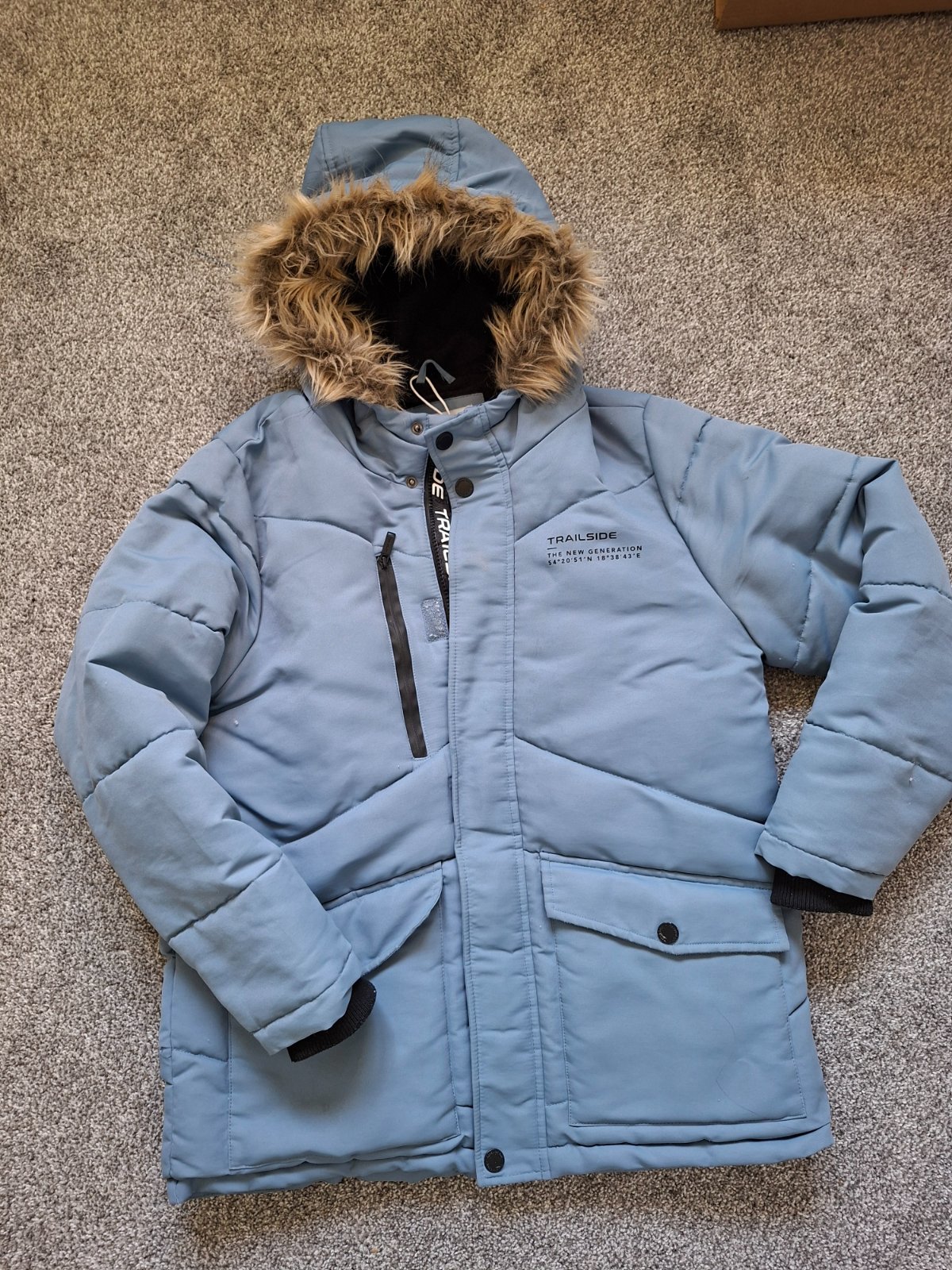 nosená 1 sezónu, veľmi dobrý stav, len na ľavom vrecku 2 dierky, inak super stav; farba je čierna, môj mobil zle fotí čiernu; materiál je vodoodpudivý; kožušina na kapuci sa dá odopnúť, syn nosil bez