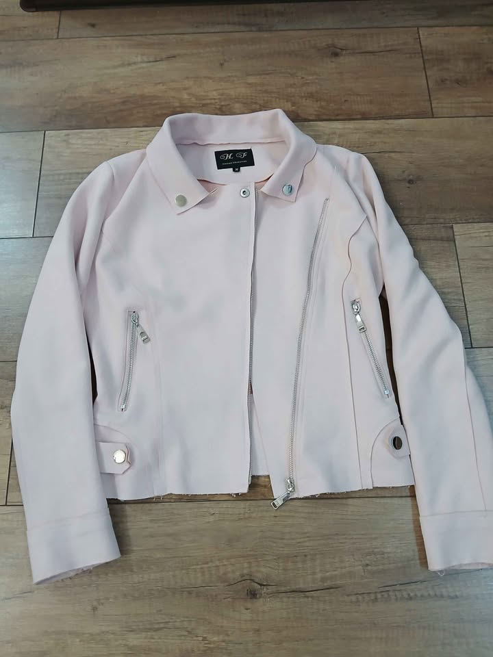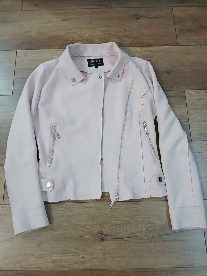 Predám pár krát oblečenú bundicku pudrovej farby, imitácia brusenej kože, veľkosť s,