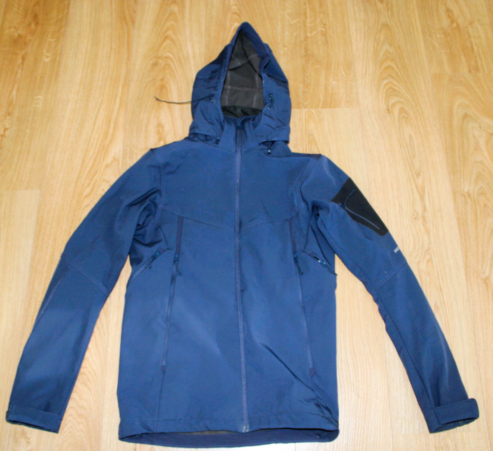 Málo nosená turistická bunda. Je zateplená flisom. Je nepremokavá a neprefúkavá. Jedna šnúrka na priťahovanie kapucne je pokazená. Inak bez poškodení.