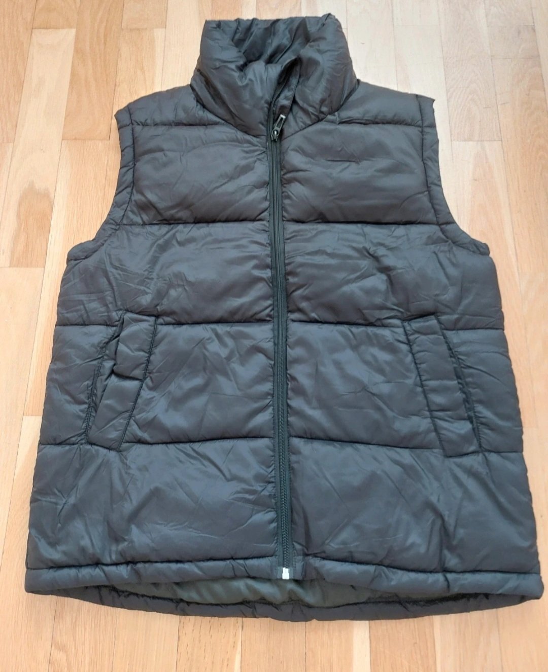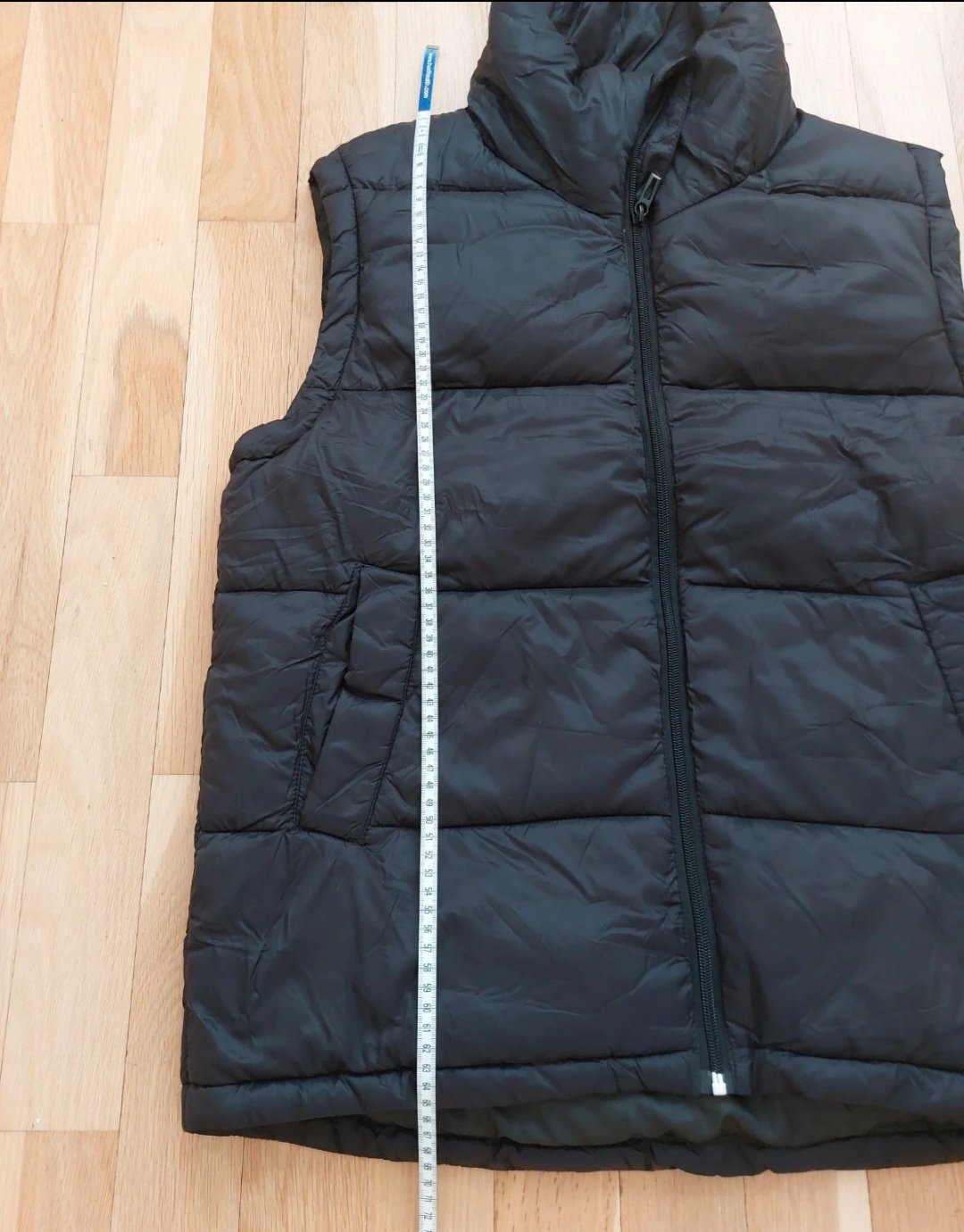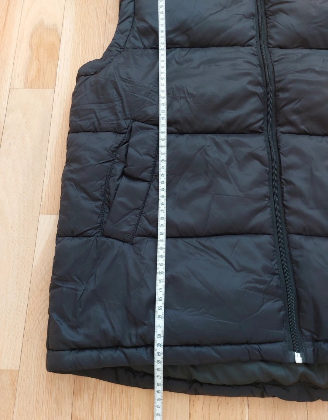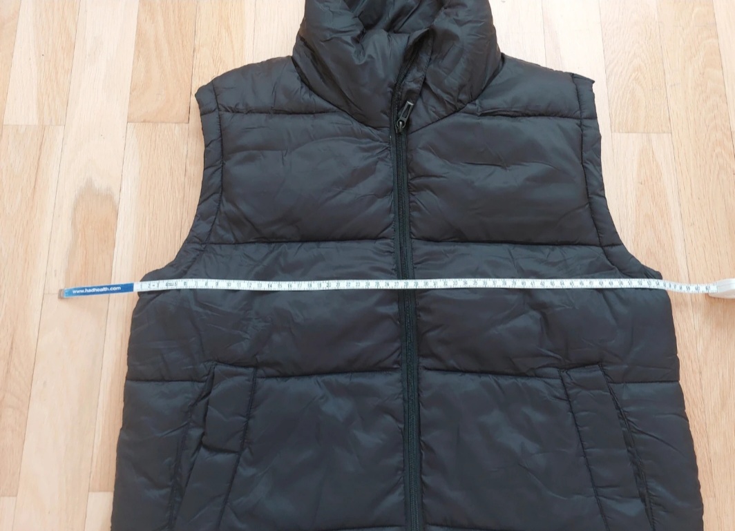 Nová nenosená zateplená vesta v zadu dlhšia v predu kratšia rozmery sú šírka cez prsia 50cm dĺžka v predu 66cm a v zadu 69cm