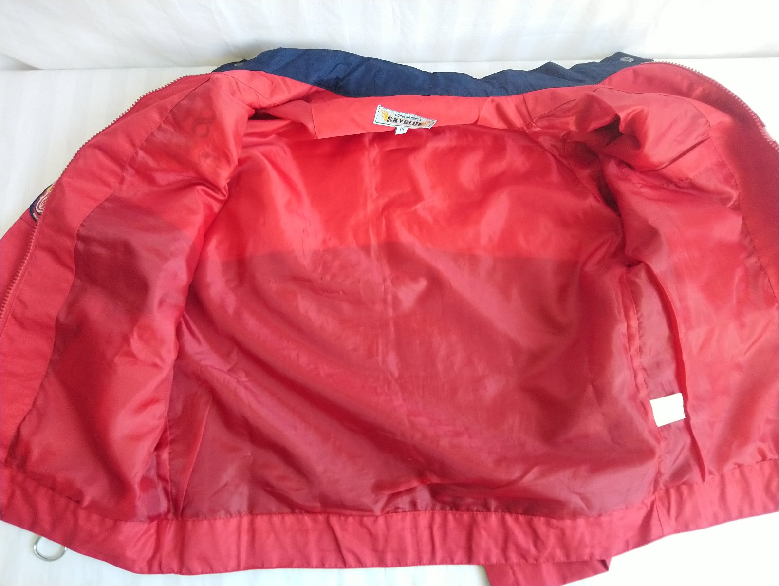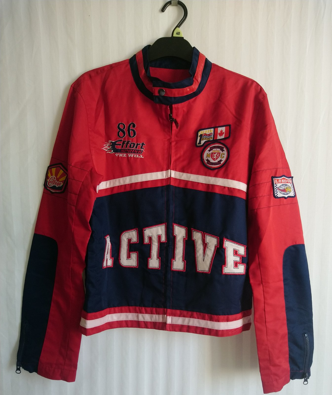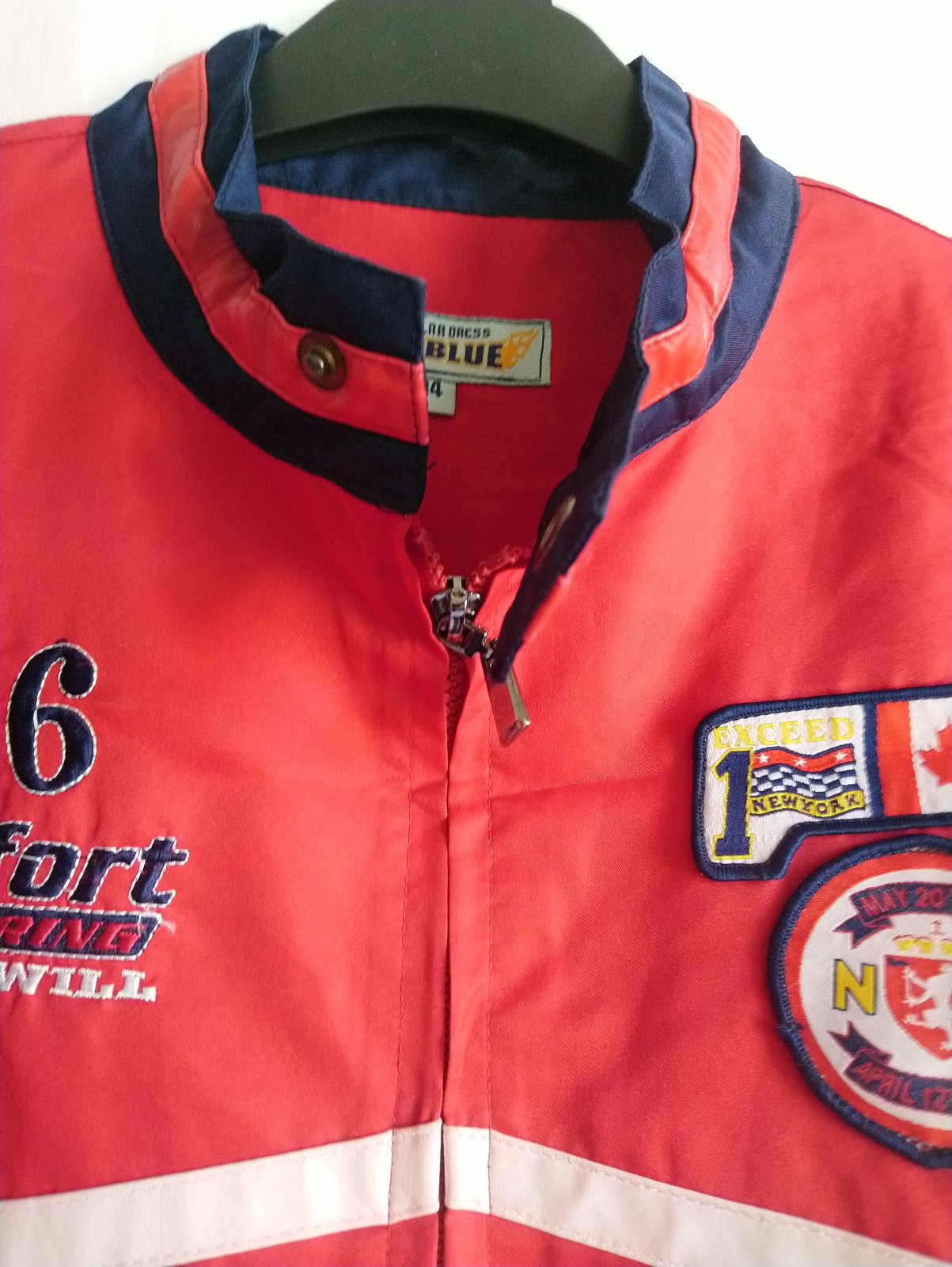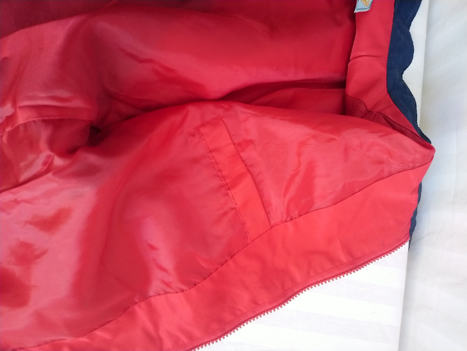 chlapčenská prechodná tenká červeno modrá bunda so zapínaním na zips, golier, bočné vrecká, vnútorné náprsné vrecko, tenučká podšívka,