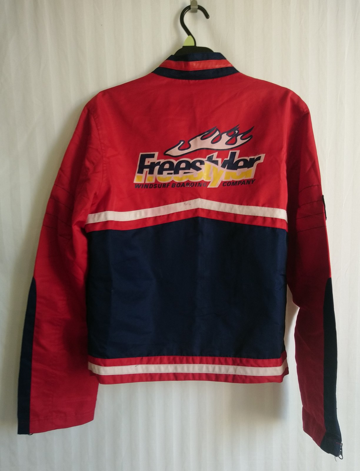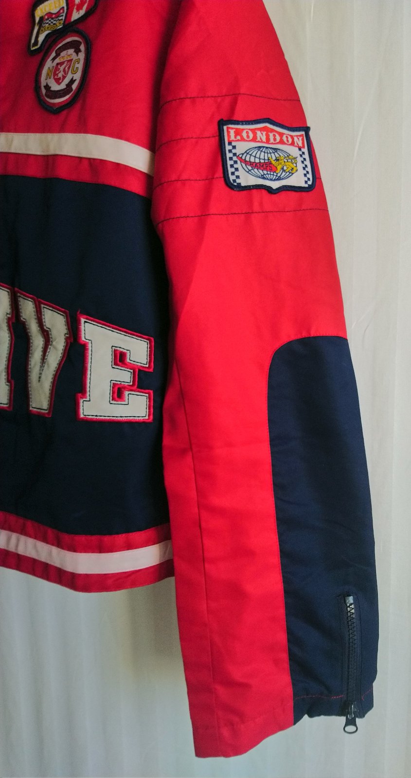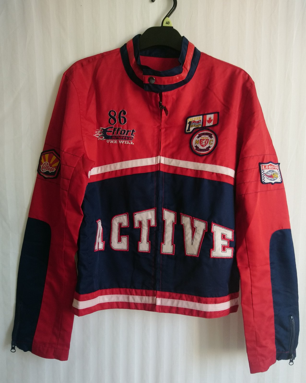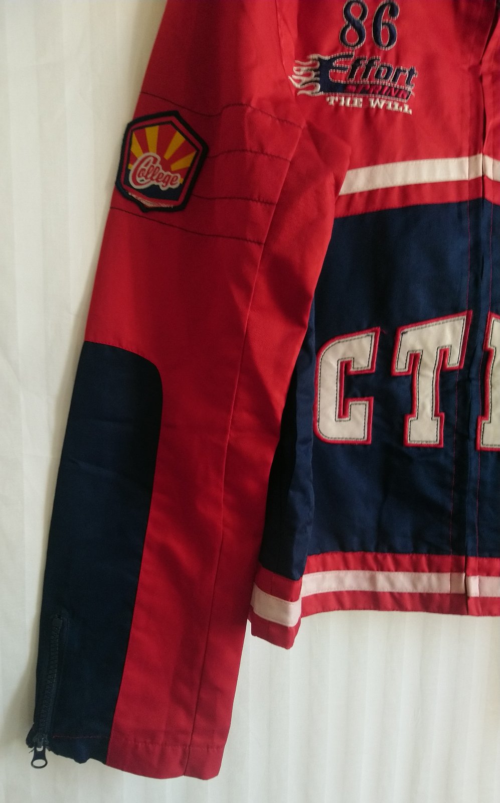 chlapčenská prechodná tenká červeno modrá bunda so zapínaním na zips, golier, bočné vrecká, vnútorné náprsné vrecko, tenučká podšívka,