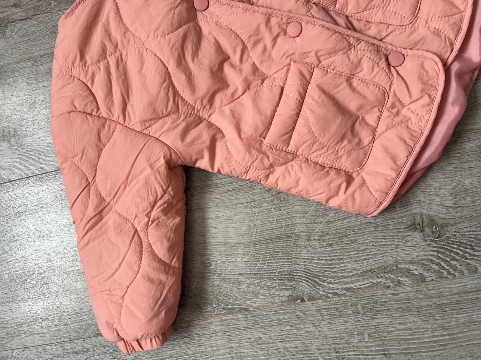 Veľmi jemná lososova farba. Rukáviky sa dajú odzipsovať a je z toho štýlová vestička.