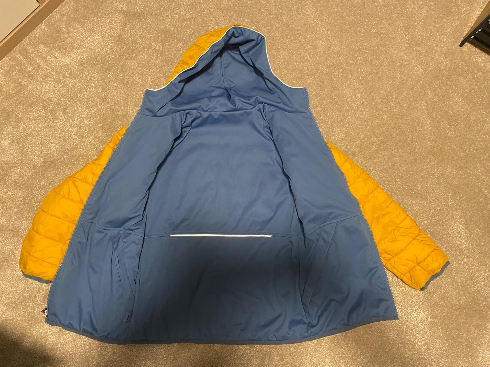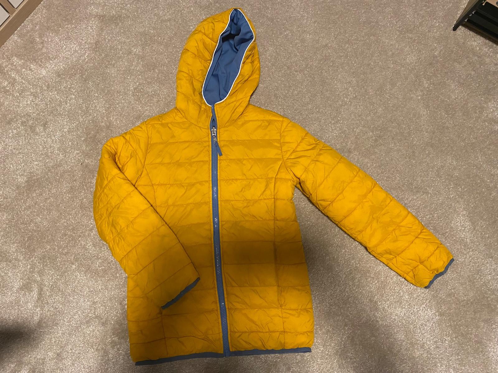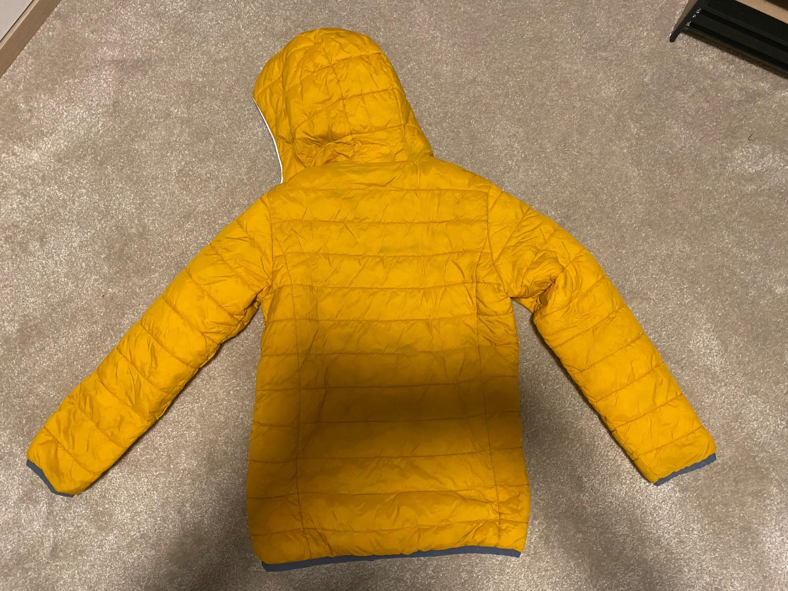 Prechodná obojstranná bunda zn. Tchibo velk.134, modra strana je softshellova, zlta presivana, nosena, vo velmi dobrom stave (zmolky na rukavoch vid foto), farba je v skutocnosti tmavsia zlta ako na foto.