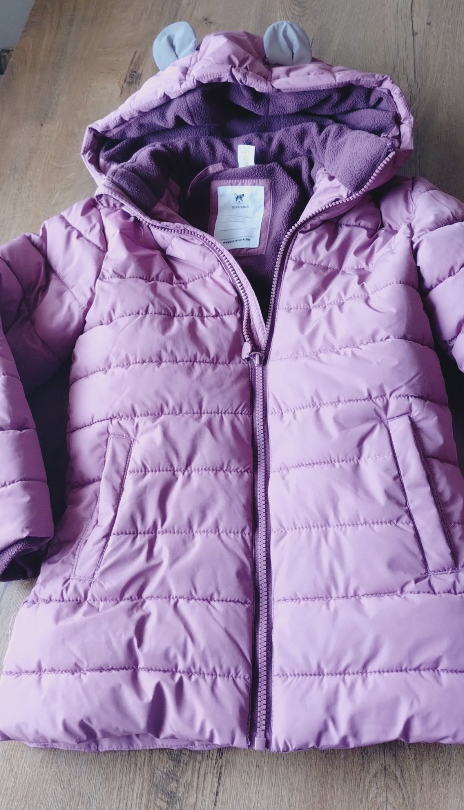 V peknom stave, nosená 1 zimu na striedačku s inými bundami. Kapucka sa dá odopnúť, bunda má reflexné prvky. Je bez poškodenia, len pri fotení som si všimla, že vpredu hore sa trochu pára nitka. ( Druhá fotka bola fotená večer, preto je tam zlá farba). Farba je fialovo ružová , niečo medzi tými dvomi farbami. Najviac sa podobá ako na hlavnej fotke.