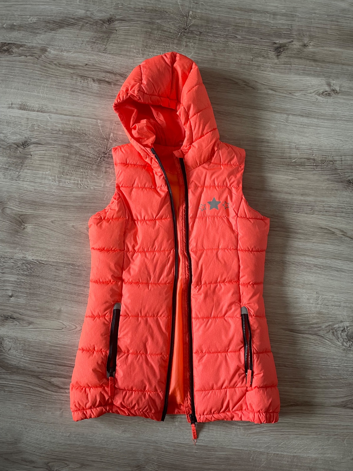Prechodná vesta sivej farby so vzorom, s praktickou kapucňou a vreckami. Zapínanie na zips až ku krku. Veľmi dobrý stav. Dĺžka 65 cm Šírka 43 cm Veľkosť 170/176