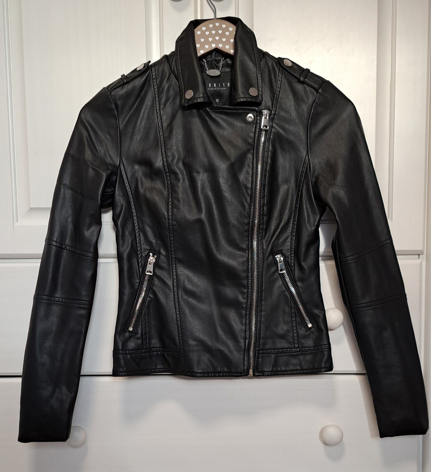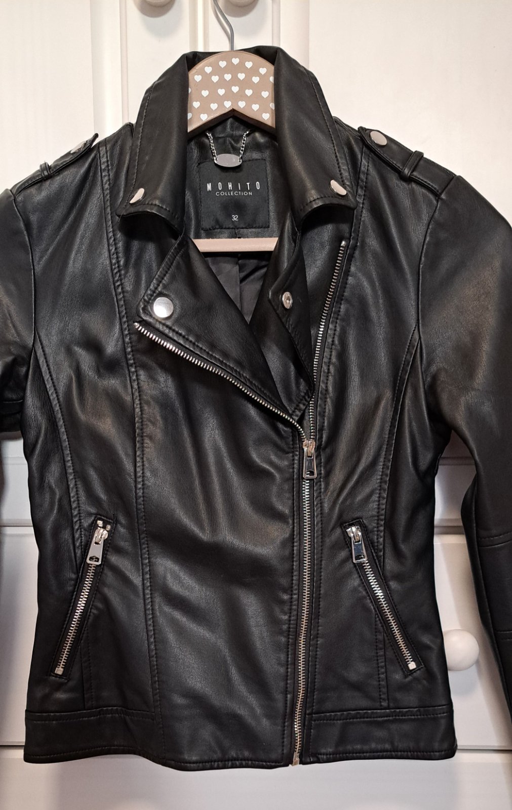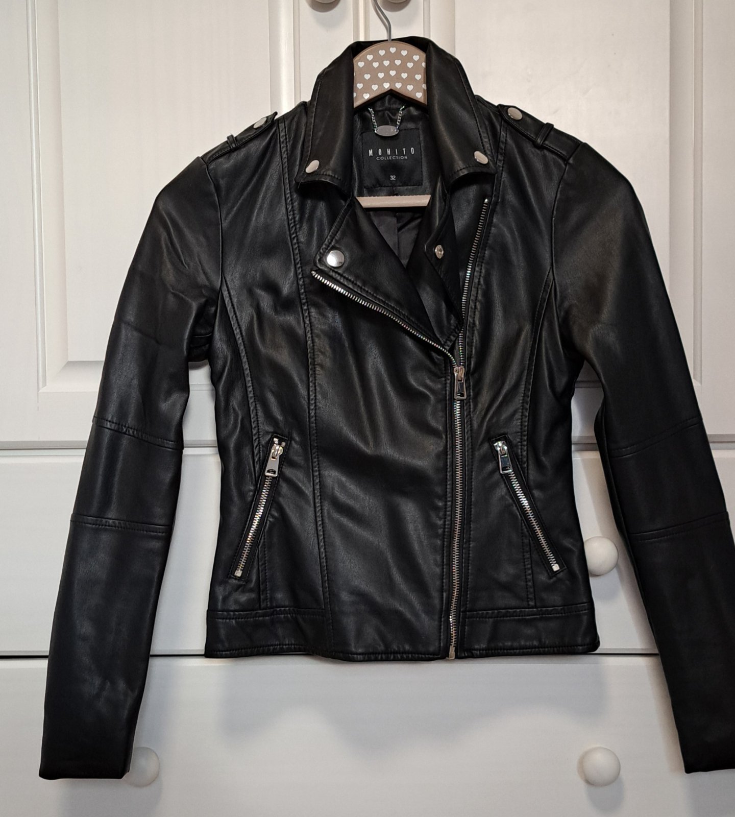 Bunda od značky MOHITO s kožušinovým golierom.Veľkosť 32,imitácia kože.Zapínanie na zips,2 bočné vrecká. Dĺžka 56 cm,rukáv 62 cm,širka cez prsia 44 cm. Nosené párkrát,bez poškodenia,vo výbornom stave.