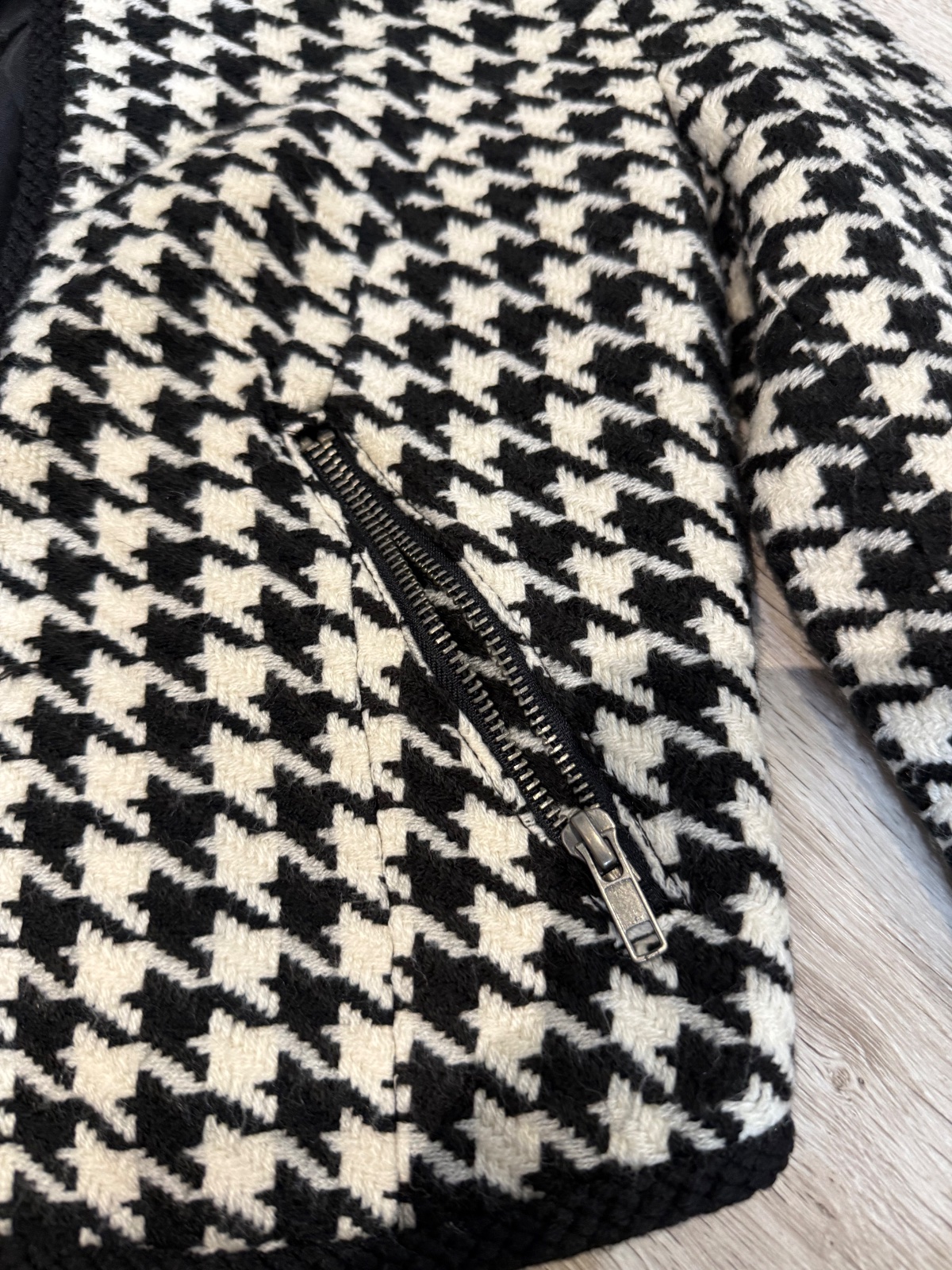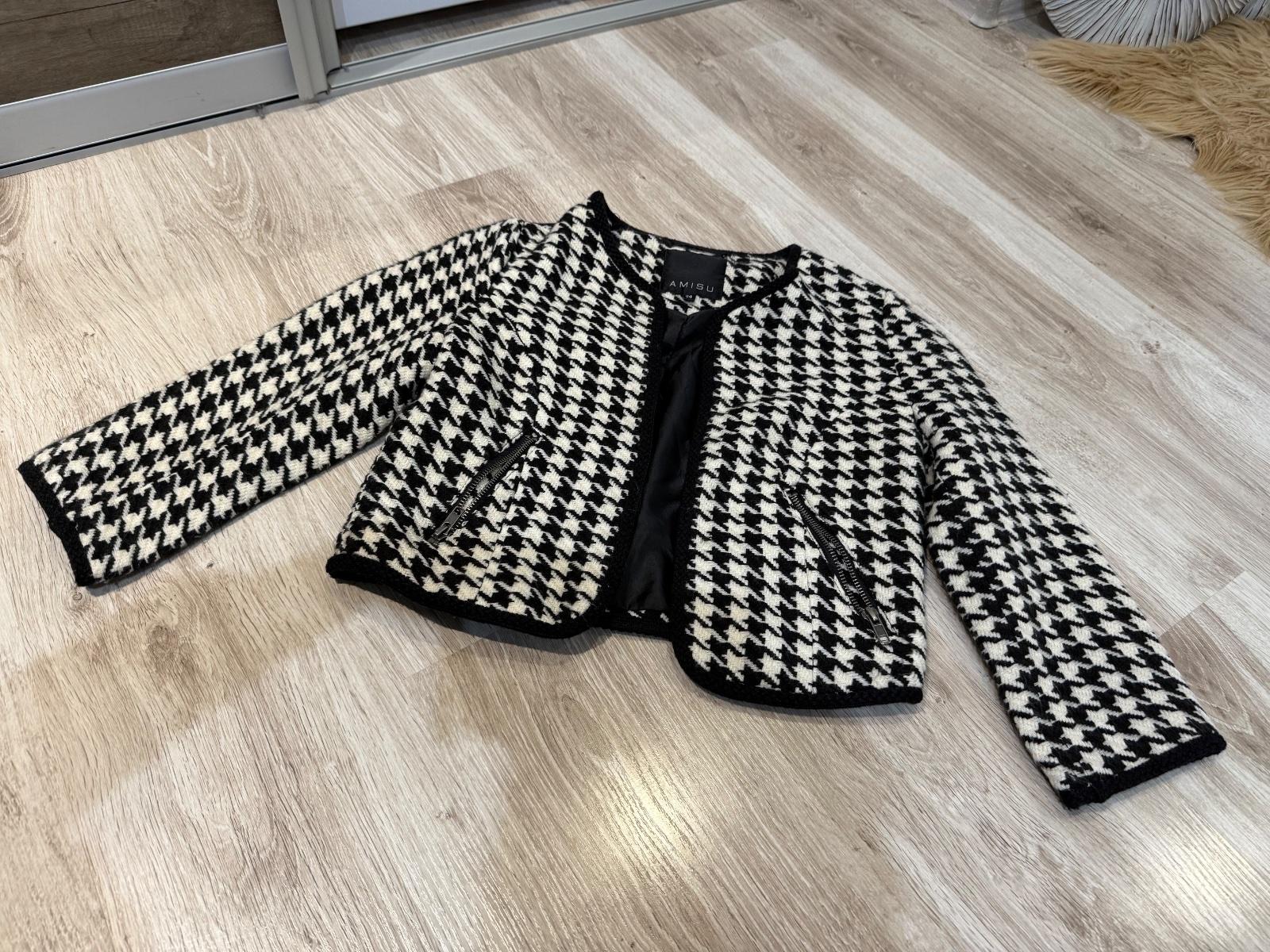 Veľmi dobrý stav! Dámske vzorované čierno-biele sako, zapínanie na jeden gombík, s výpchavkami, dve predné dekoračné vrecká, materiál 100%polyester. ROZMERY: dĺžka: 58,5cm, od pazuchy dĺžka dole: ...