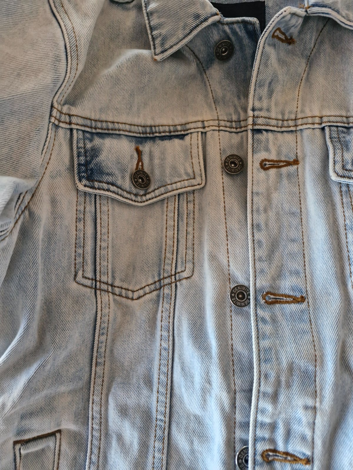 Peknučká rifľová bunda bez poškodení. Veľkosť písaná L, ale je oveľa menšia. Šírka cez prsia 40cm.