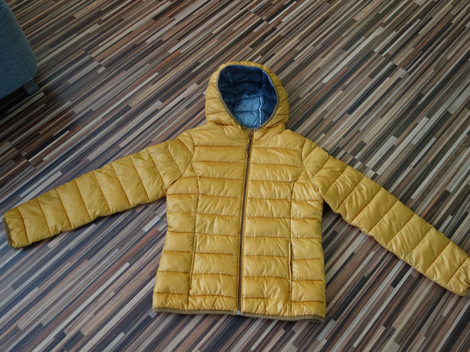 Krásna bundička v kráľovskej modrej farbe. Jediná viditeľná stopa nosenia je zošúchany nápis na bunde. Podšitá teplákovinou. Krásna