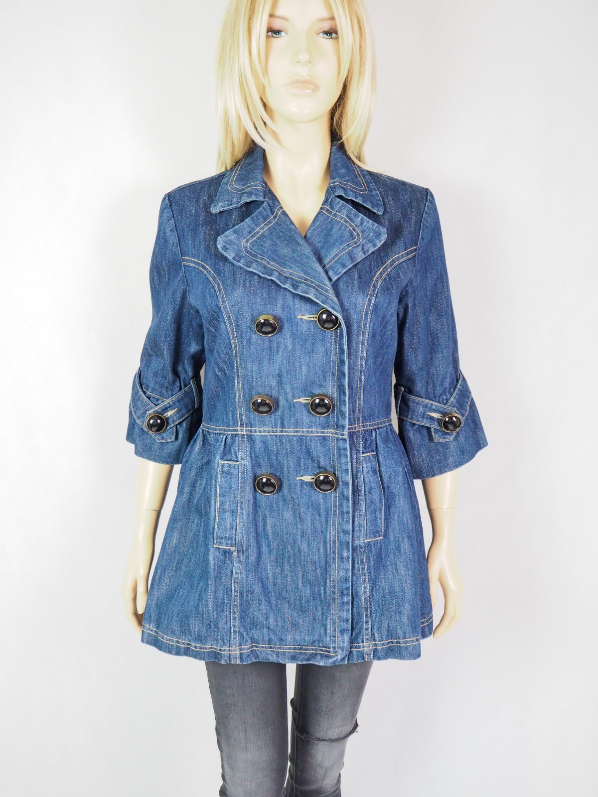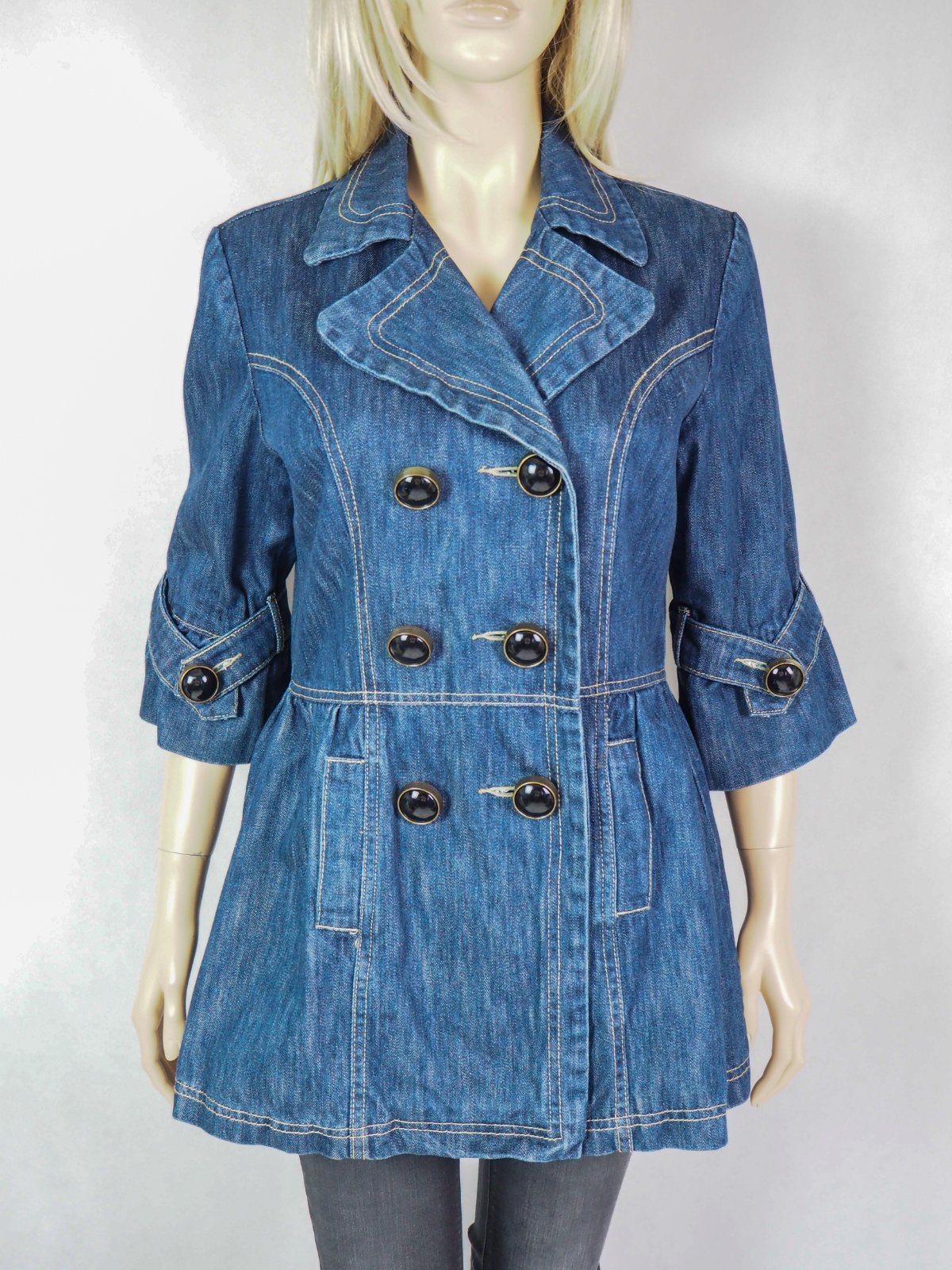 Kvalitný riflový kabátik so zapínaním na gombíky v dvojrade, 3/4 rukáv, materiál 100% bavlna, super stav.