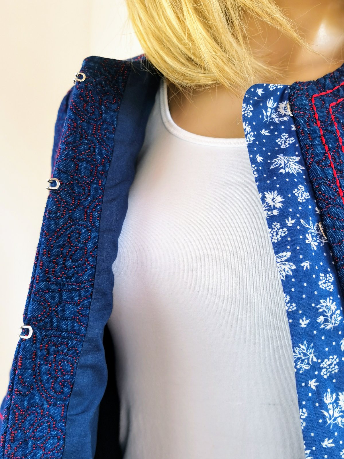 Na prvý pohľad očarí detailmi(výšivkou s červenou niťou), podšívkou z modrotlače, a zapínaním na háčiky.