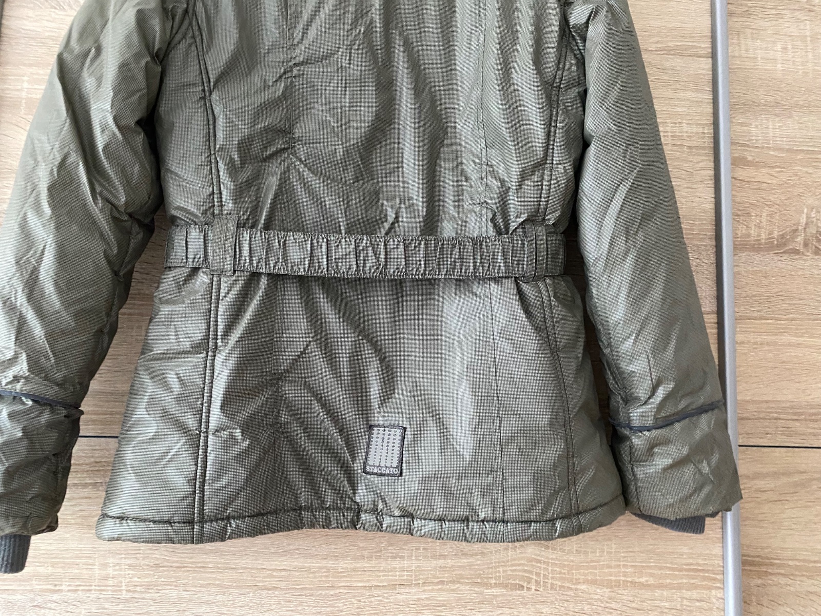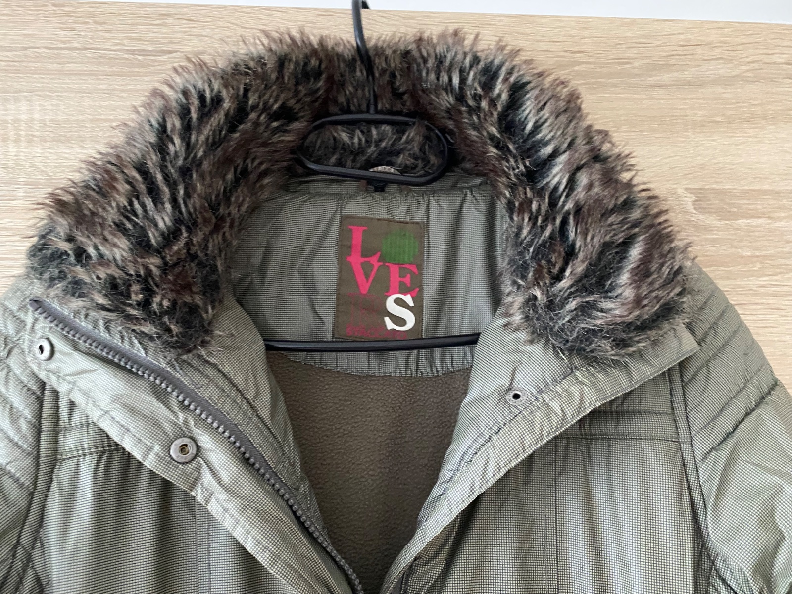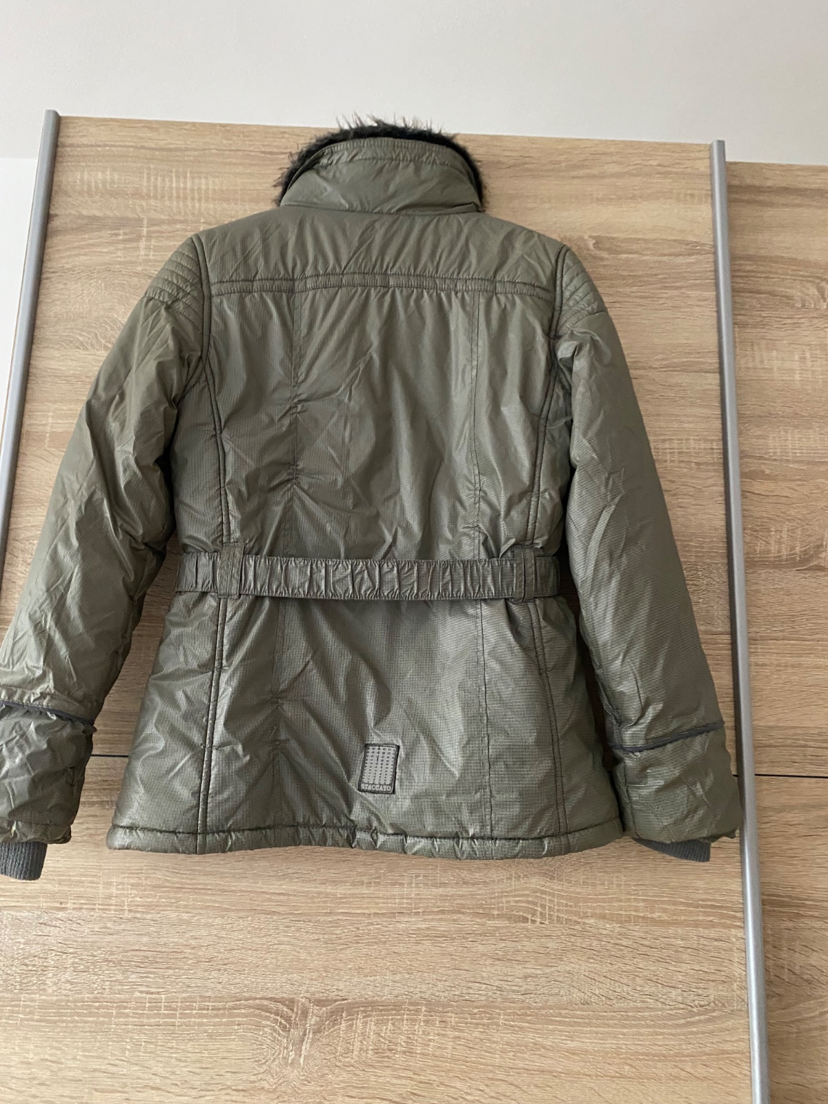 Zimná bunda značky Lovers, obvod hrude 2x46cm, dĺžka 64cm, v páse opasok zapínanie na cvok, odnímateľný kožušinový golier, na spodu rukáva všitý pružný patent, málo nosená