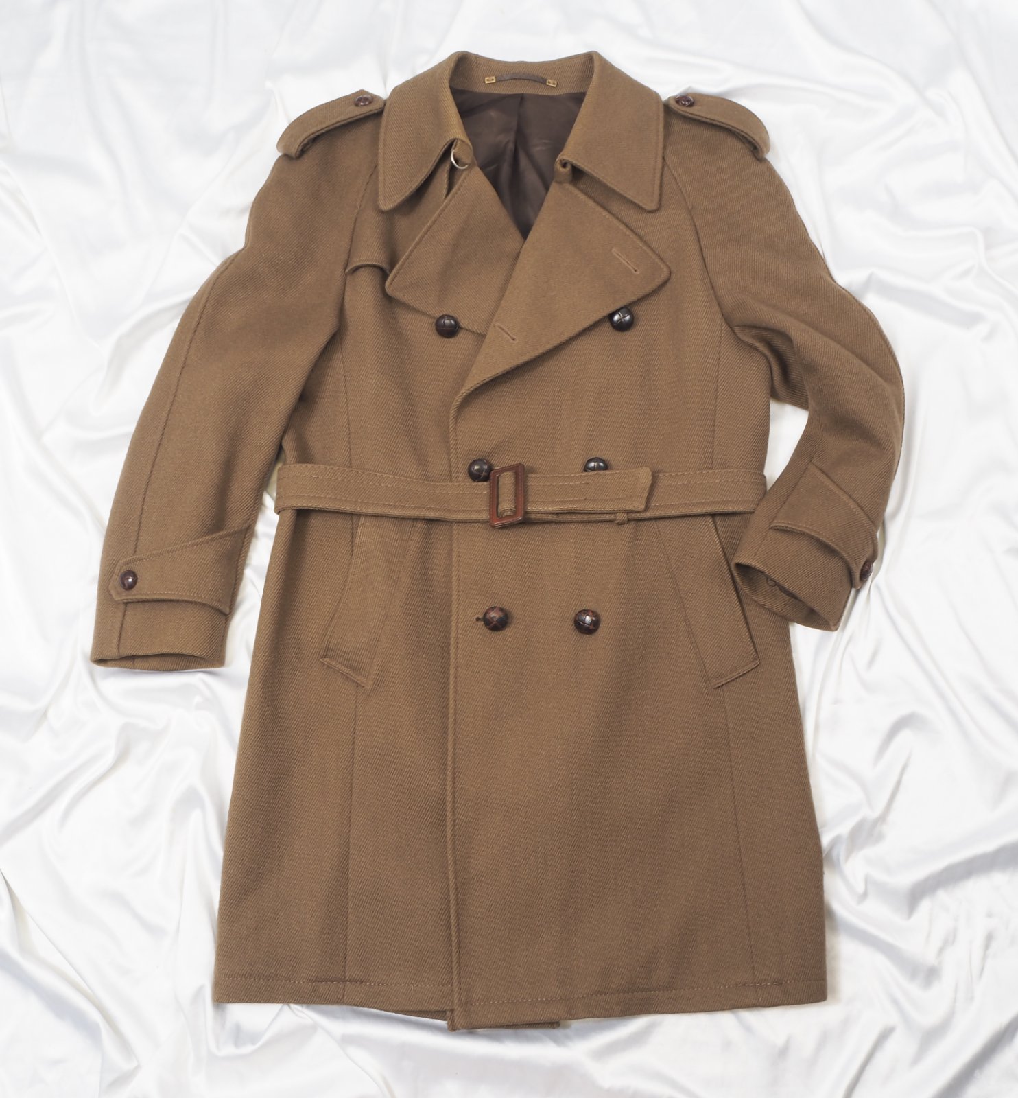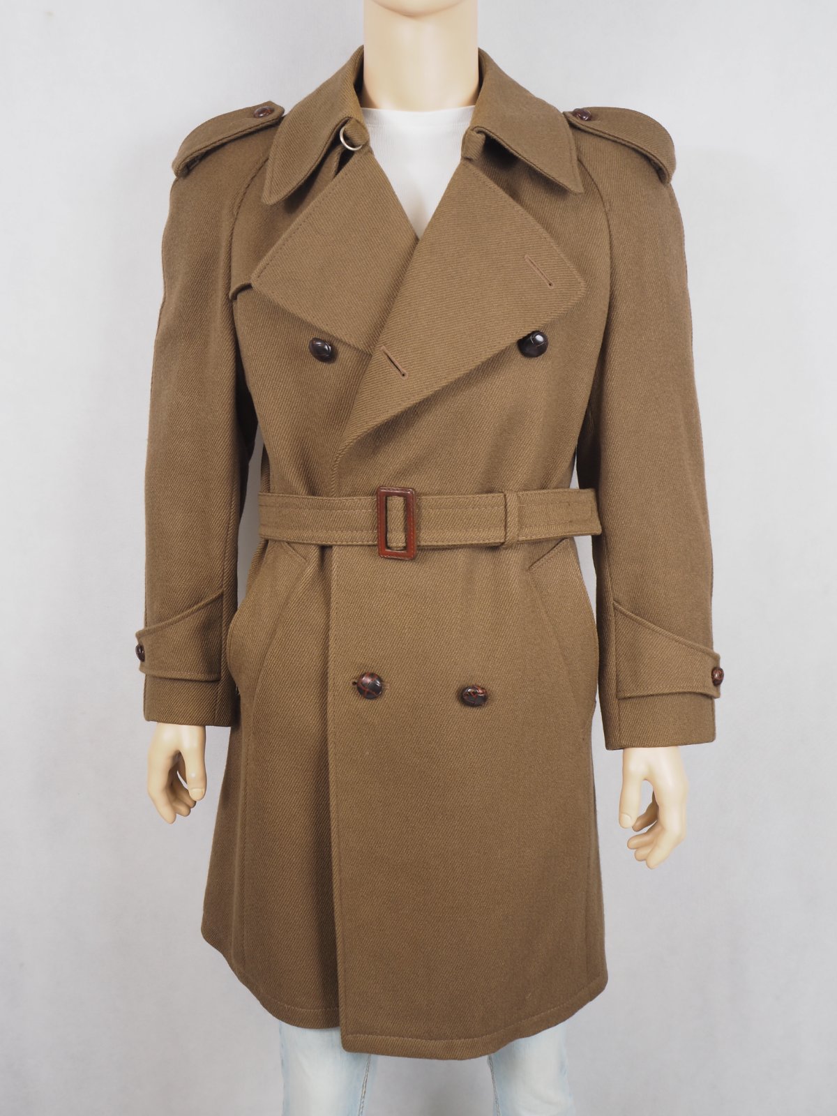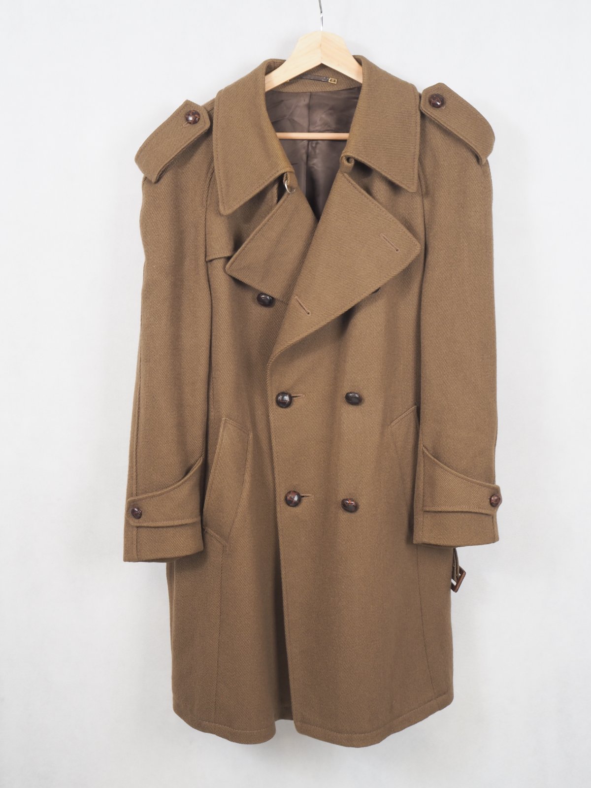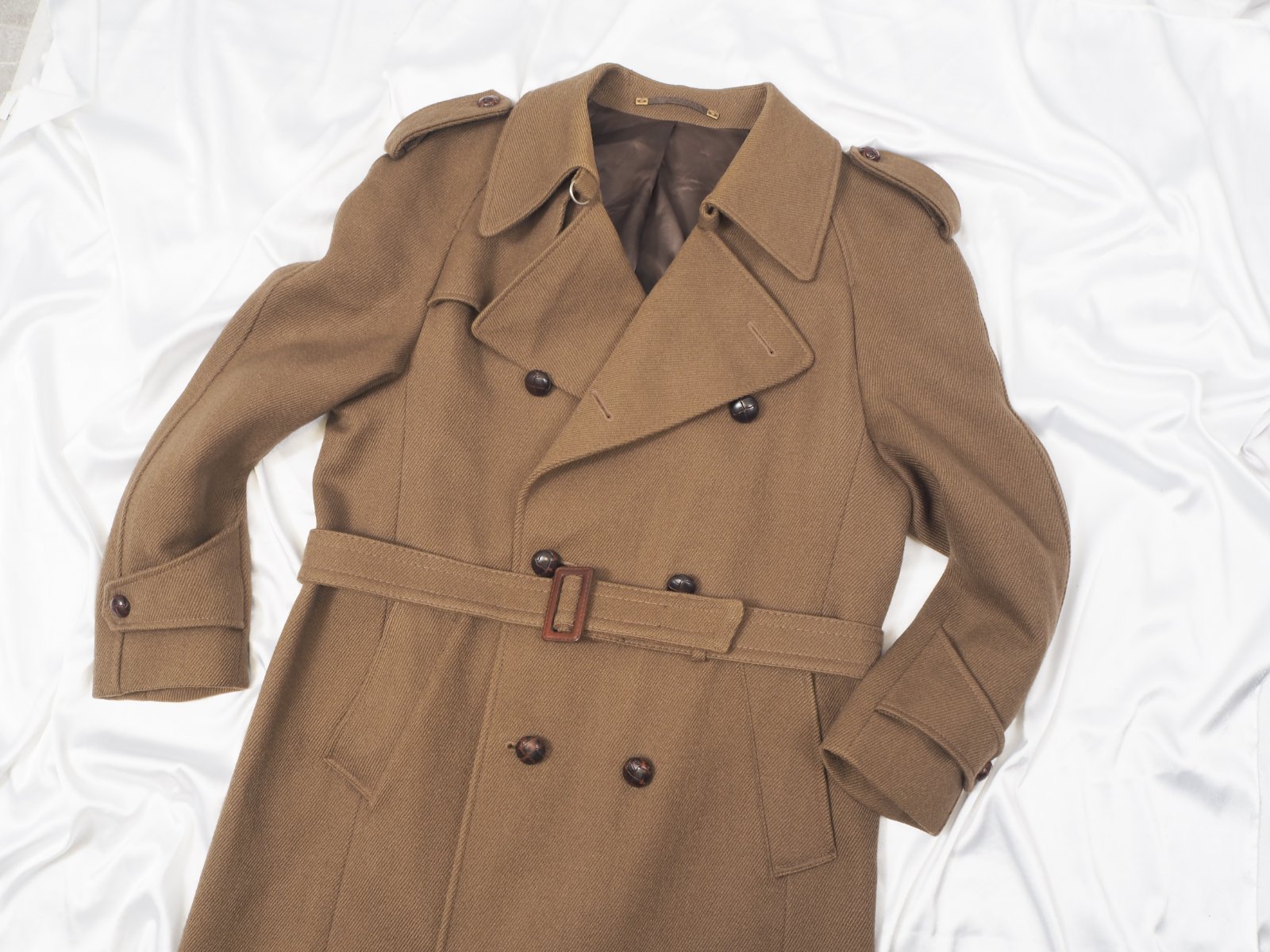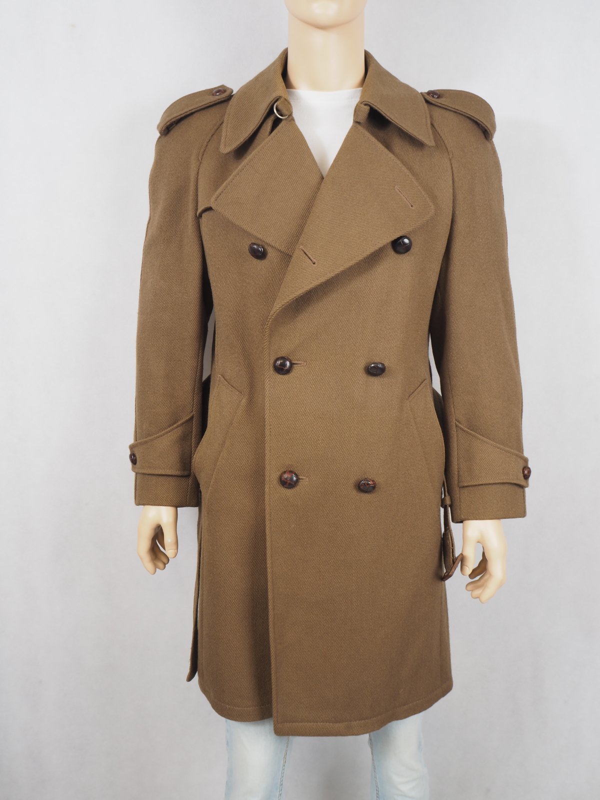 Kvalitný vintage kabát, army štýl, s opaskom, dvojradové zapínanie, 100% vlna, raglanové rukávy, podšitý, nenosený.