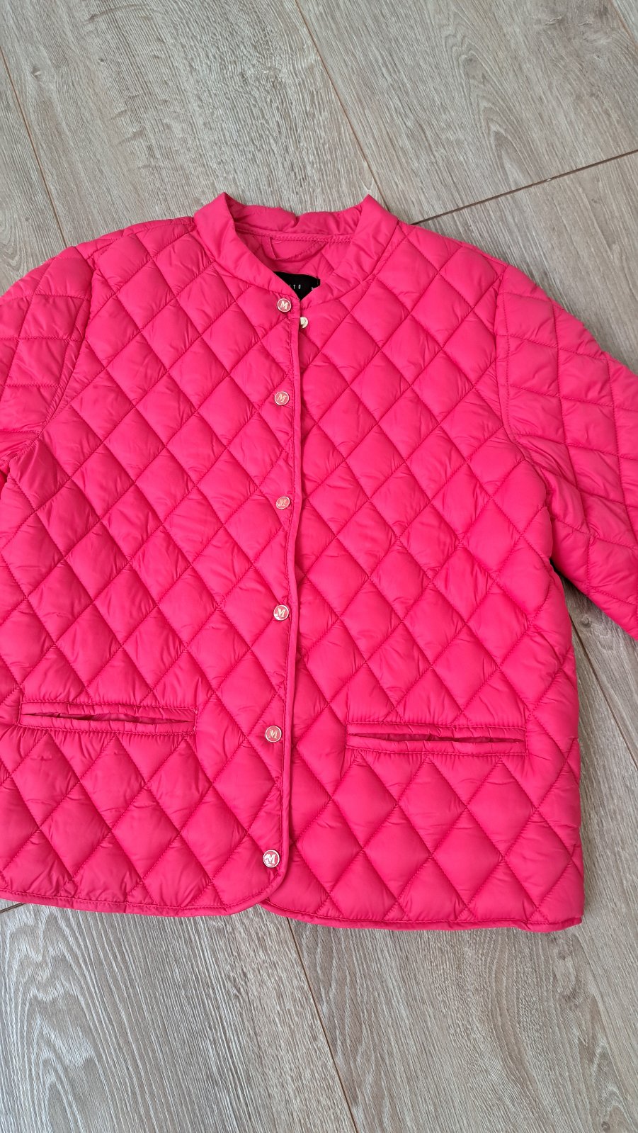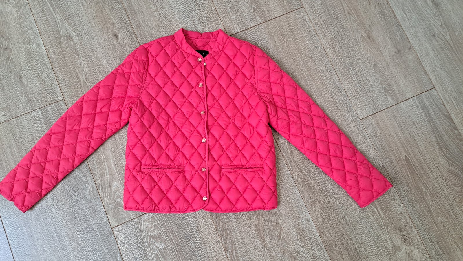 Nenosená prechodná bunda s nízkym stojačikom. Tmavoružová, zapínanie na cvojy. Ľahučká.