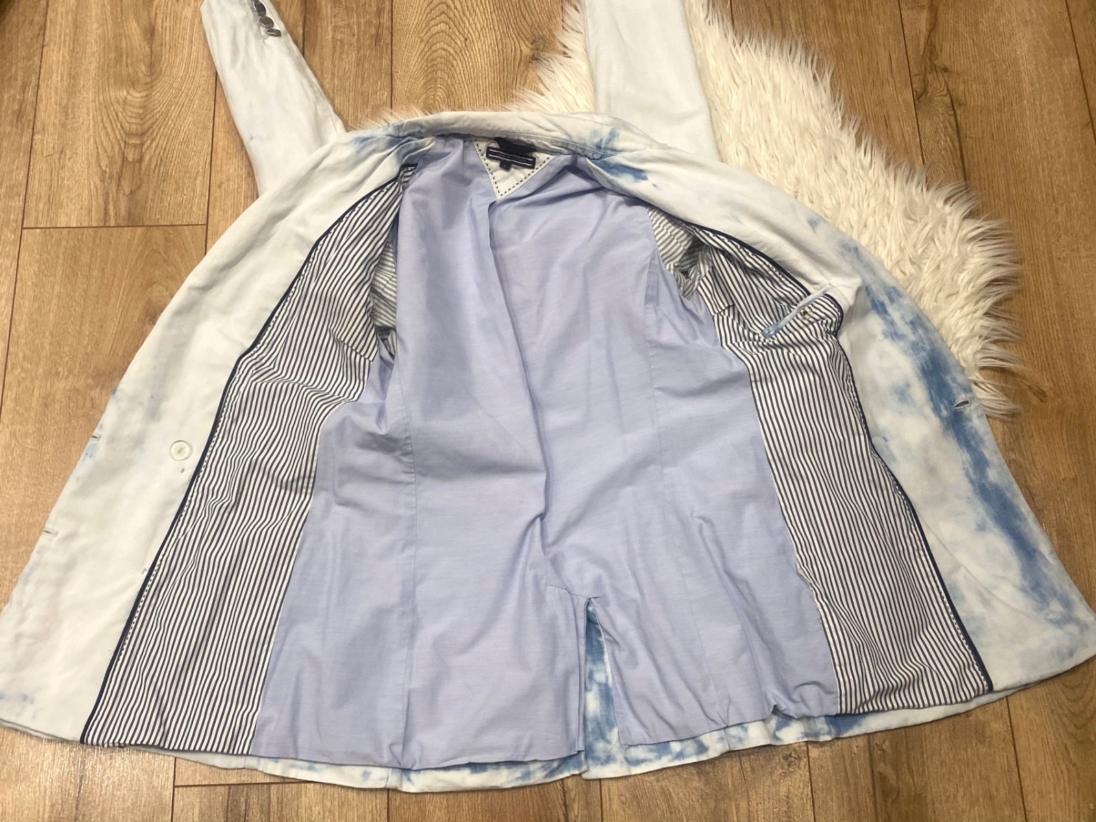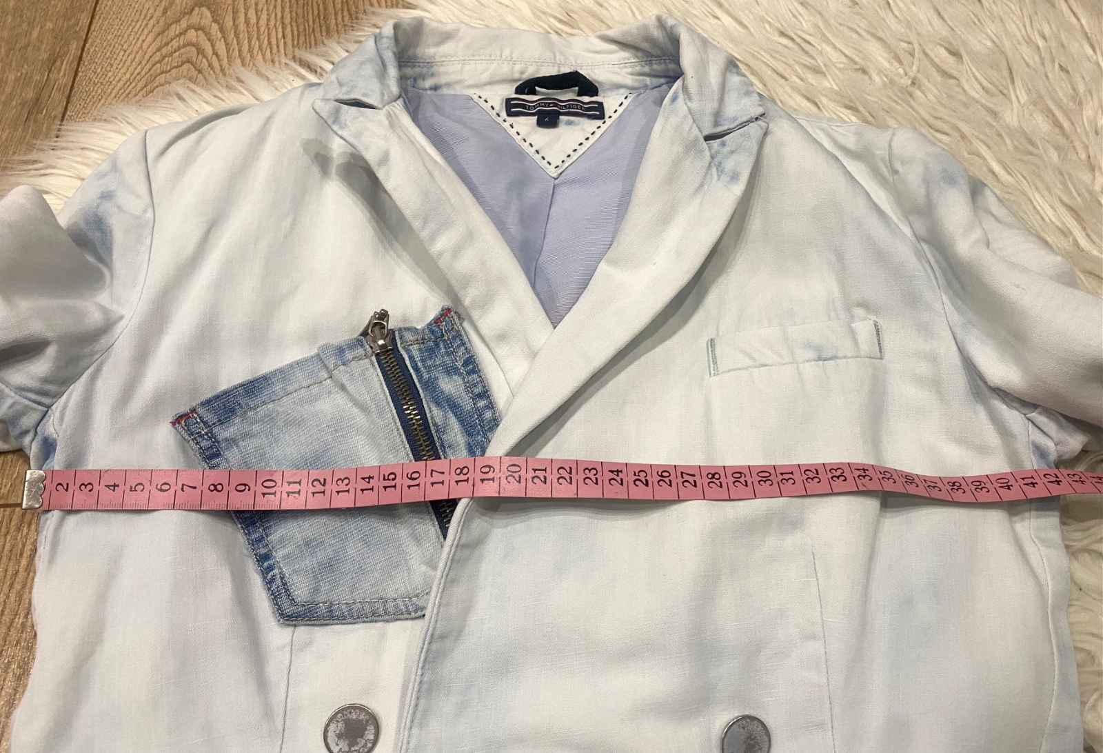 Zaujímavé denimove sako,podšite,2male chybičky odfotené,veľkosť 6=XS,miery na foto,cena 10€+pošta