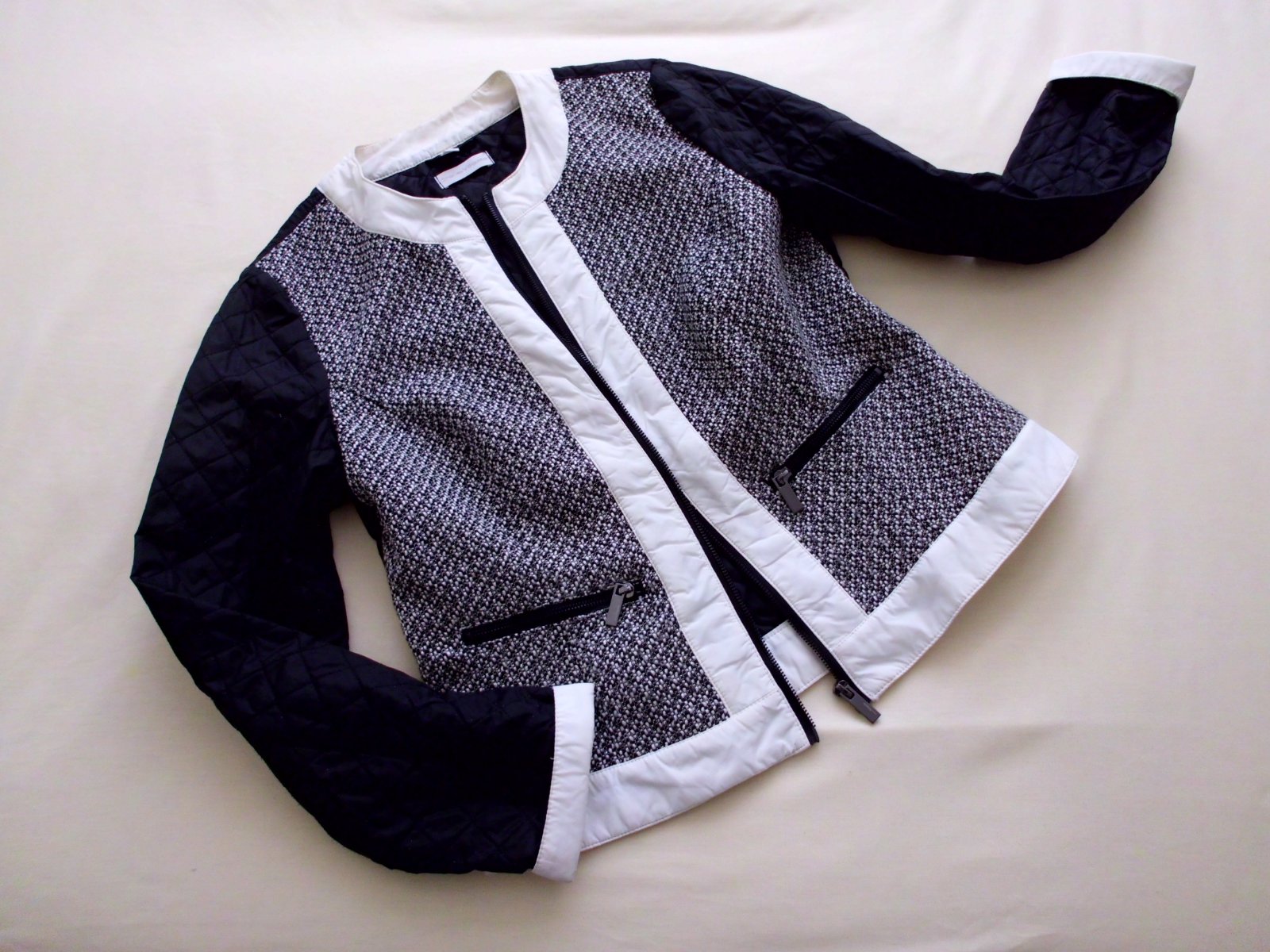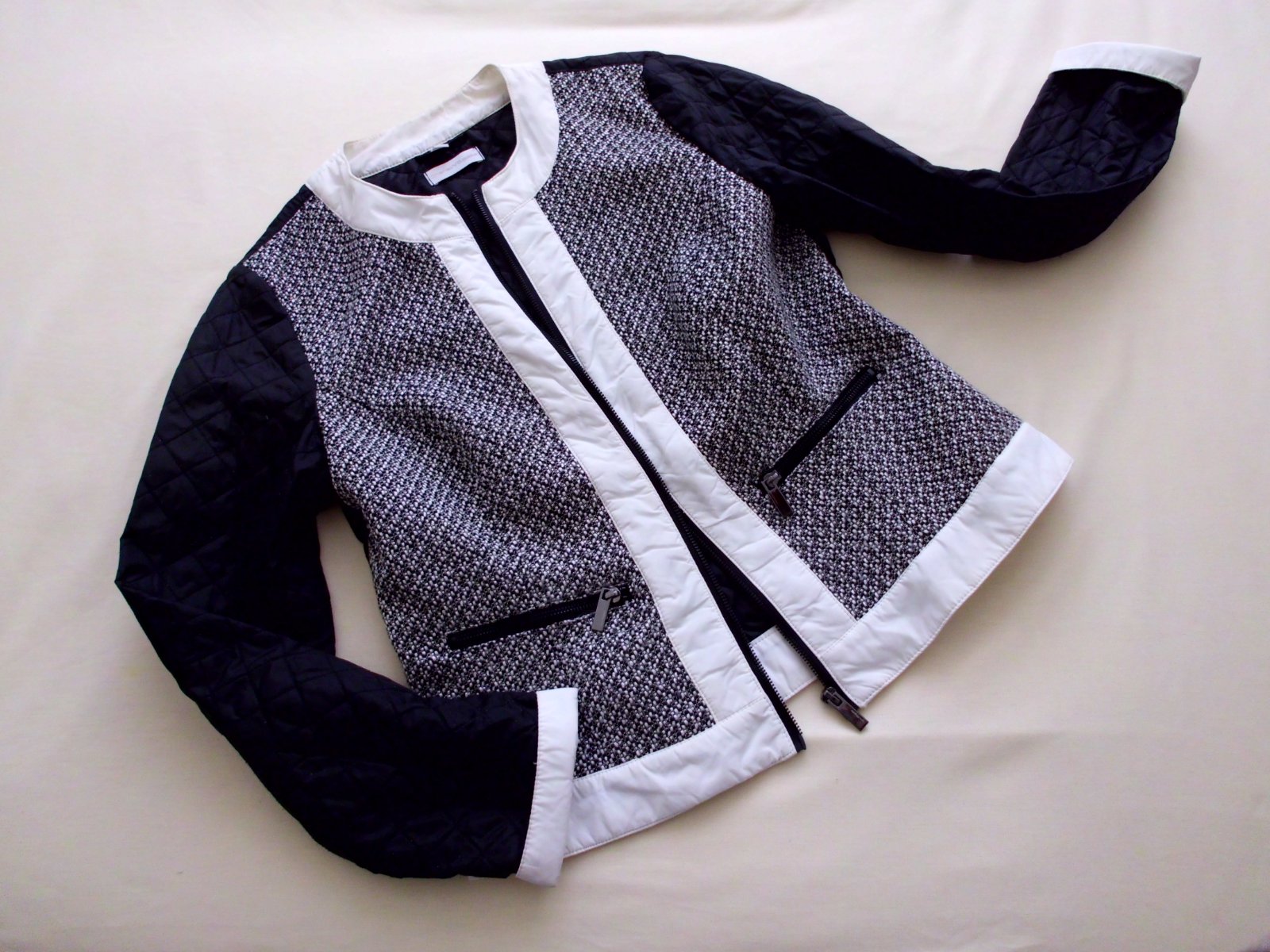 Predám zaujímavé sako-kabátik-bundička Charles Voegele vel. 40-M-L, dĺžka 57 cm, šírka 49 cm, rukáv 63 cm, zloženie na foto , materiál predný diel vkladaný úplet, tvarovaný strih,pekné detaily,čierno-biela farba, 100% stav ...