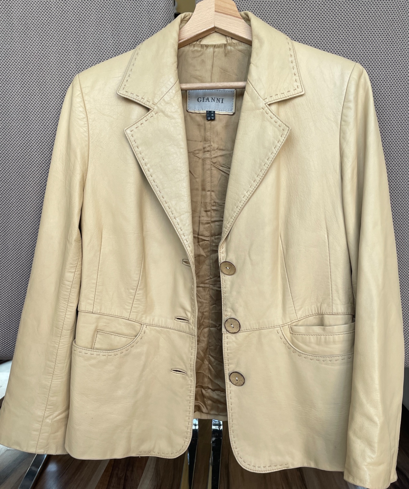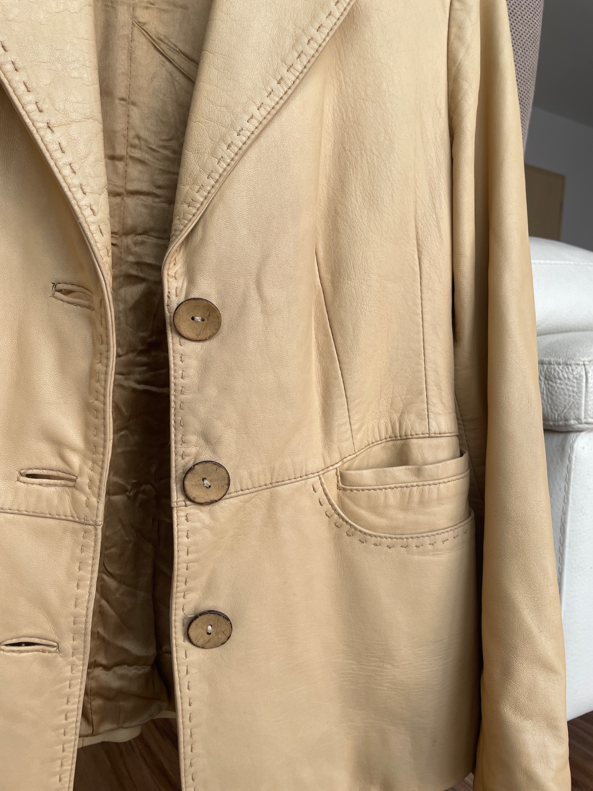 Máličko nosené béžovo-žlté sako zn. Giani, mäkučká koža, podšité, výborný stav, veľkosť 42, ale je užšie, rozmery: šírka ramien 42, dĺžka rukáva od pleca 57, dĺžka saka 60 cm, šírka cez prsia 47 cm