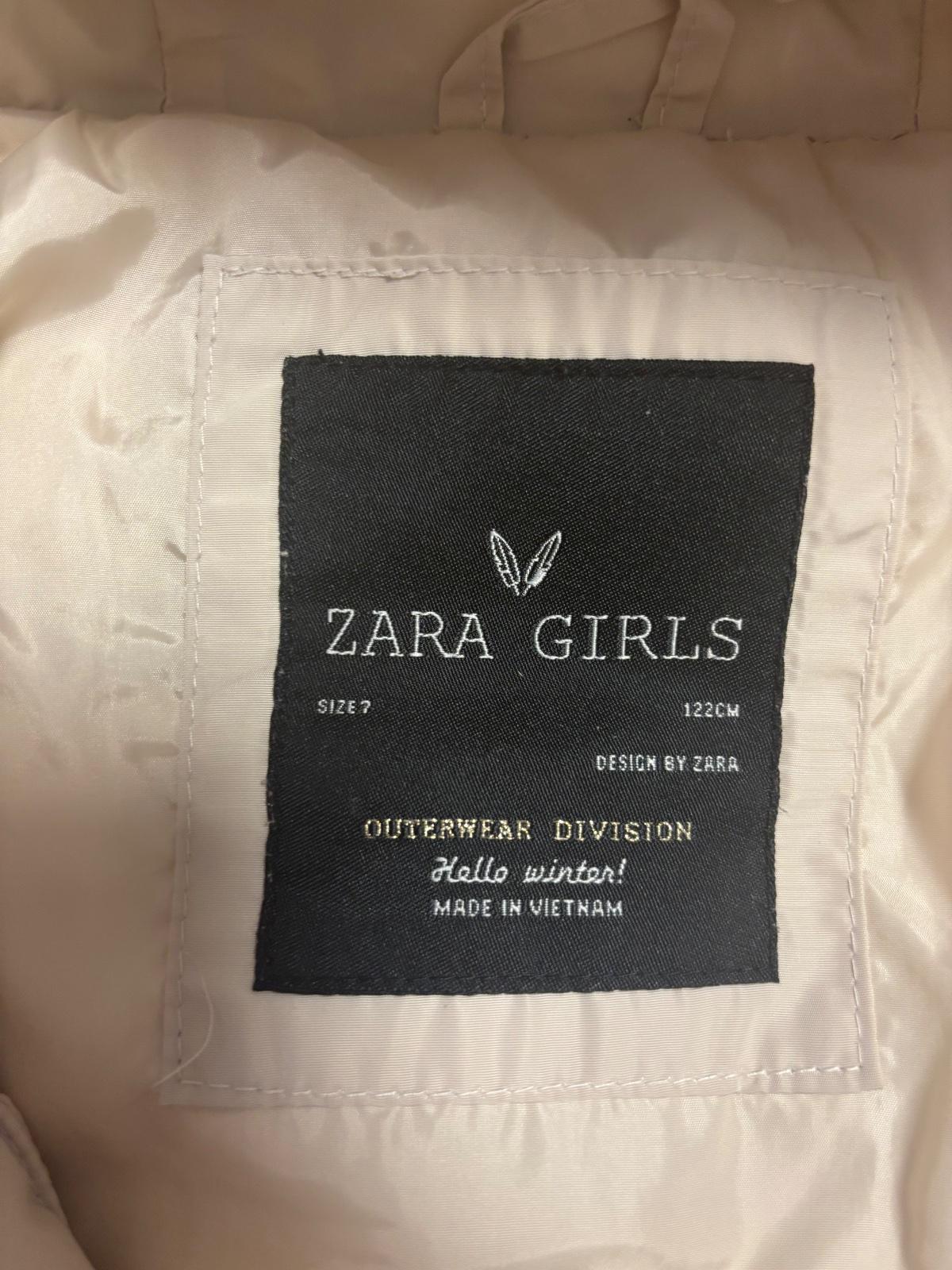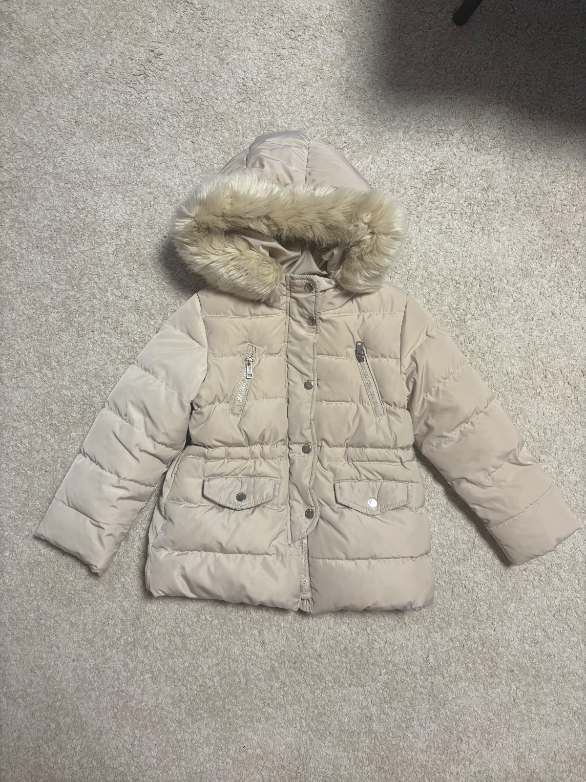 Teplá zimná bunda, plnená perím. Nosená bez poškodenia, perie nie je úplne rovnomerne rozložené už, ale žiadne guče tam nevznikli. Veľkosť písaná 122, ale sedí od 116. Preto aj tak uvádzam. V pase je šnúrka na stiahnutie, kožušina umelá a dá sa odopnuť. Má kraásnu trocha lesklú smotanovú farbu.
