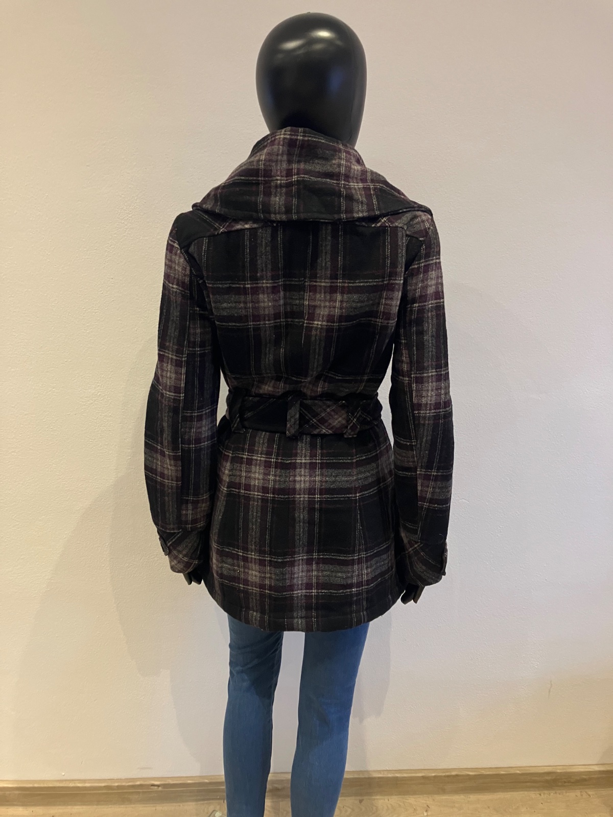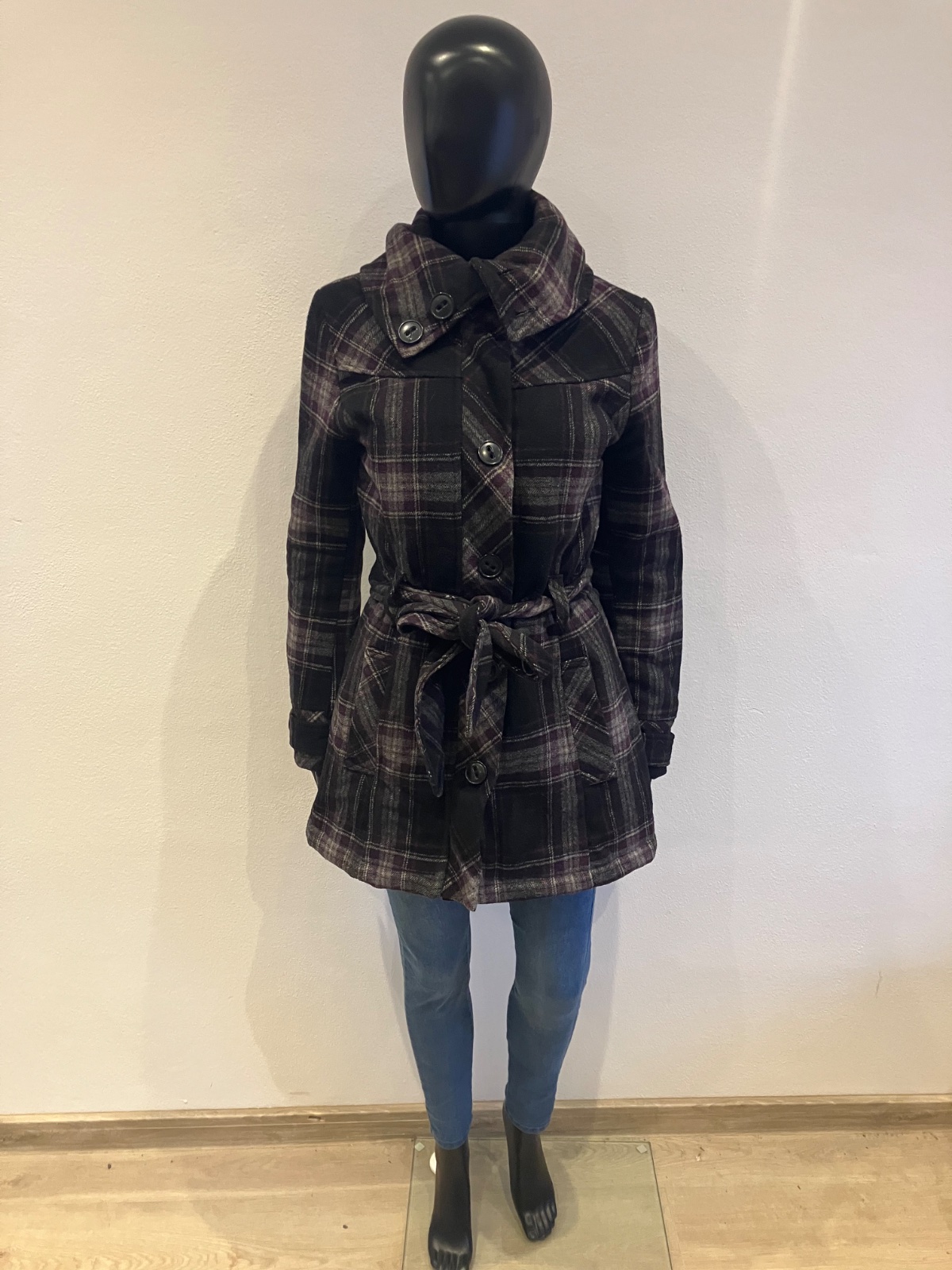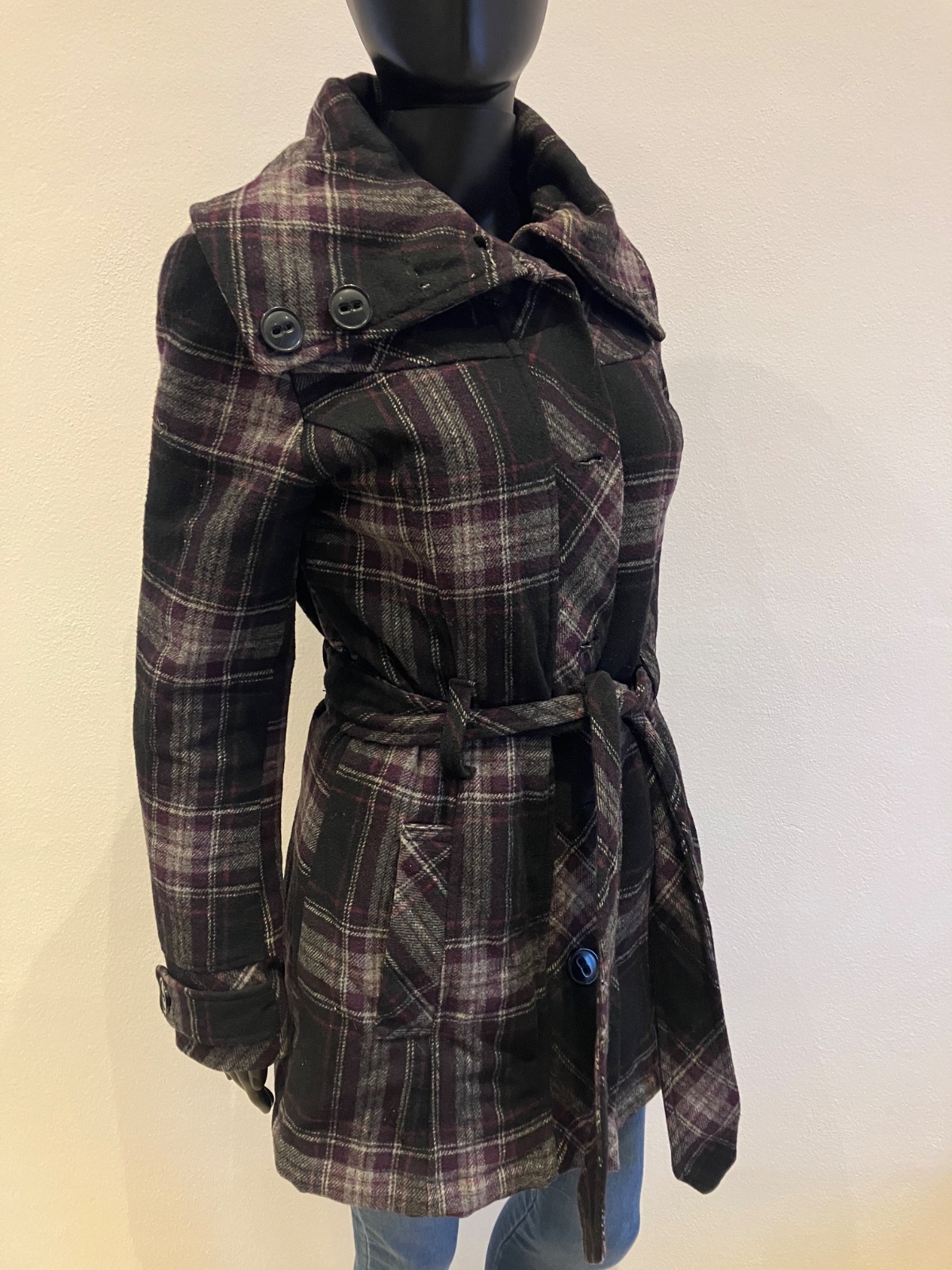 Dámsky fiaľovo-sivo-čierny kabát s vysokým golierom a opaskom na zaviazanie, krátky, prechodný, vhodný aj na miernu zimu, zapínanie na zips a na veľké gombíky, dve bočné vrecká, materiál 50%vlna,50%polyamid,100%polyester.