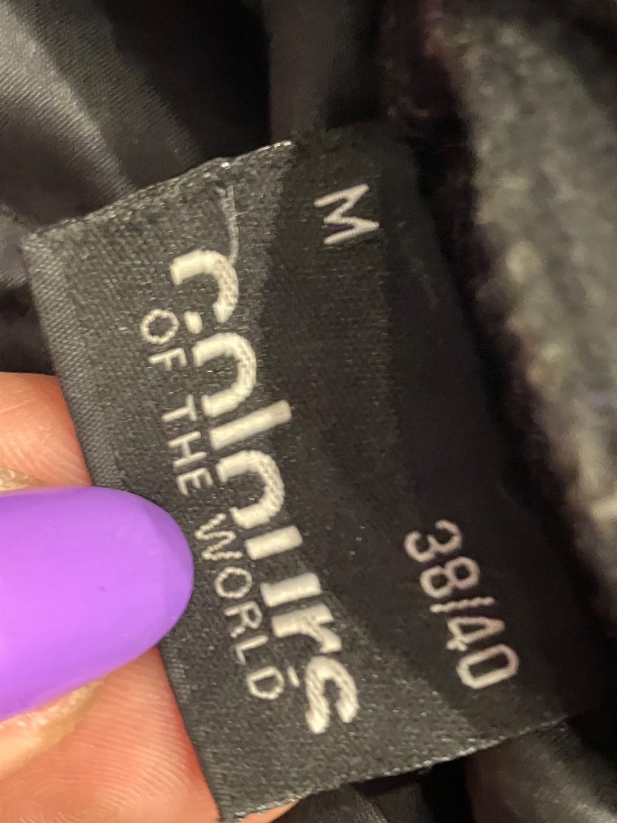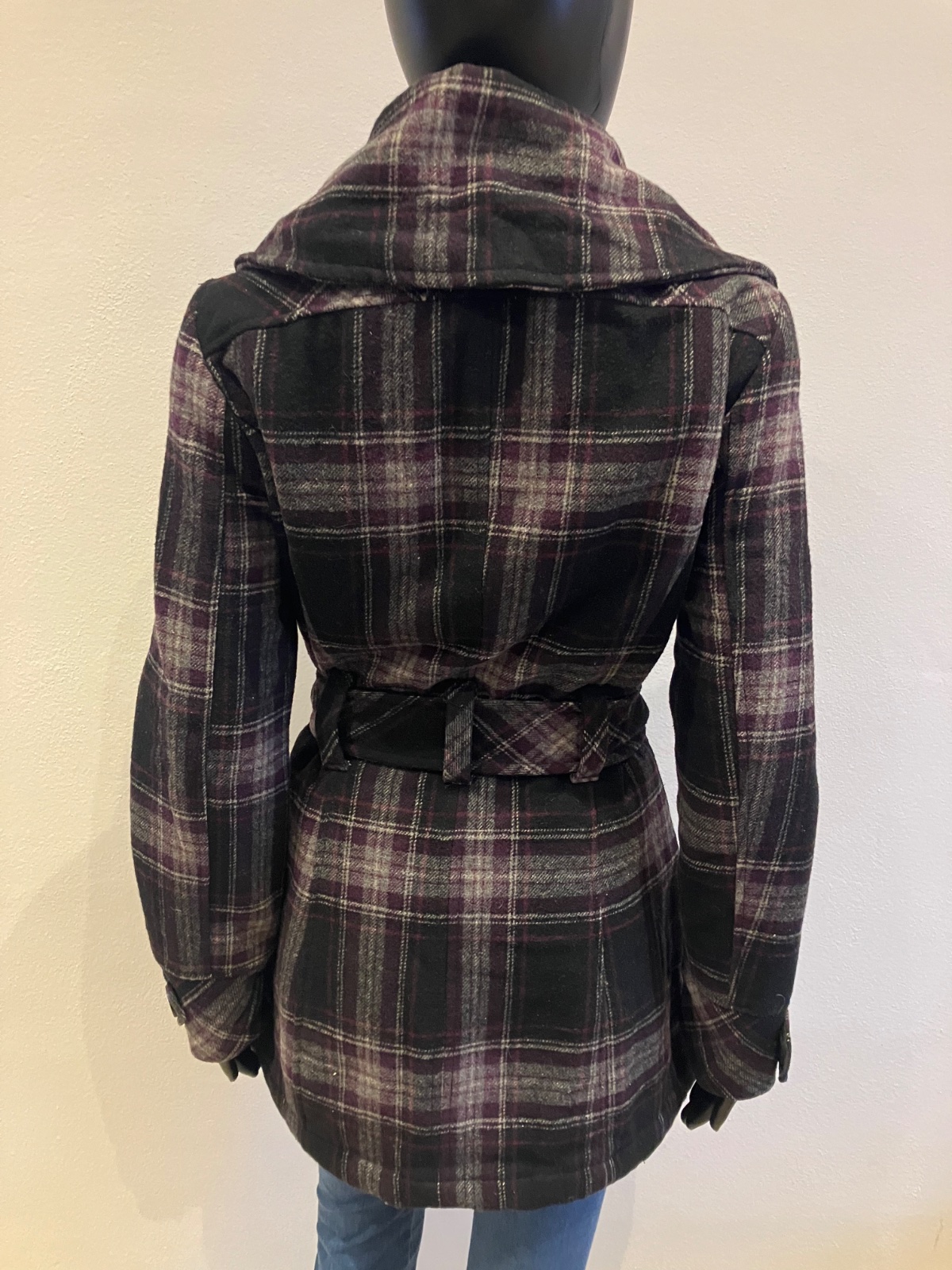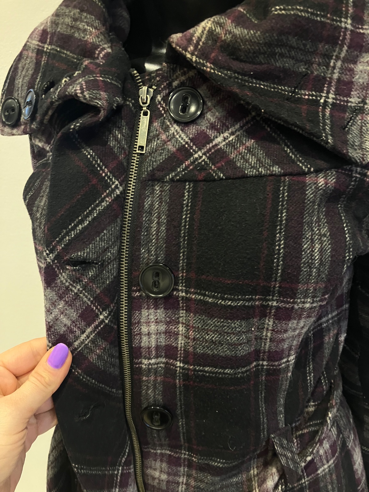 Dámsky fiaľovo-sivo-čierny kabát s vysokým golierom a opaskom na zaviazanie, krátky, prechodný, vhodný aj na miernu zimu, zapínanie na zips a na veľké gombíky, dve bočné vrecká, materiál 50%vlna,50%polyamid,100%polyester.