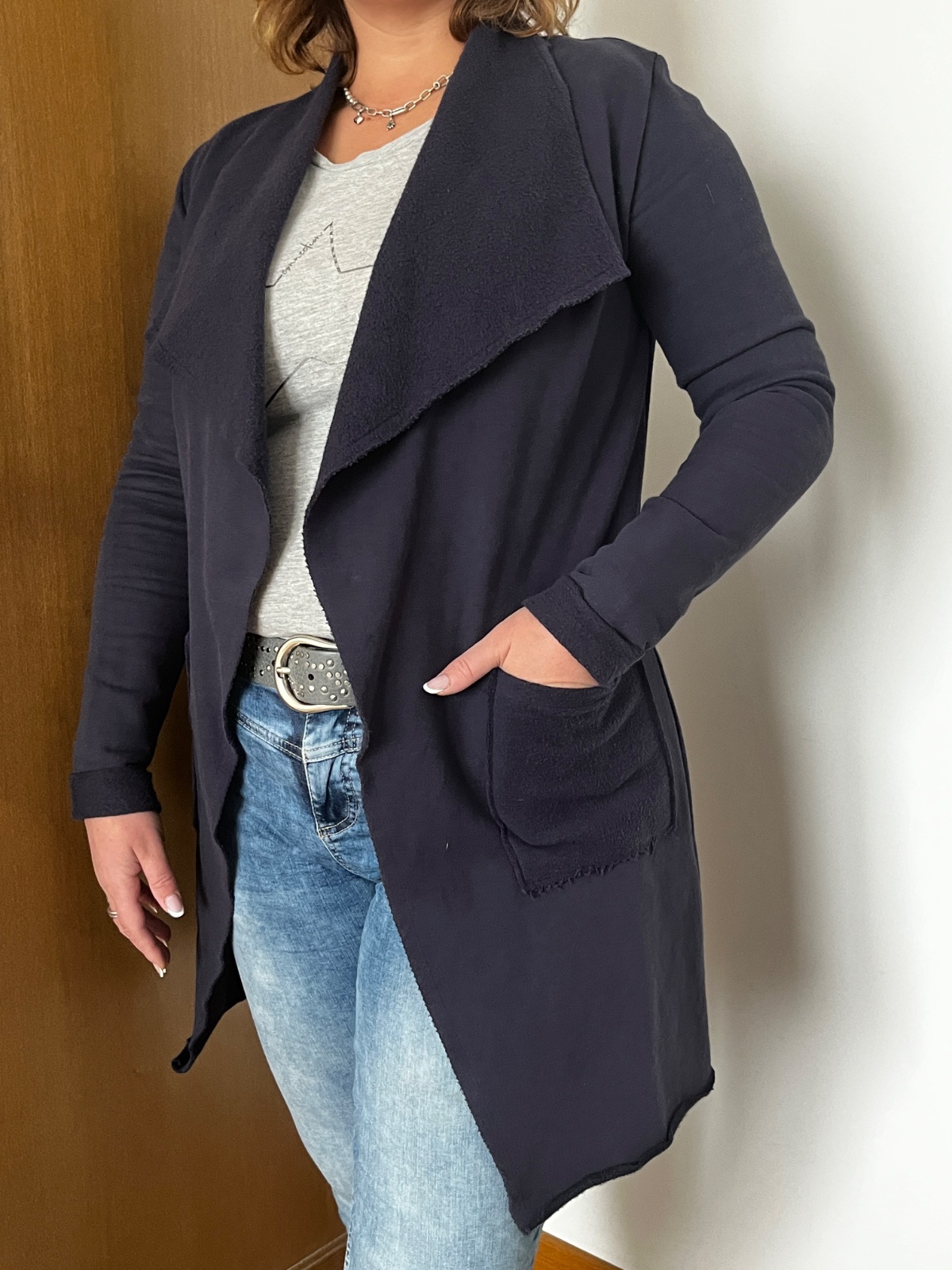 Kardigan je bez zapínania, pekne padne a má moderný strih s výrazným golierom.