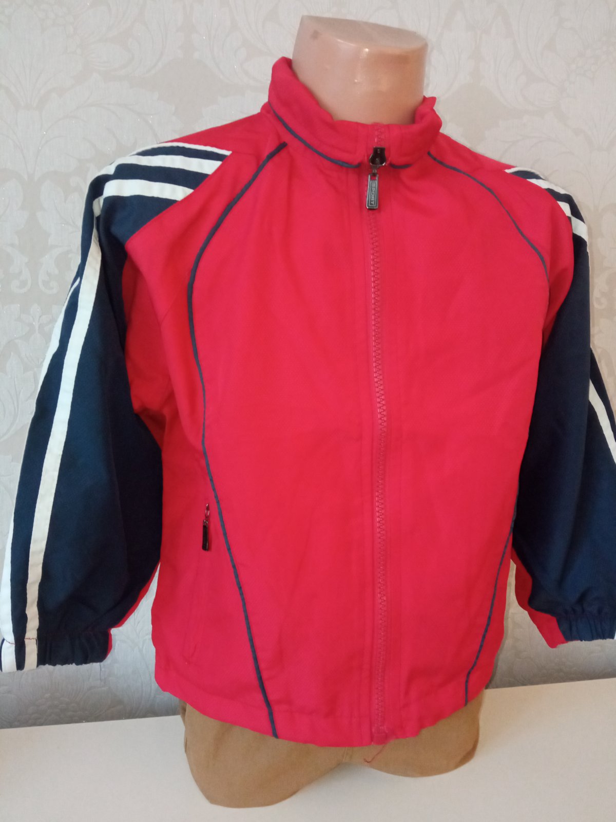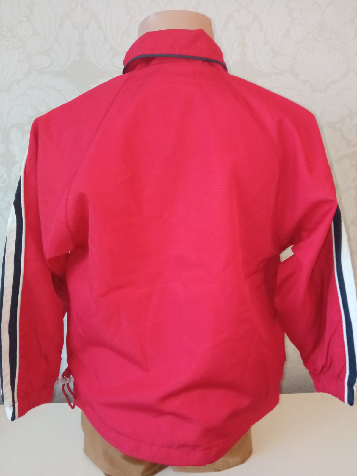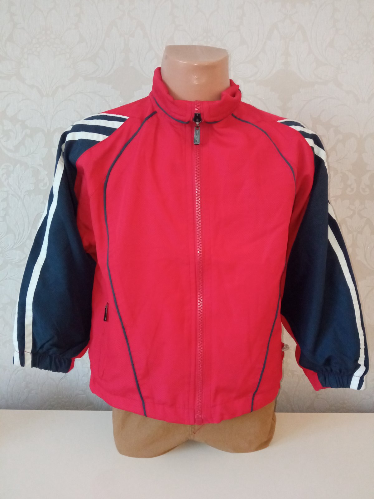 Vetrovka je veľmi tenká (jarná/letná). Zapínanie na zips. Dve bočné vrecká. Materiál:100%polyester. Farba: červeno-tmavomodrá.