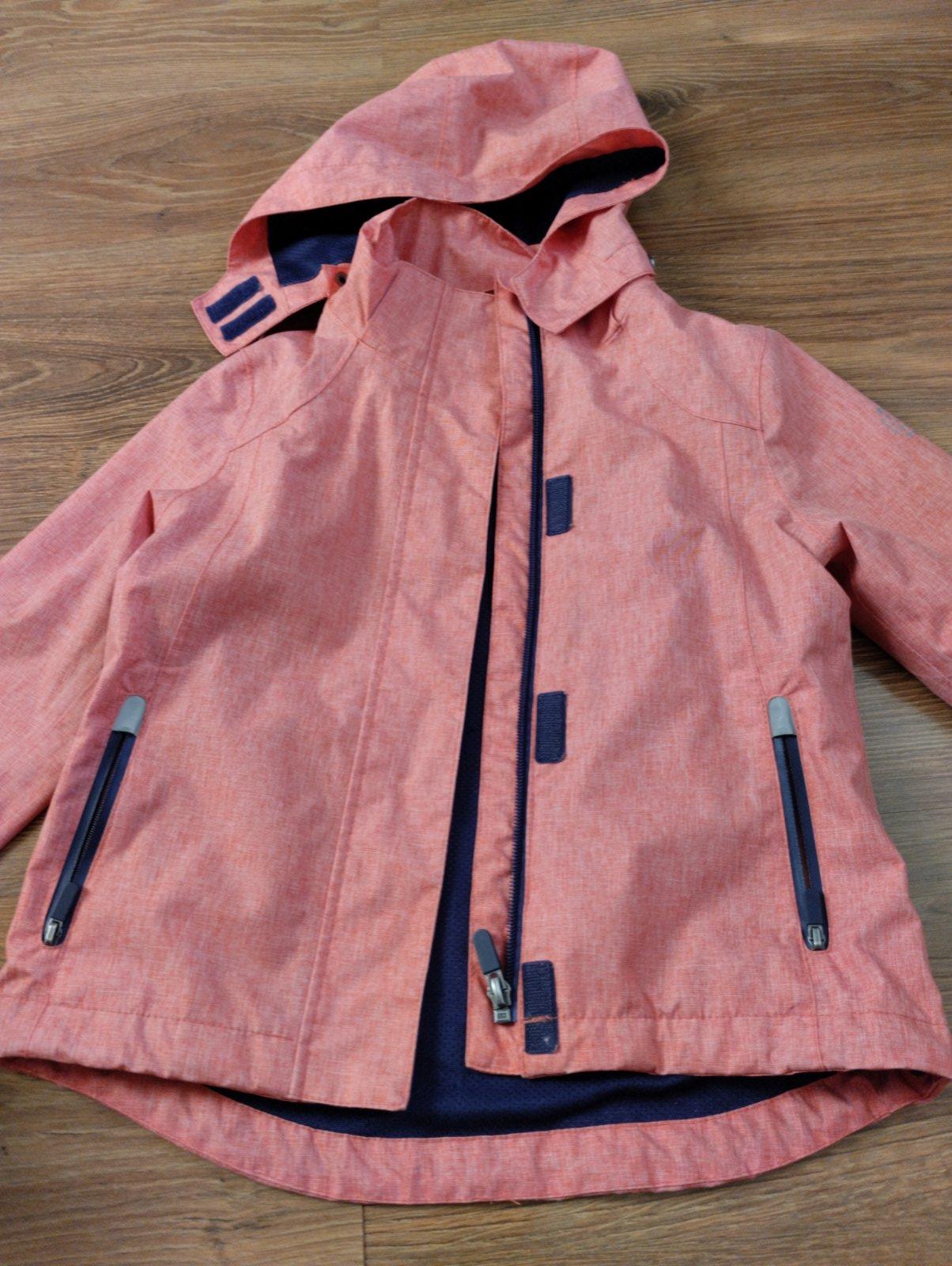 Krásna ako nová vetrovka s podšívkou na prechodné obdobie. Farba je taká červeno ružová. Veľmi pekná. Dĺžka 49, šírka 2x 35, dĺžka rukavov 42