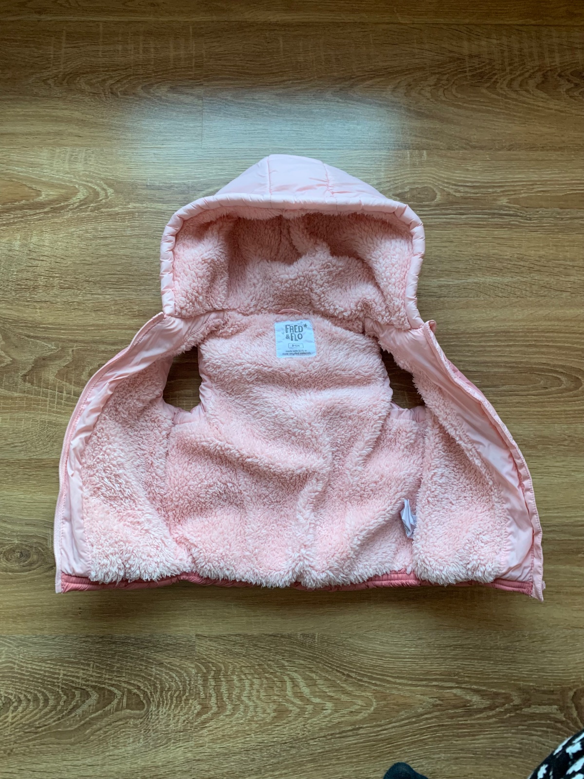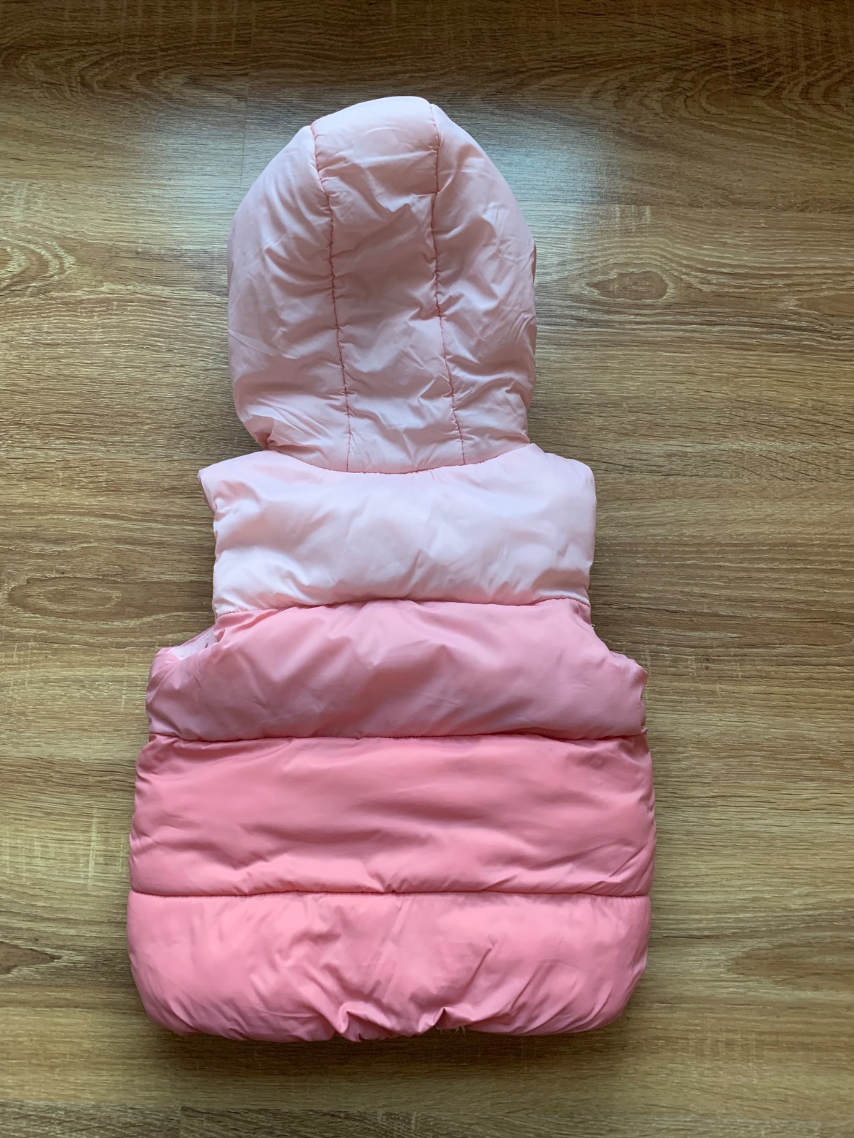 Zateplena vesticka,farba je taka ruzovo-cervena,velkost asi na 6-9 mesiacov.Chyba kapucna,odopla som ju,lebo malej tam vadila,a neviem ju najst.Ale zips je schovany,takze nie je vidiet,ze tam ma byt.