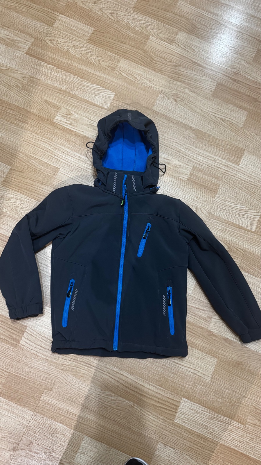 Krásna bunda v top stave. Podšitá teplým fleesom, ma odnímateľnú kapucňu a 3 vrecká na zips. Veľkosť nesedí na 116 ( bola nám veľká ) preto pripájam rozmery: