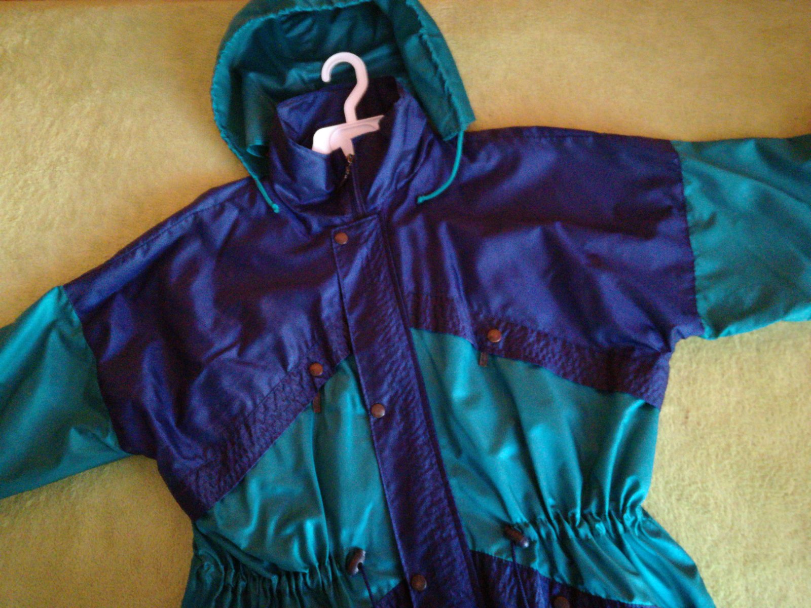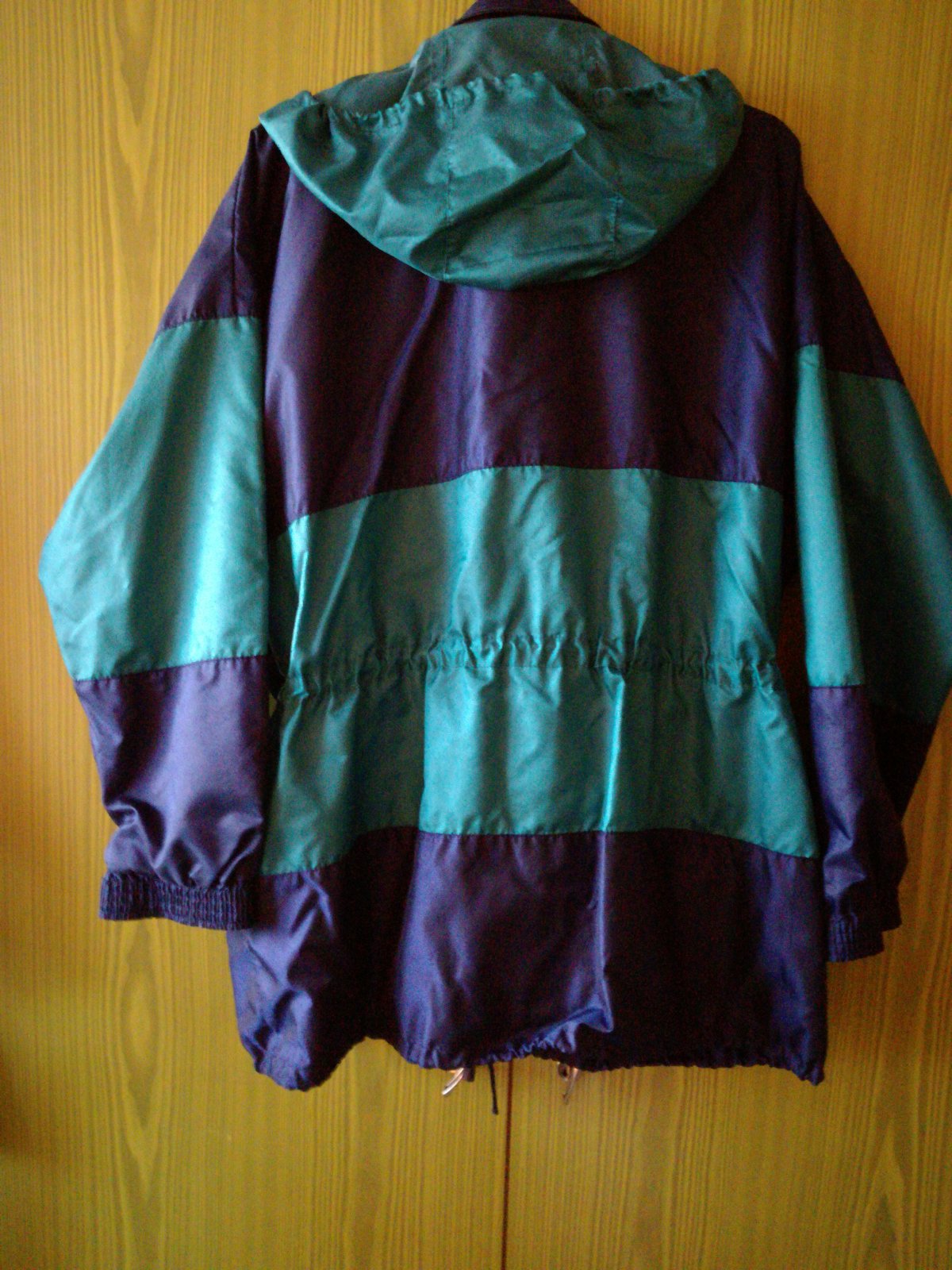 Pekná bunda s kapucňou, ktorú možno vsunúť do stojačika, väčších rozmerov. Nepoškodená, málo nosená. Podšitá sieťovinou, v páse má tunel na stiahnutie pásu aj v páse/