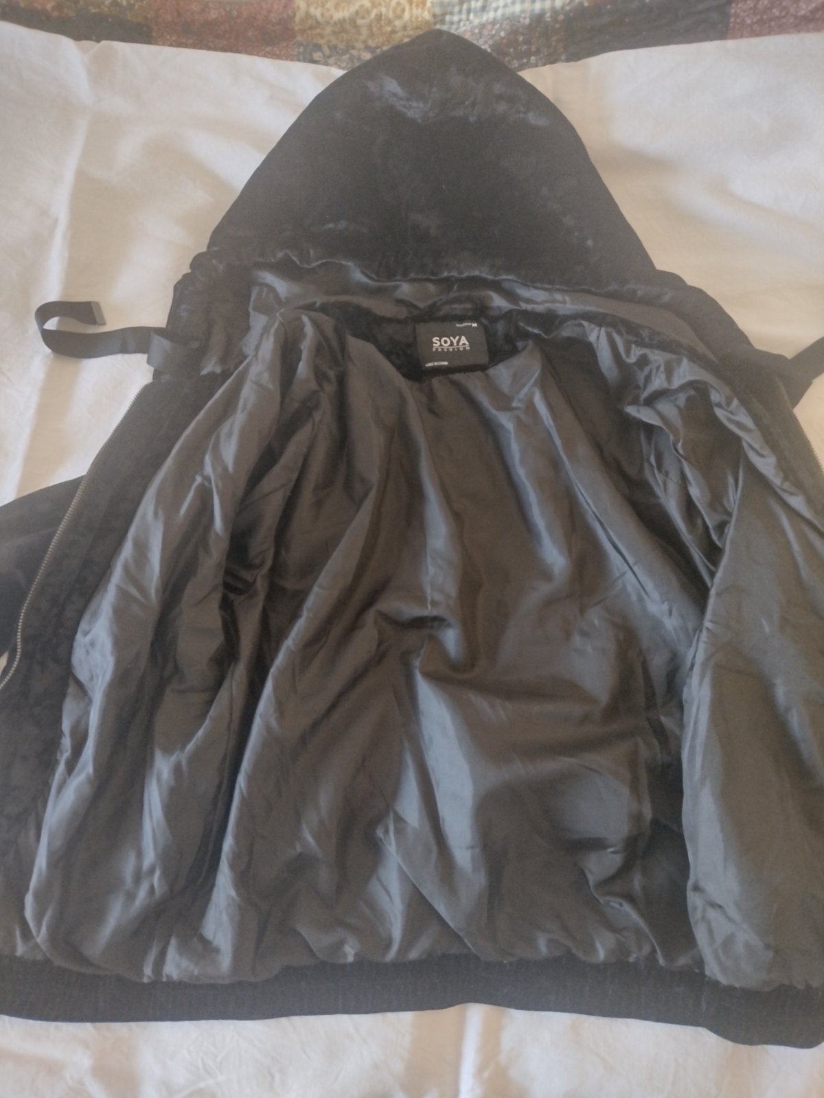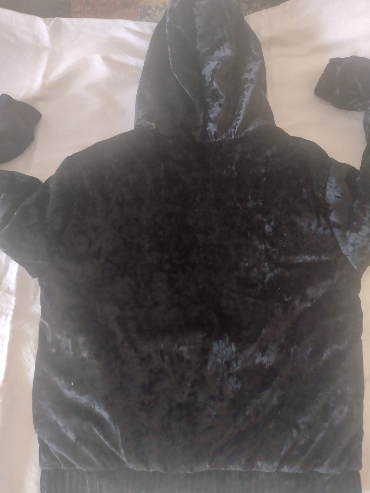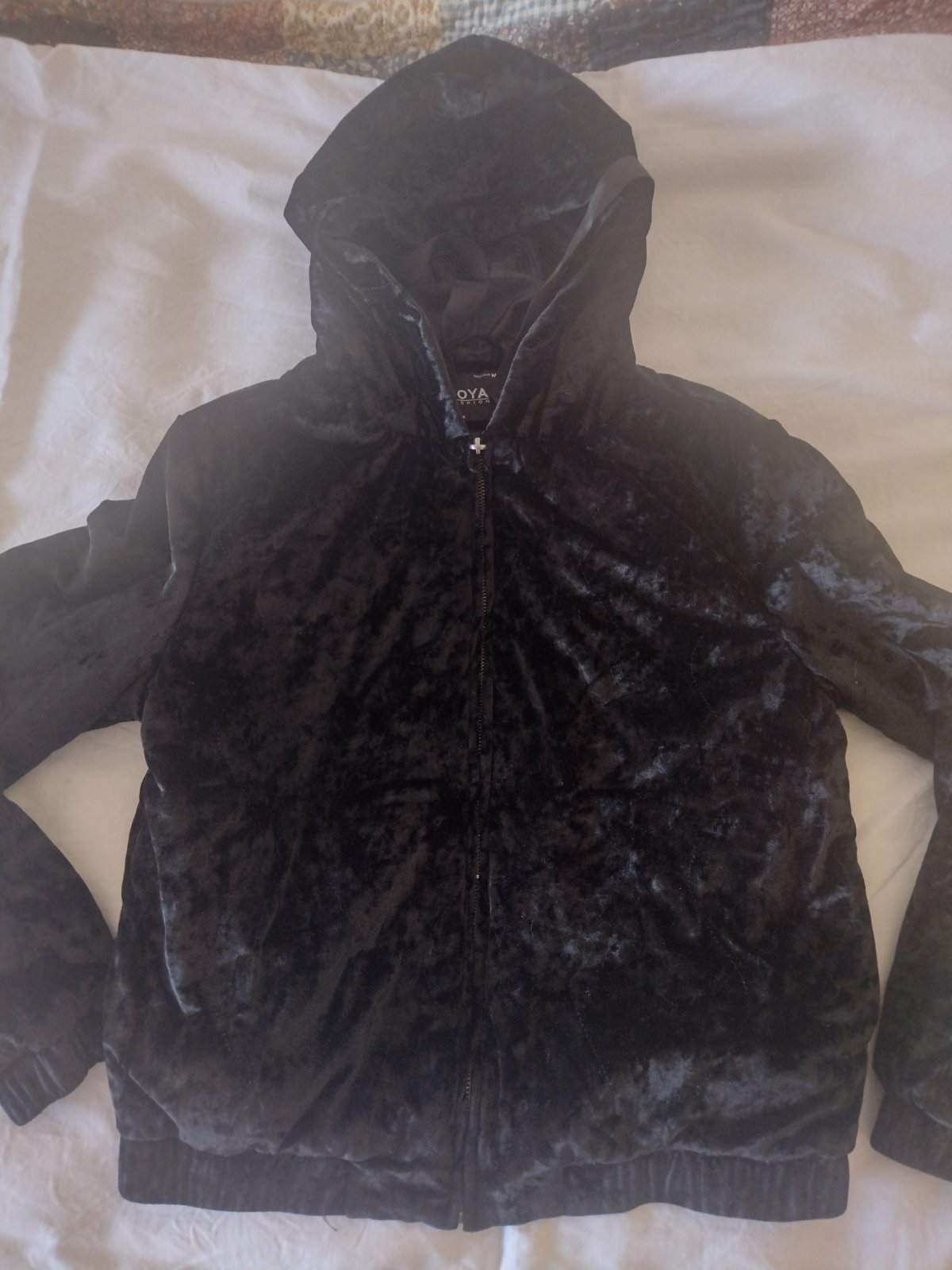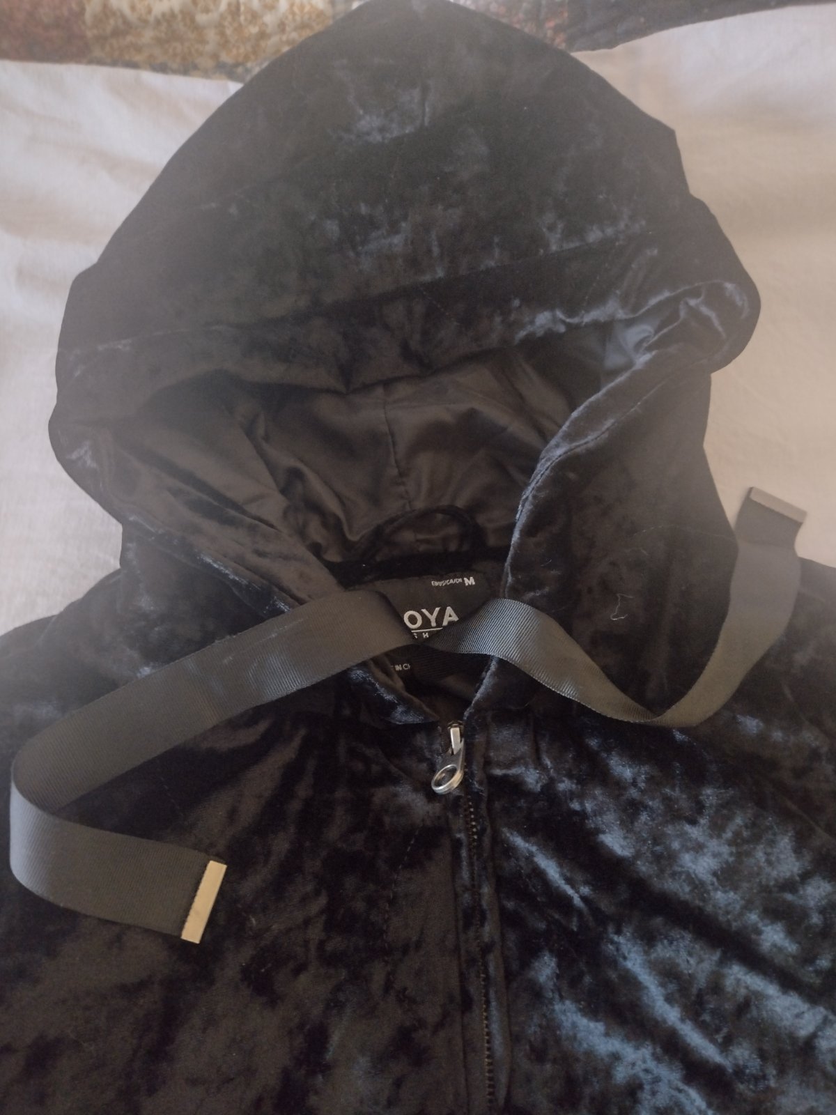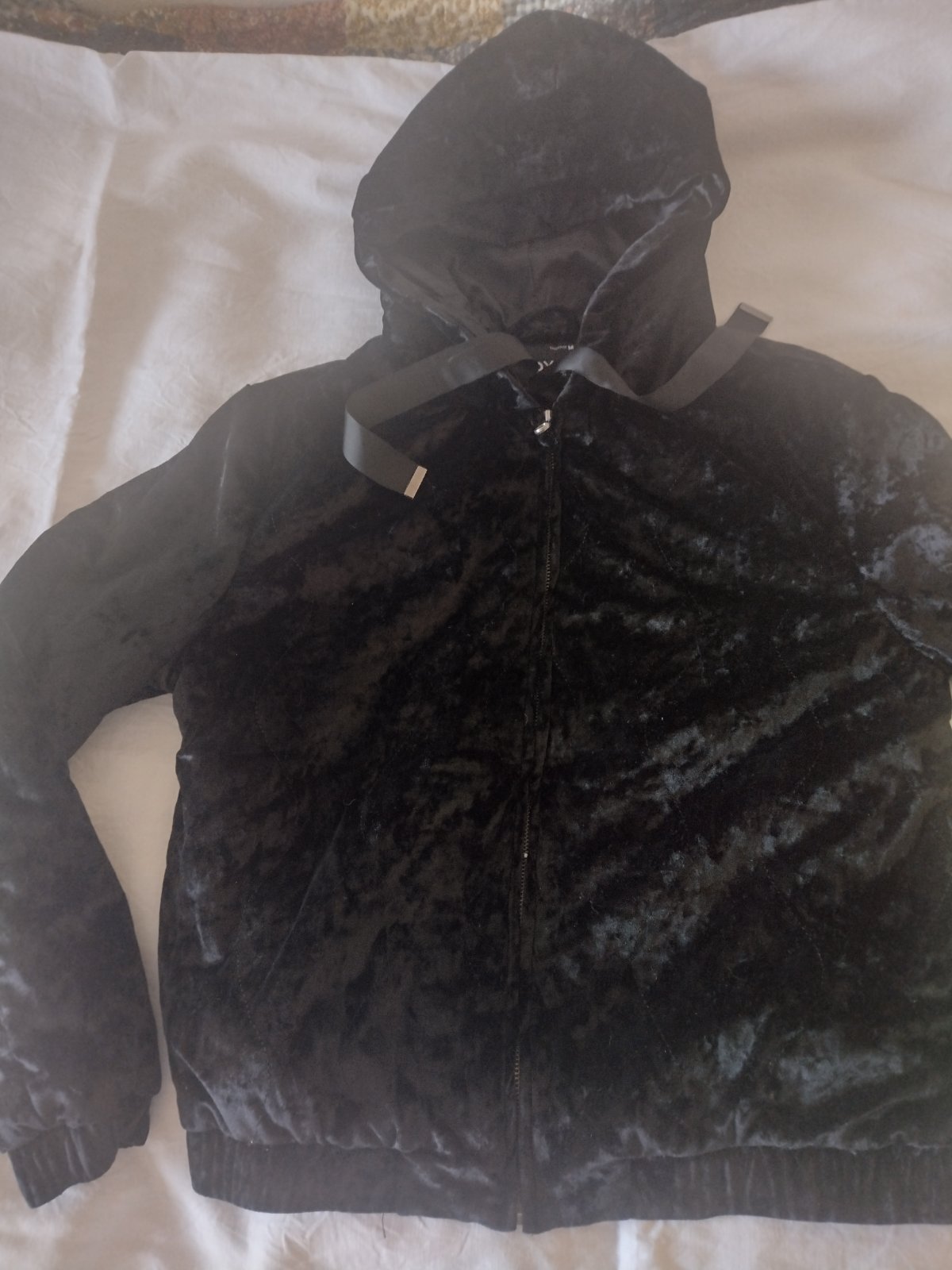 Predám čiernu málo nosenú prechodnú bundu-mikinu veľkosť M, dcéra nosila keď mala cca 164 CM. Je z jemného zamatu, jemne futrovaná podšitá podšívkou. Taký ,,myší kožúšok,,. Je čierna, mne zle fotí mobil. Má bočné vrecká, kapucňa sa dá stiahnuť stužkou. Rozmery: dl. od ramena pri kapucňou merané 59 CM, šírka pod pazuchami 52x2 CM, šírka dole patent 46x2 v kľude, je tam guma, trochu sa natiahne. Rukáv od kapucne 71, od pazuchou 44 CM.