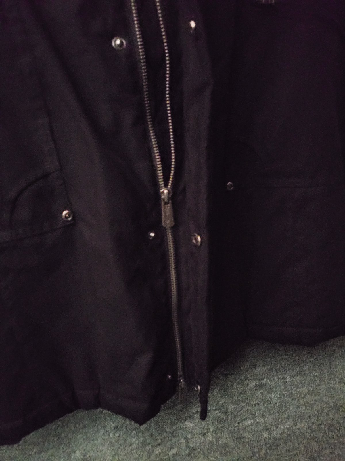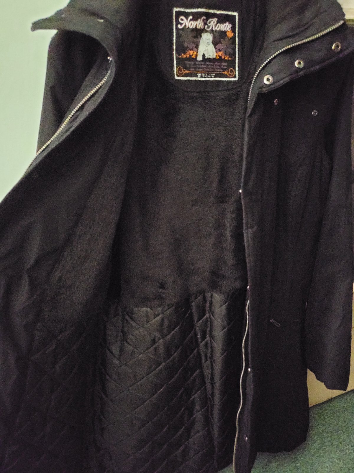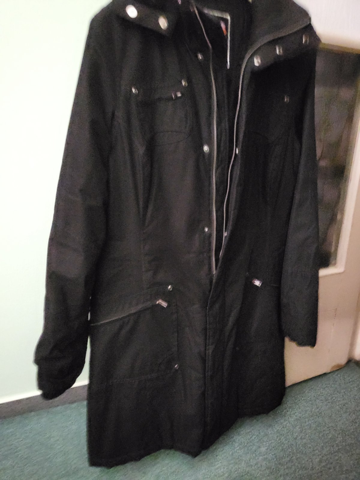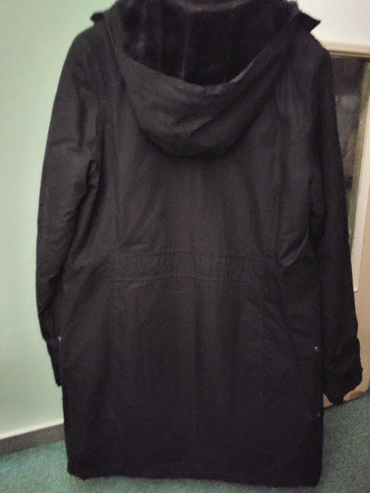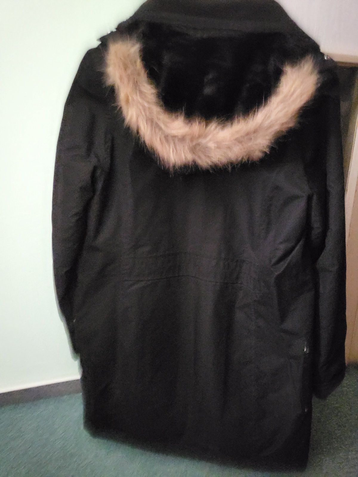 Predám sýto čierny kvalitný teplý kabát s úpletom na rukávoch, obojstranným zipsom, vnútorným vreckom, futrovaný mäkkou umelou kožušinou, s odnímateľnou kapucňou aj kožušinou na nej.