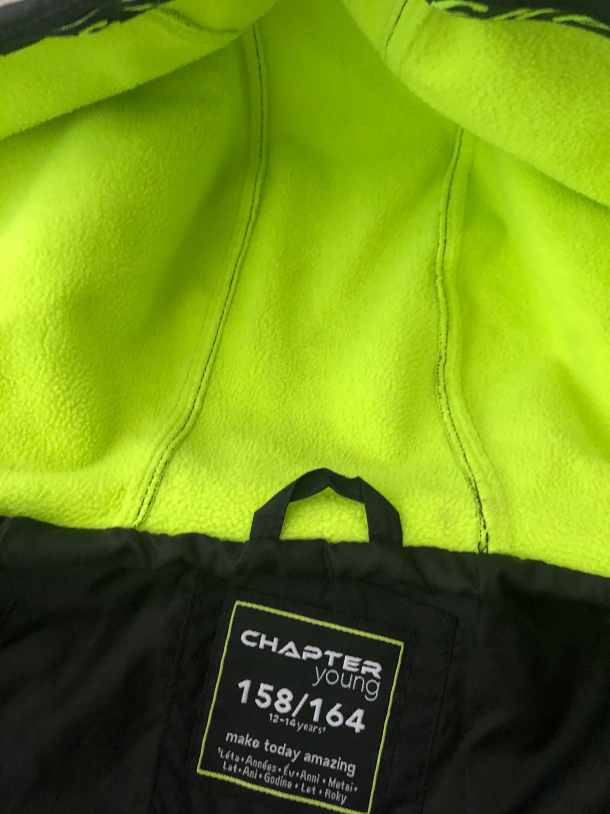 Oblecena mozno raz, bez jedinej chybicky. He to kvalitna softshel bundicka, neomovo zelena zateolena kapucny. Nepremokava a na prednom a zadnom paneli zaplena. Uvedena velkost 12-14 rokov, na vysku 158-164cm.