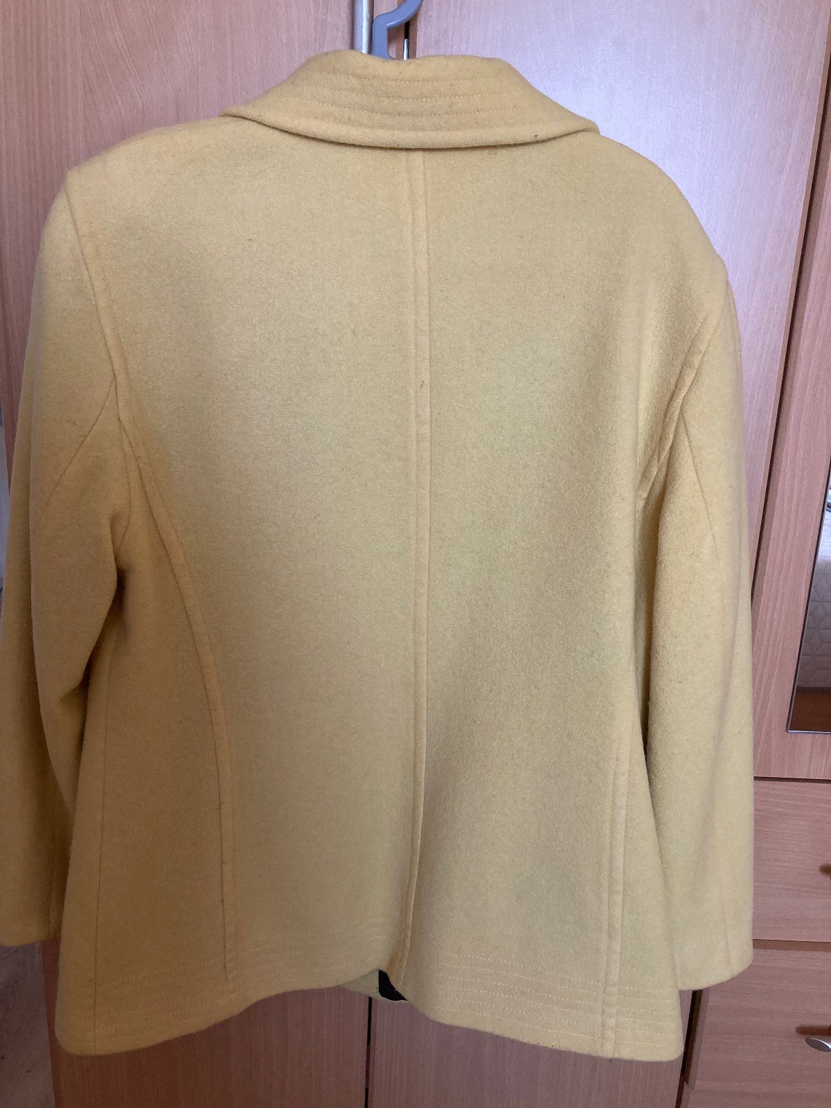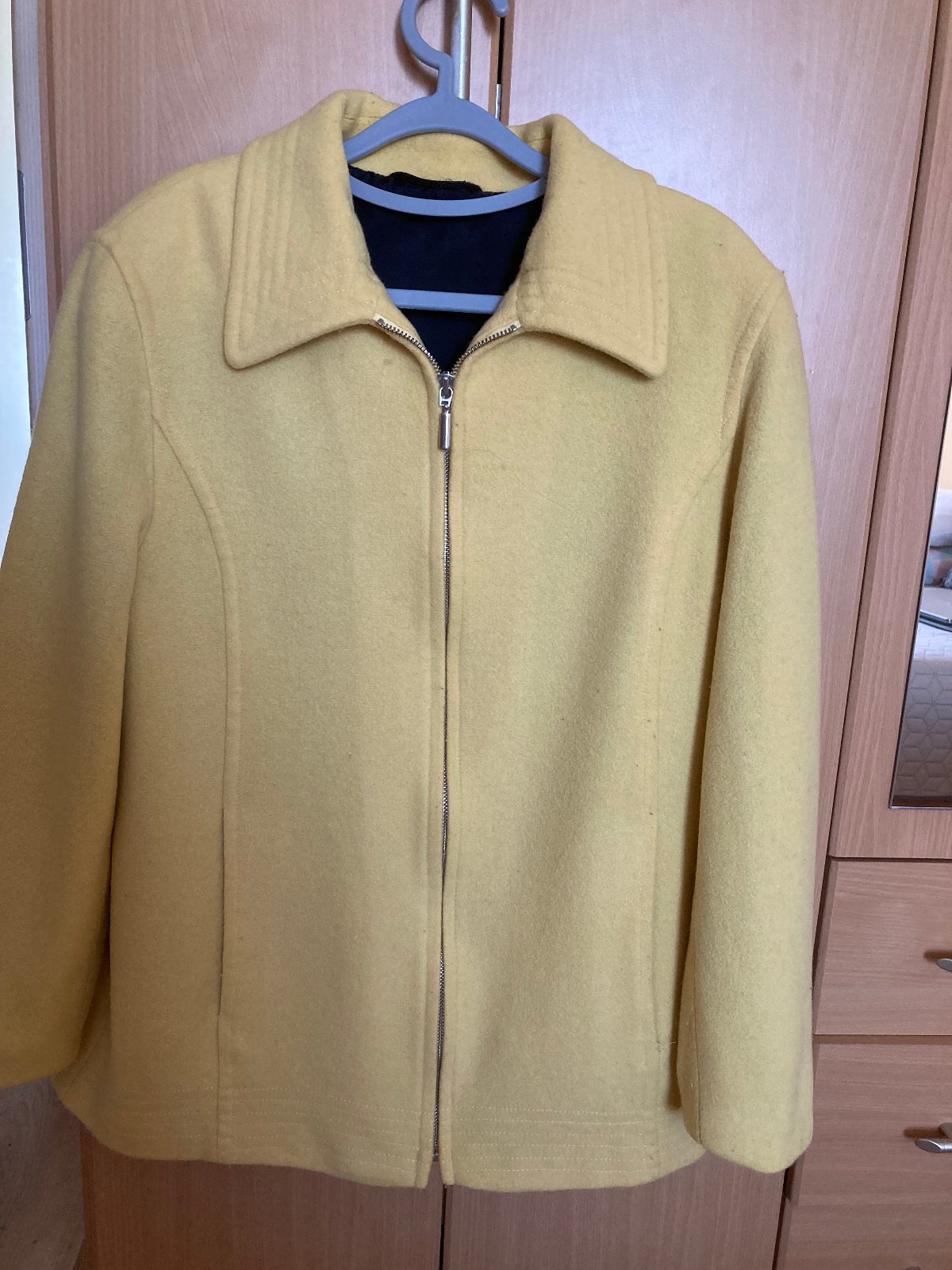 Predám dámske sako-kabátik vel. L -XL, dĺžka 55 cm zadný diel, šírka 54 cm, 3/4 rukáv 45 cm , látka s podielom lanu, celé podšité , 2 vrecká , pekná žltá farba , 2x oblečené, top stav + poštovné. N...
