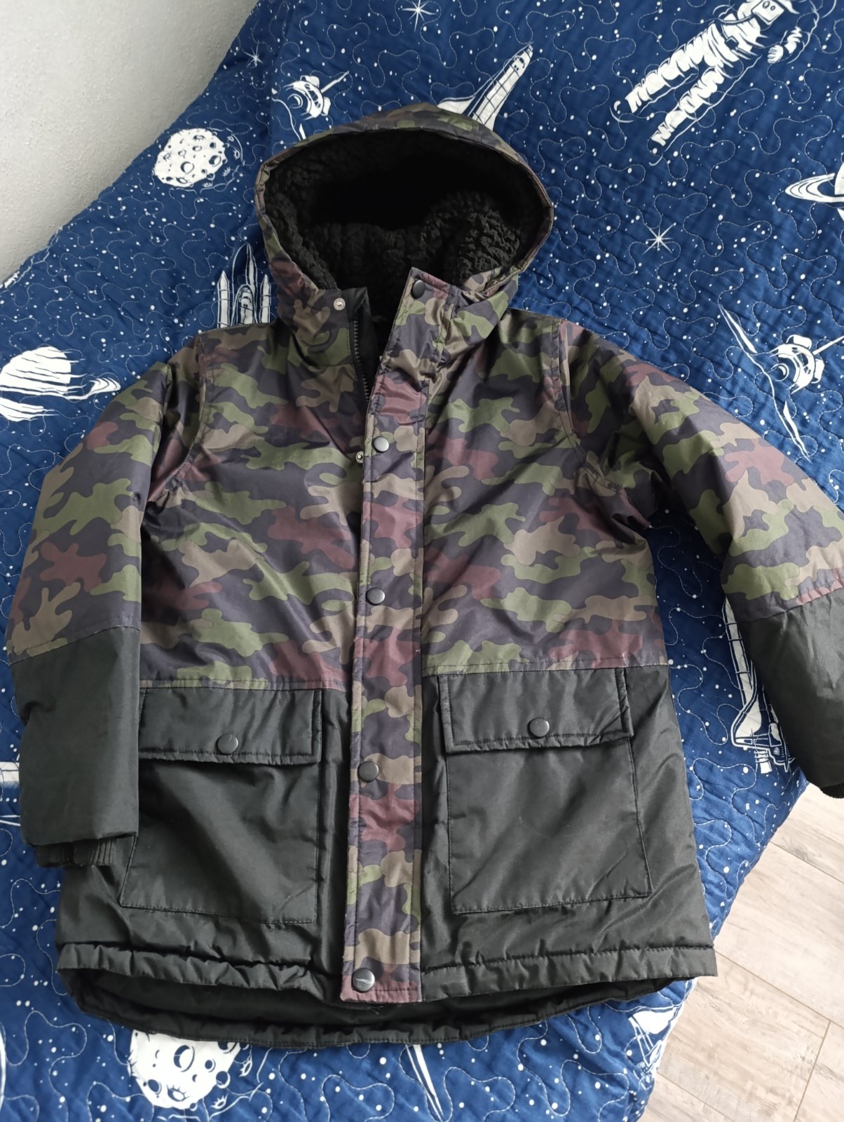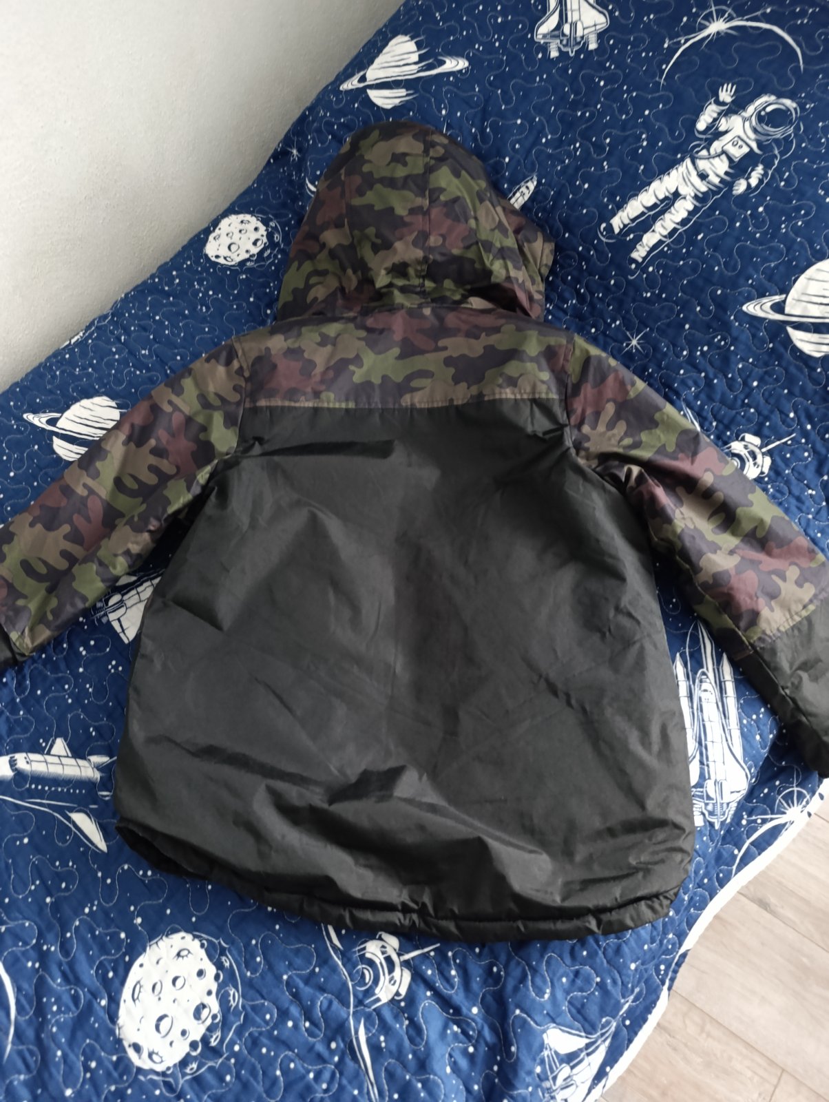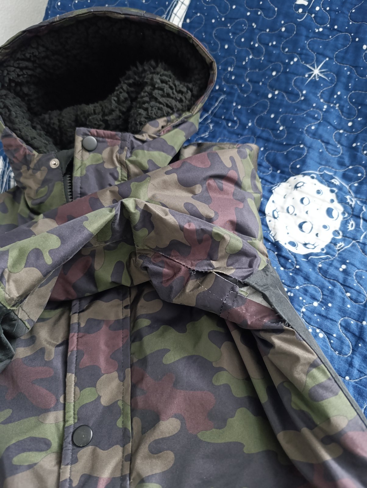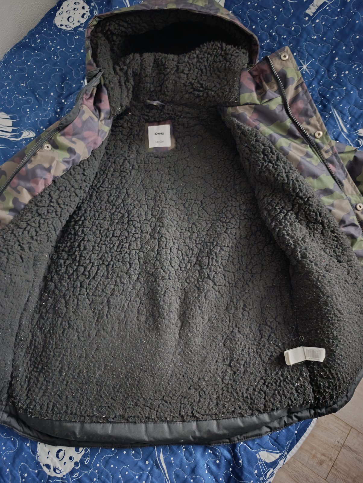 Super bunda na zimu aj tepla, bola naša obľúbená pretože je dlhšia (zakryje pekne chrbát), látka ľahko nepretecie, vnútri je je kožusinka okrem rukávov. Len už má nejaké tie poškodenia viď roztrhnutie a nejaké menšie zatrhnutie. Cena 8 euro