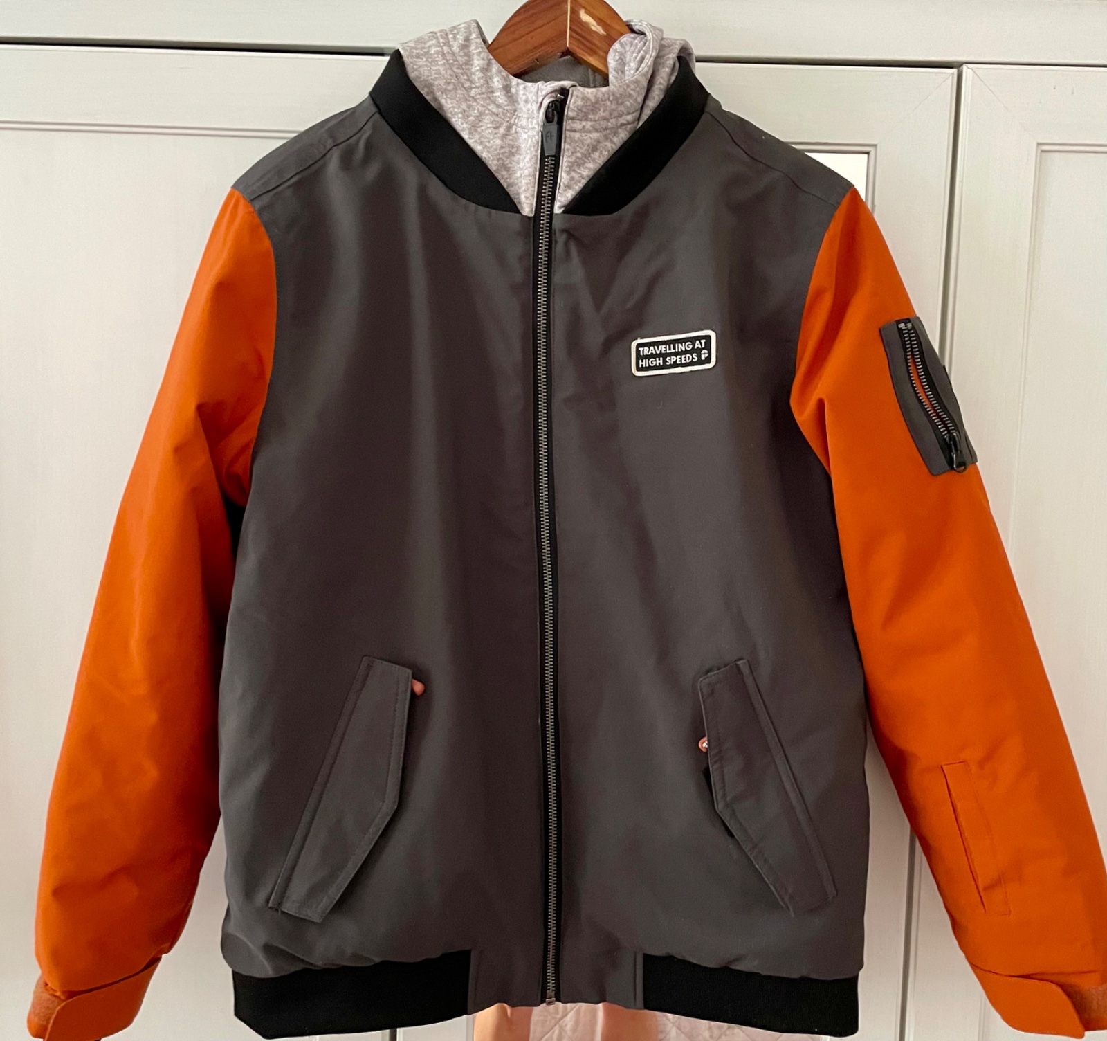 Nepremokavá, vetruvzdorná, zateplená vetrovka. Tri vrecká na zips. Kapucňa sa dá zrolovať do goliera. Nepoškodená, super stav. Veľkosť je chlapčenské M, na ccá 13 rokov