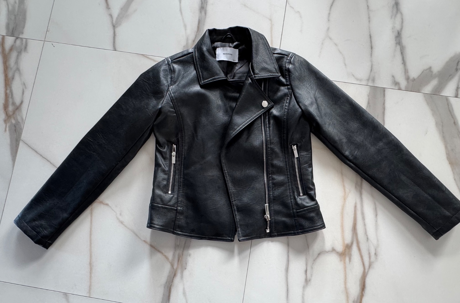 Klasická koženková bunda motorkárskeho štýlu Celopodšitá, zapínanie na zips Dve funkčné vrecká na zips Zn.Reserved, vel.140 Celková dĺžka 41cm Šírka cez pazušky 2x41cm Šírka cez bruško 2x38cm Ru...