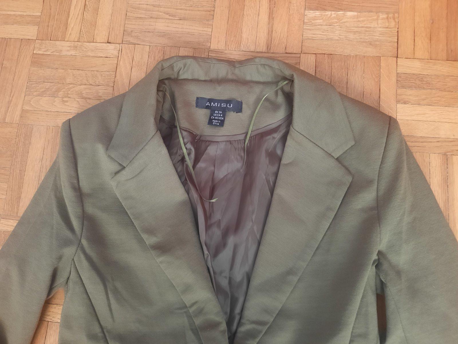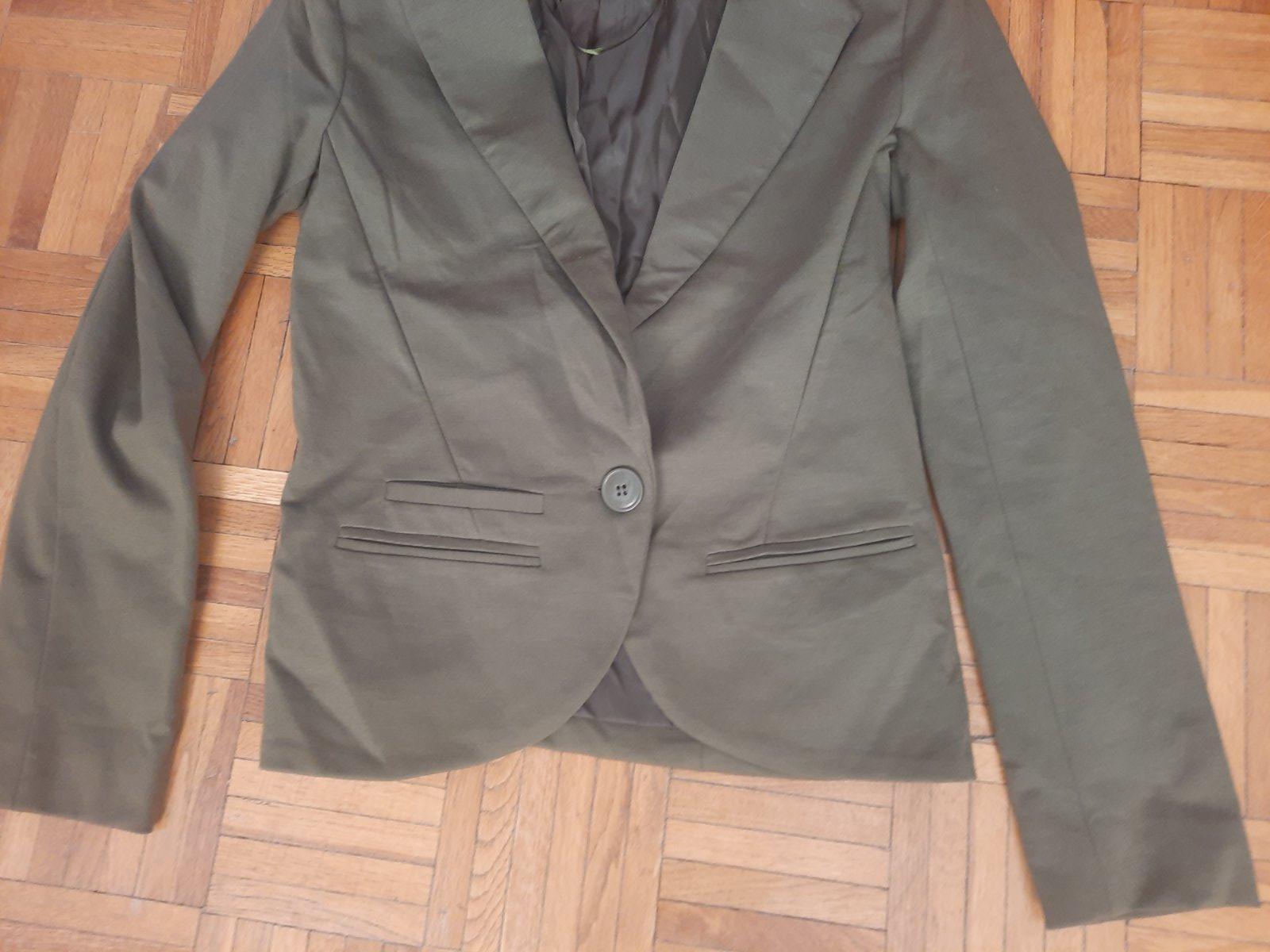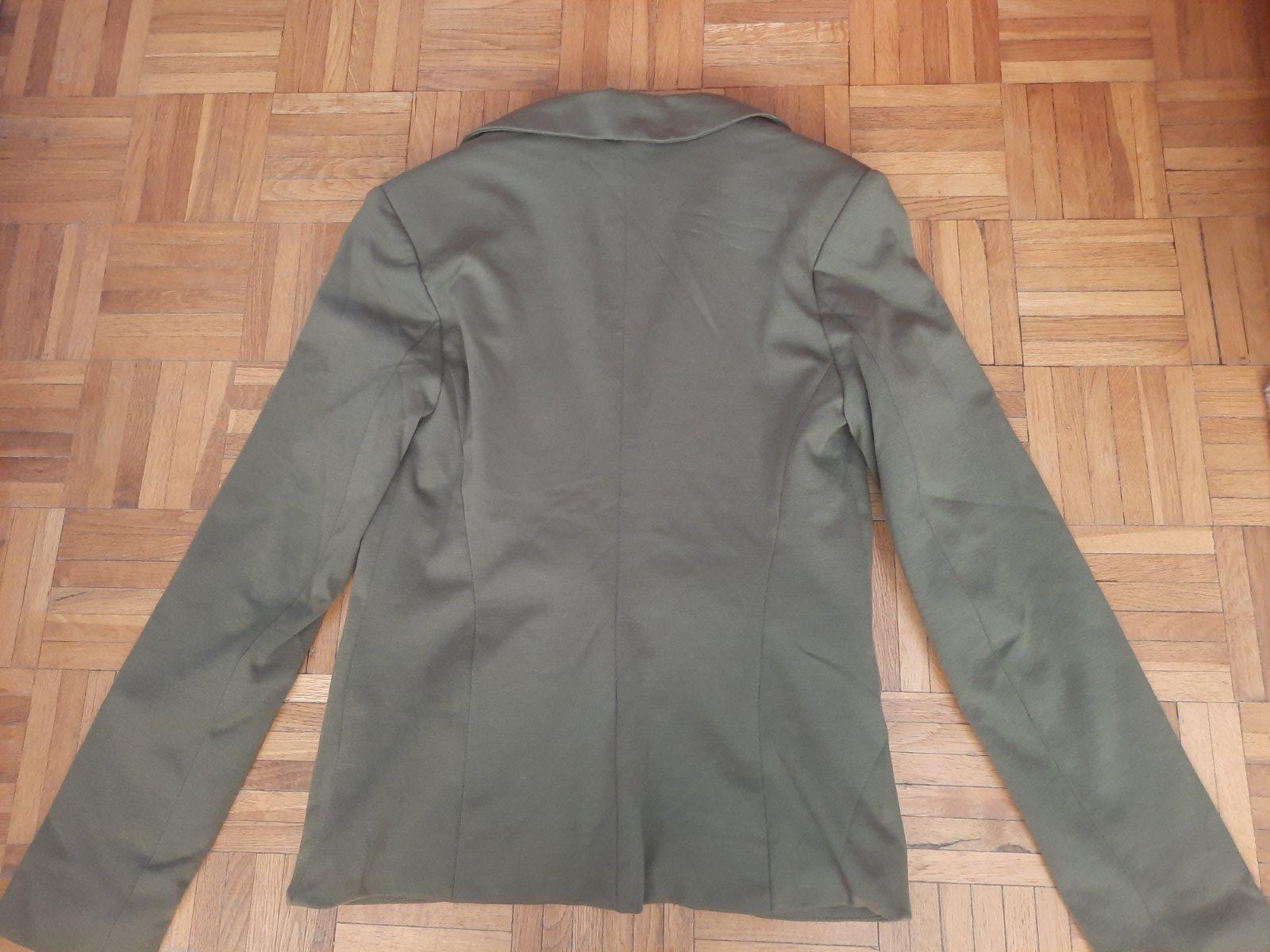 Krásne dámske sako vojenskej zelenej farby. Super aj na leto na chladnejšie večere, je prechodné, podšité. Spodný vačok je funkčný, vrchný iba ozdobný. Je v top stave, oblečené iba 1x.