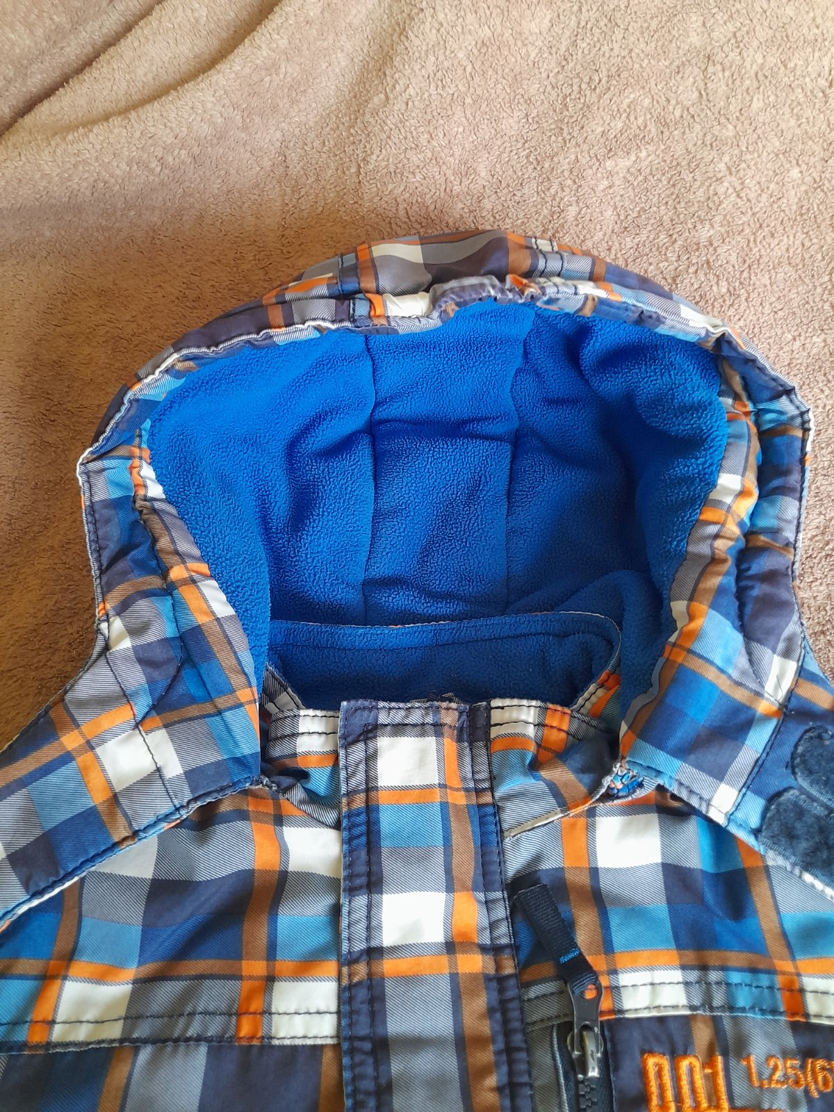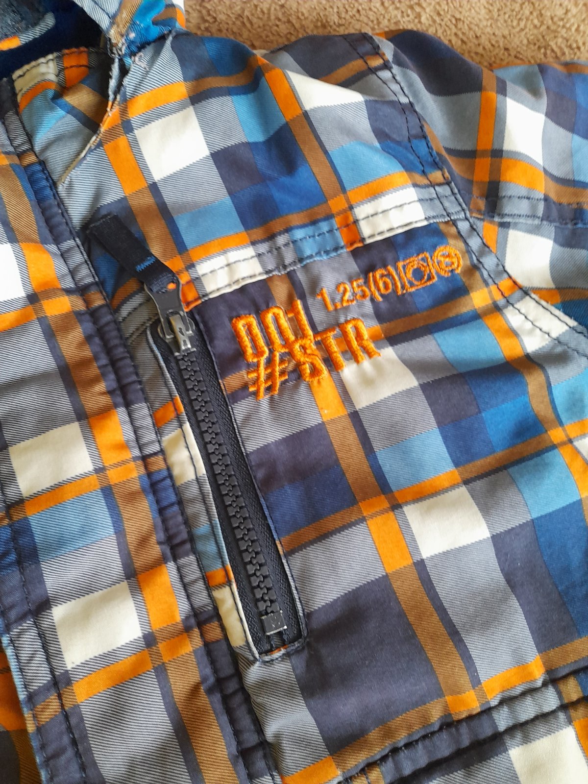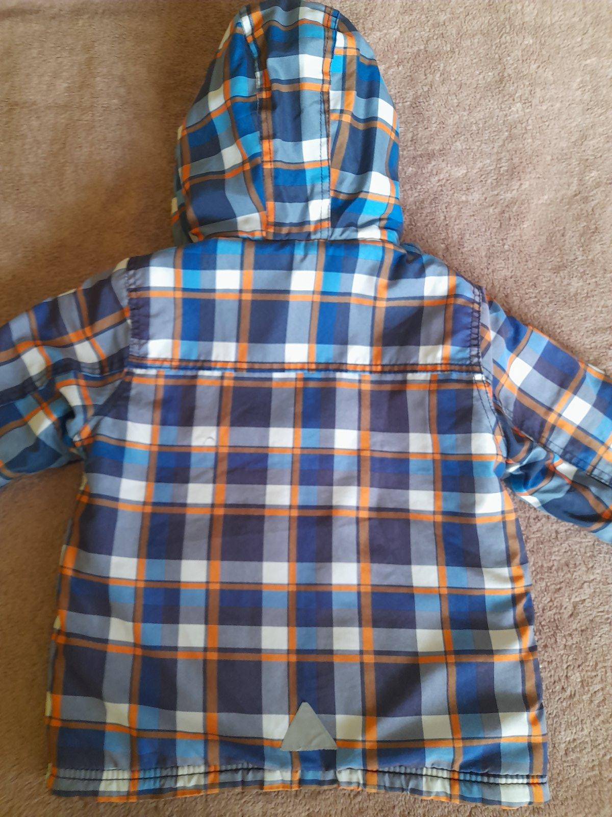 Zachovala bundicka na zimu, skor hrubsia, dost tepla. Farba modro-oranzovo-biele karo. Kapucna na pevno. Zips funguje. Male oderky na koncoch rukavov a trosku (3 cm) sa pare v mieste kde sa spaja kapucna s vetrovkou. To som si vsimla az teraz ked som vetrovku fotila. Inak je vetrovka bez flakov, dierok a inych poskodeni. Ale teda nosenie uz mierne vidiet.