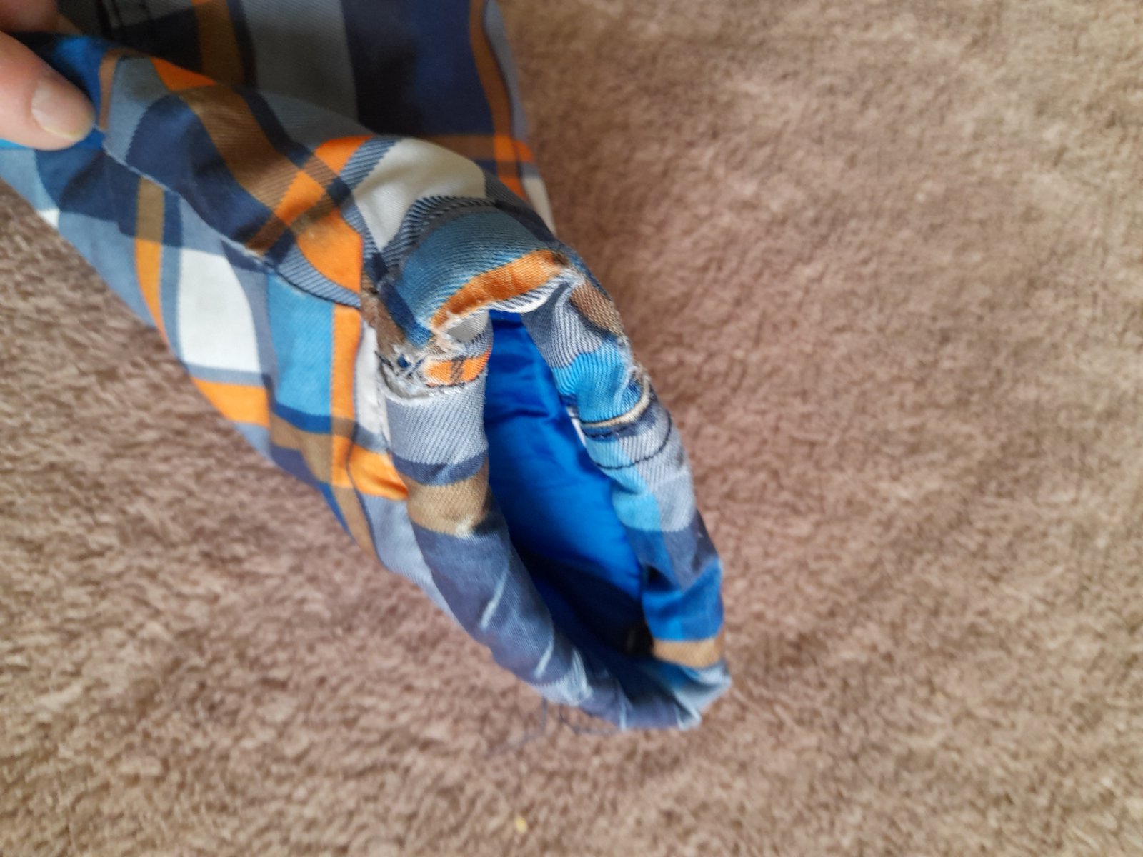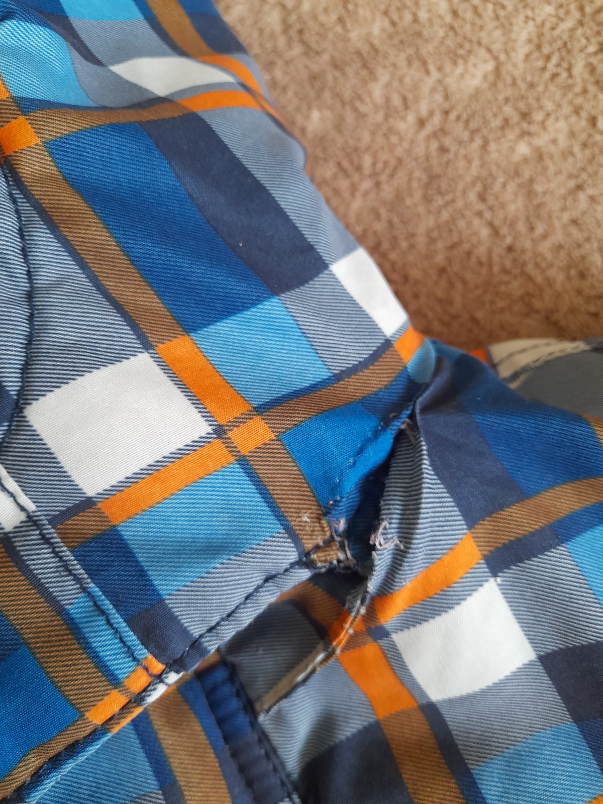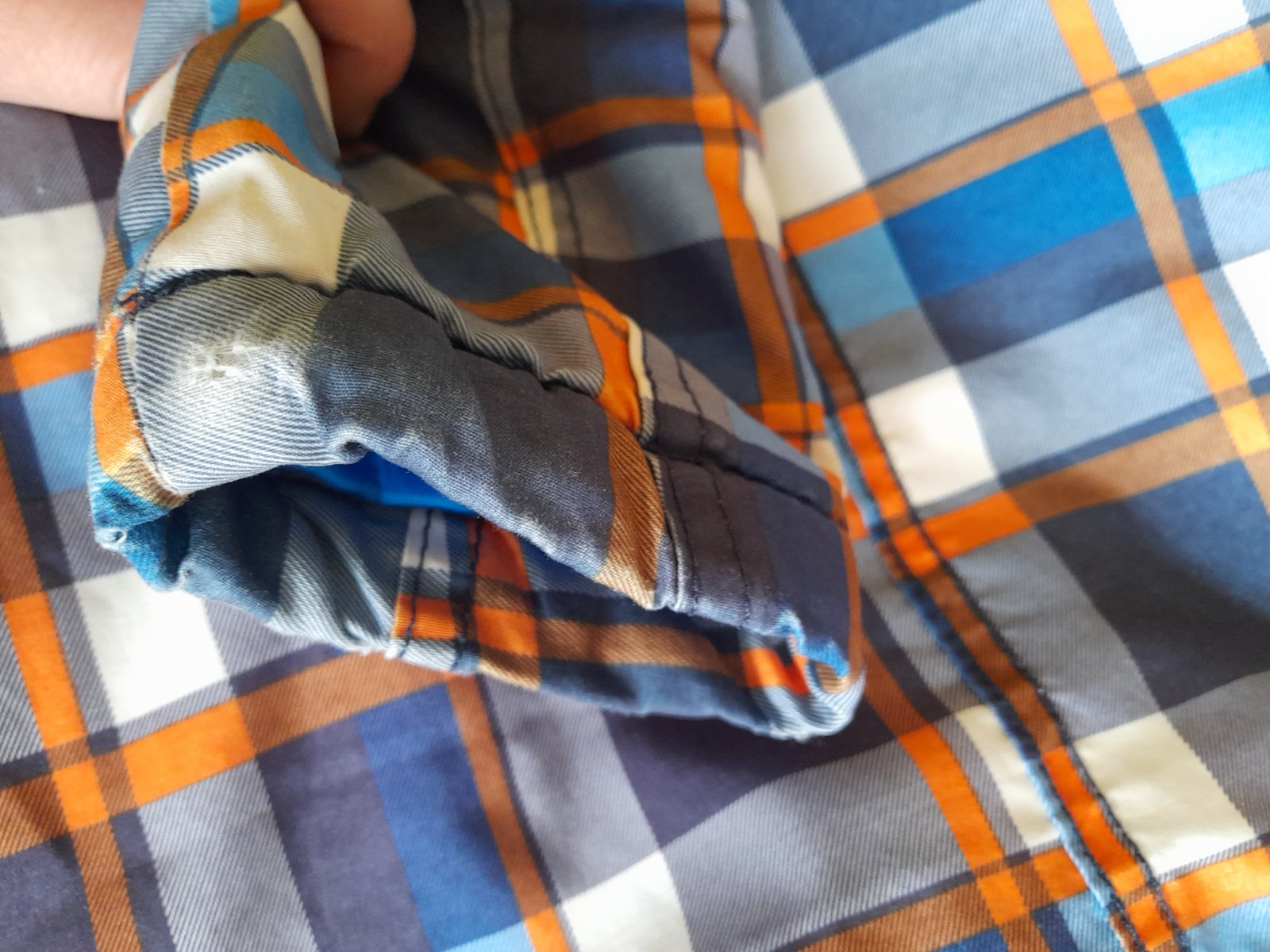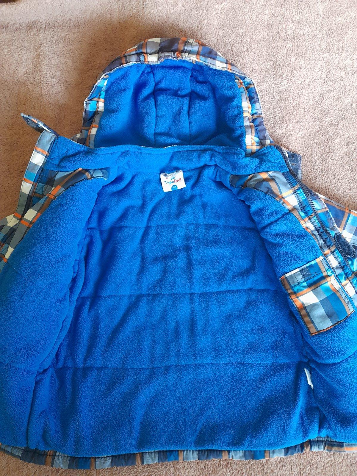 Zachovala bundicka na zimu, skor hrubsia, dost tepla. Farba modro-oranzovo-biele karo. Kapucna na pevno. Zips funguje. Male oderky na koncoch rukavov a trosku (3 cm) sa pare v mieste kde sa spaja kapucna s vetrovkou. To som si vsimla az teraz ked som vetrovku fotila. Inak je vetrovka bez flakov, dierok a inych poskodeni. Ale teda nosenie uz mierne vidiet.