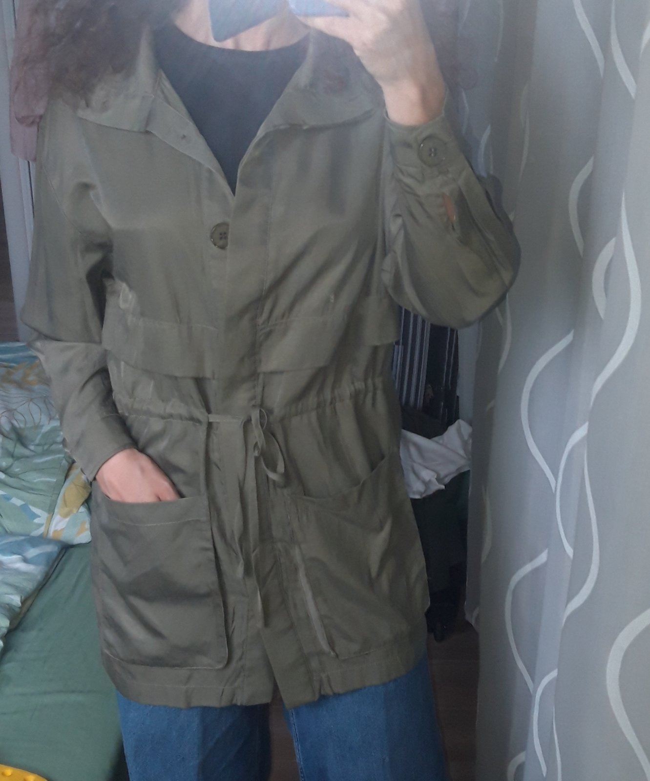 Posuniem ďalej túto olivovú bomberku. Veľmi príjemný materiál, idealna na chladnejšie letné dni. Veľkosť sedí. Bundička je bez poškodení