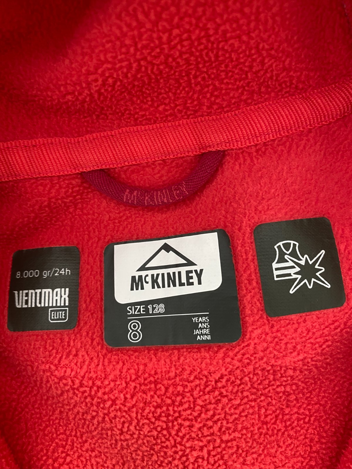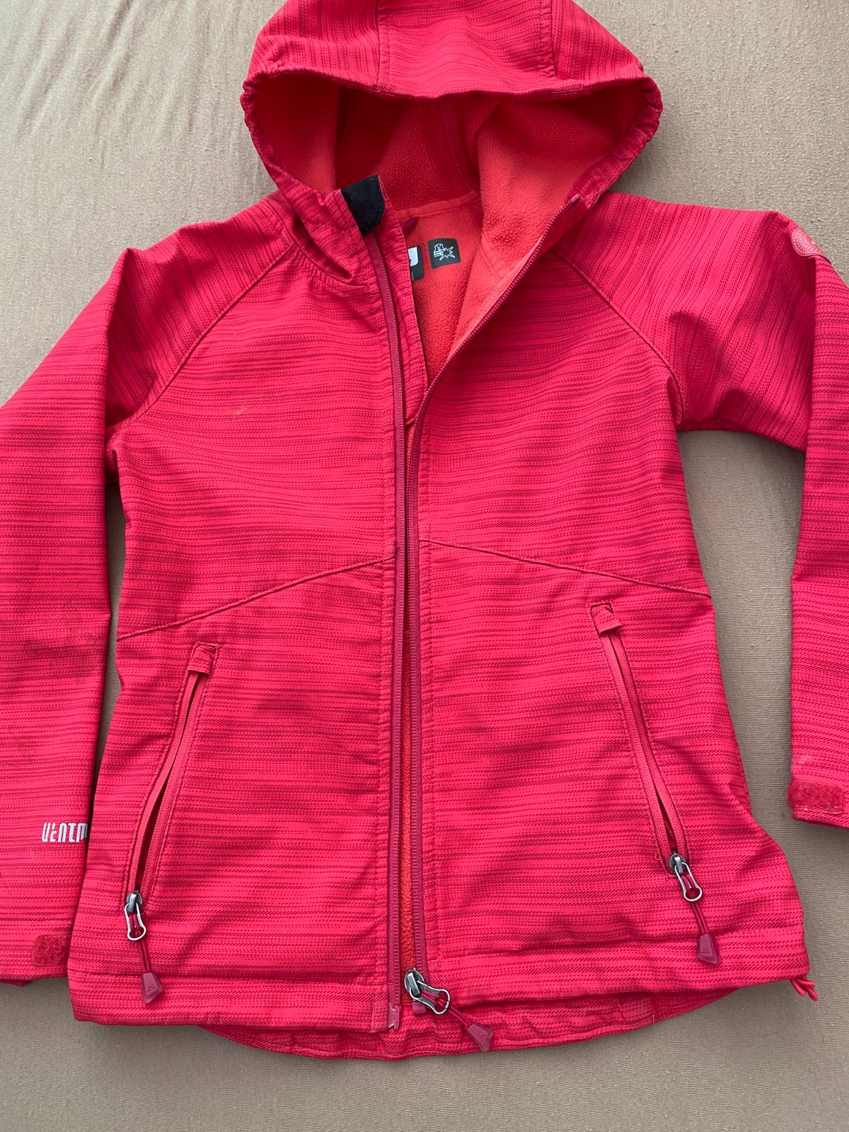 Detská sofshelová športová bundička McKinley sýtoružovej farby, s kapucňou, zapínanie na zips, dvomi vreckami tiež na zips, veľmi zachovalý stav. Miery: dĺžka vzadu 52cm, dĺžka rukávov od pazuchy 39cm, šírka od pazuchy po pazuchu 39cm.