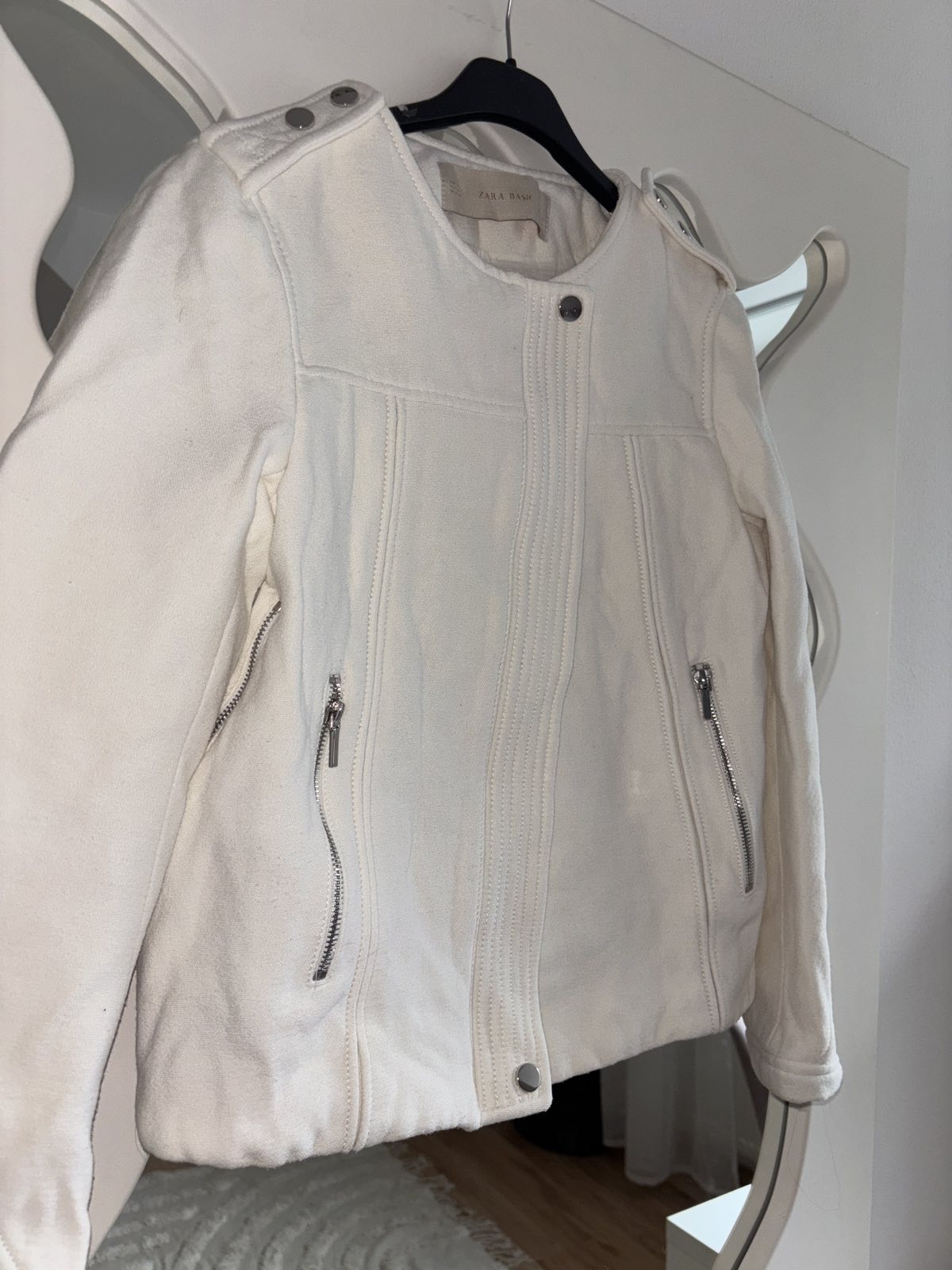 raz na sebe,je mi veľká,prechodná,biela s nádychom do krémová,strieborné detaily,veľkosť S,sedí aj na M,š.pod pažami 48 cm,d.56 cm