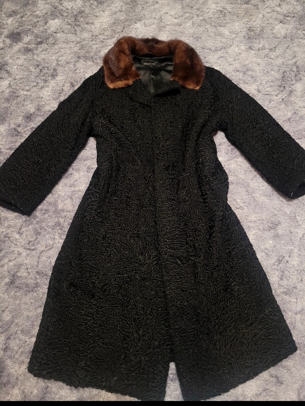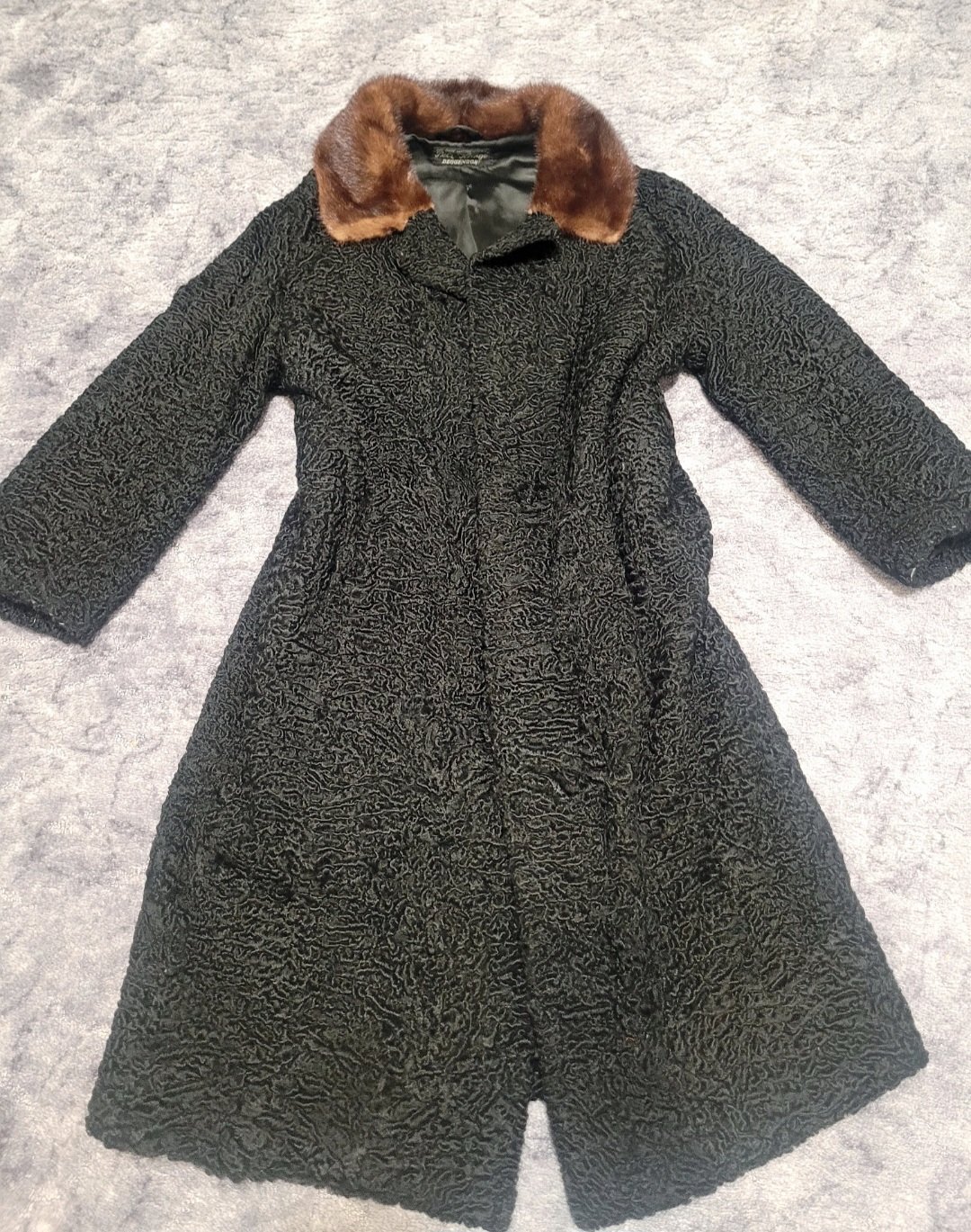 Predám vintage dámsky kožuch z pravej persianskej jahňaciny (karakul), ručne vyrobený v dielni „Das Gute Maßgeschäft Deggendorf“ v Nemecku. Kožuch má typický krčený, lesklý vlas, je dlhší (cca po kolená) a doplnený výrazným hnedým golierom z jemnej kožušiny (pravdepodobne norok alebo nutria). Zapínanie je skryté, na kovové háčiky, kabát má dve bočné vrecká. Veľkostne sadne na postavu L, rada premeriam.. Kožušina je zachovalá, bez dier a lysín; podšívka je čistá a pevná.