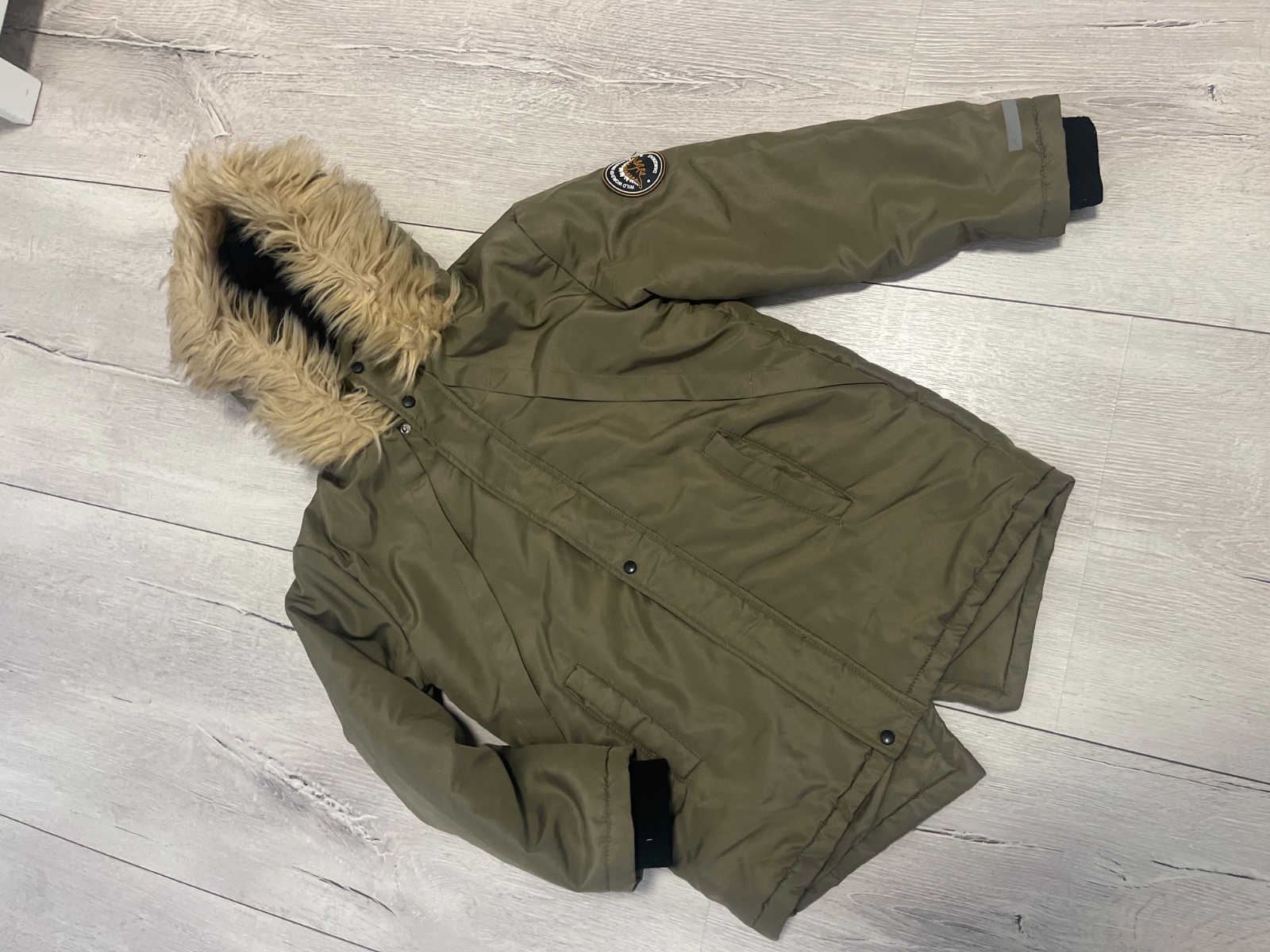 Predám teplú zimnú bundu značky Sinsay. Veľkosť : 134cm. Dĺžka rukávov od ramien 63cm Dĺžka : 63cm. Šírka : 46cm. Bunda je veľmi teplá, vhodná do tuhej zimy. Má kapucňu, pri krku sa dá zapnúť. V...
