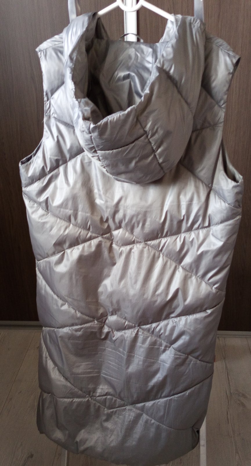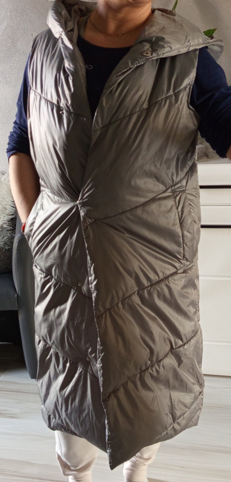 Dokonalá vesta, veľmi príjemná, veľ M, ale skôr odporúčam na L a vhodná aj na väcsie prsia, dĺžka meraná od krku je cca 105cm, šírka cez prsia až do 55cm, cez pás cca 56cm. Nosená, no žiadne poškodenie. Farba je medzi sedostriebornou a petrolejovou. PC 36,90€