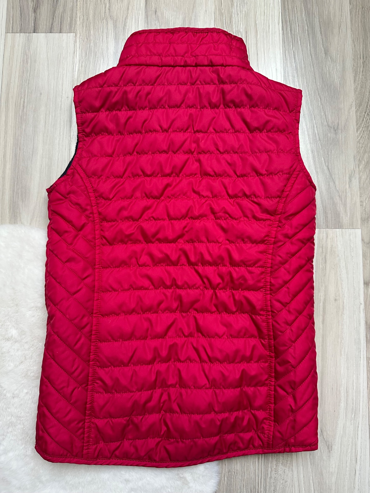 Krasna hunata tepla vesta, celkova dlzka je 43 cm a sirka je cca 36 cm...