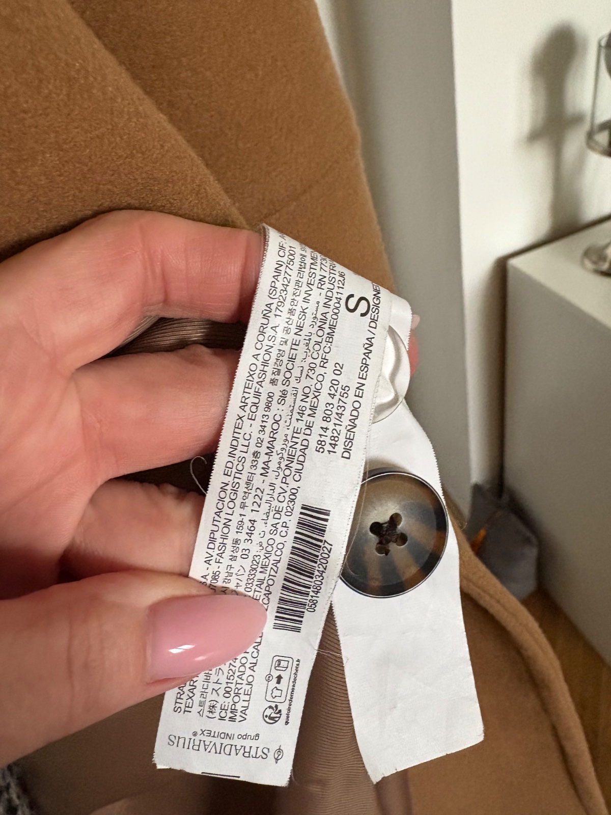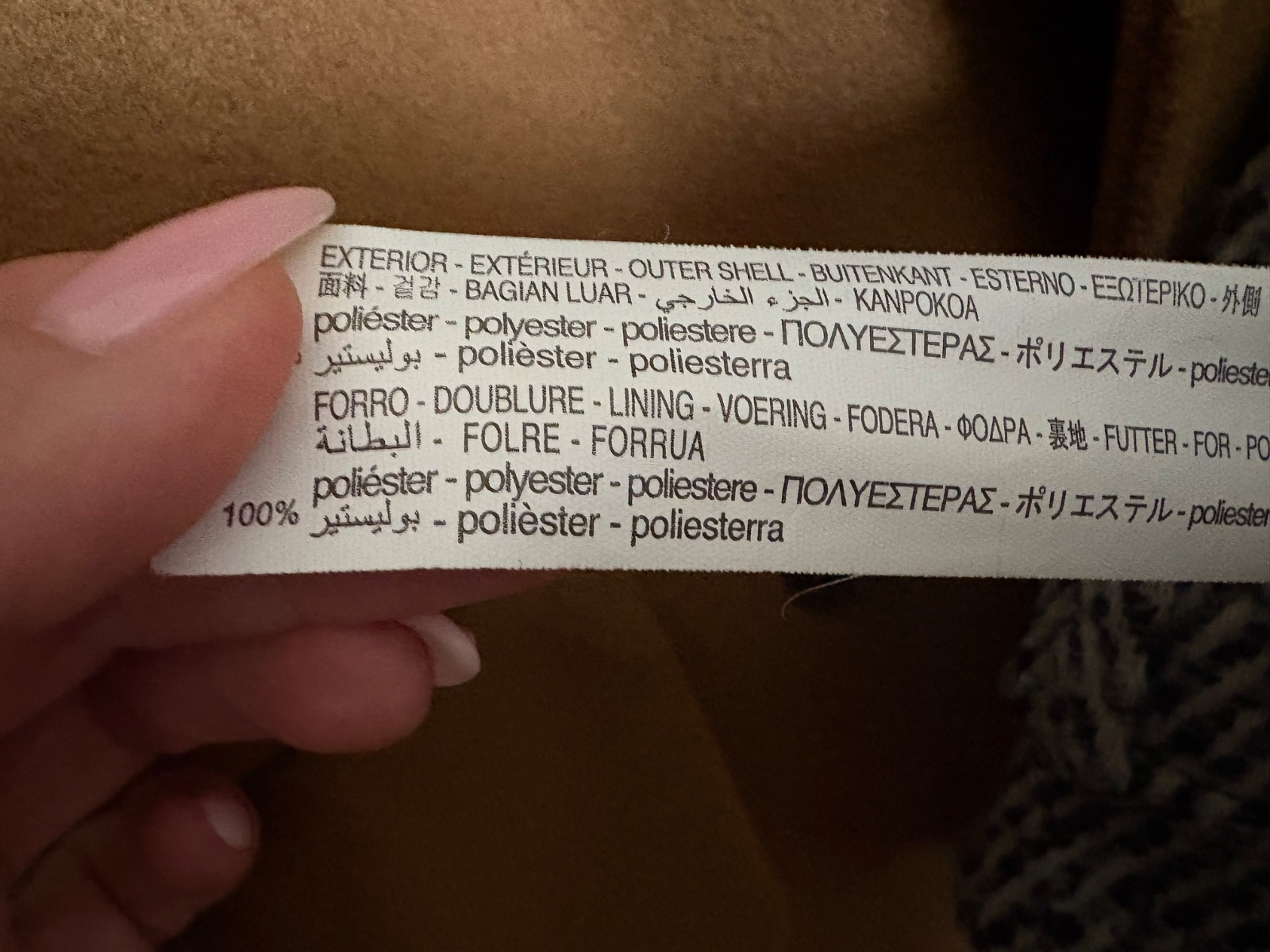 Hnedý kabát, imitácia brúsenej kože. Veľkosť písaná S (je UNI - S, M, L).